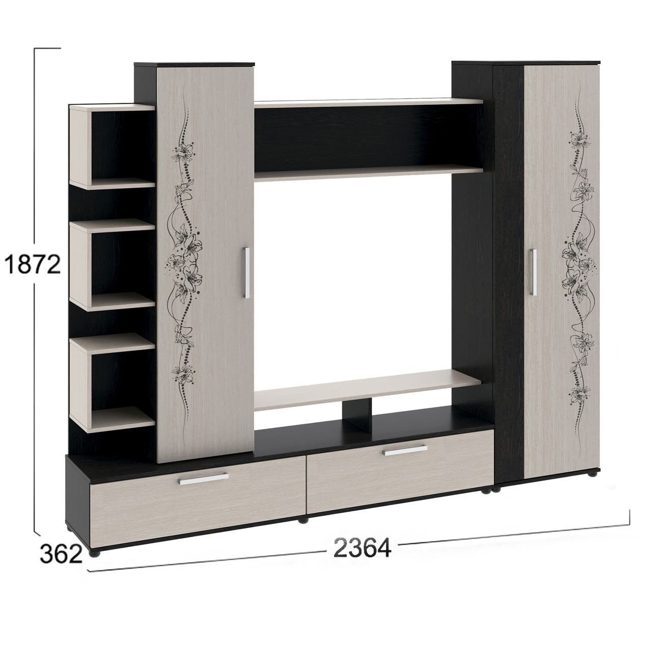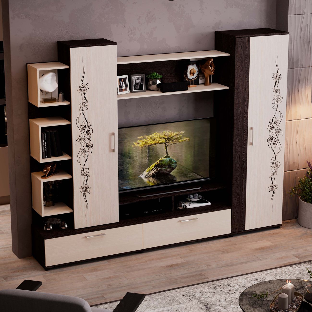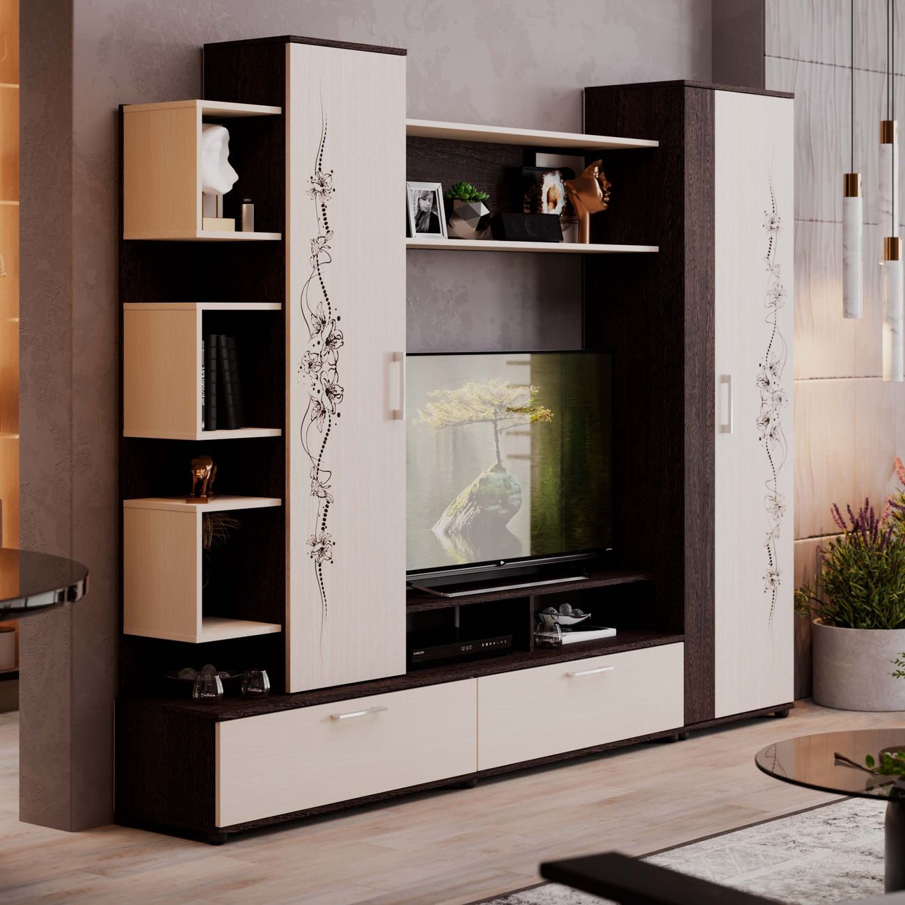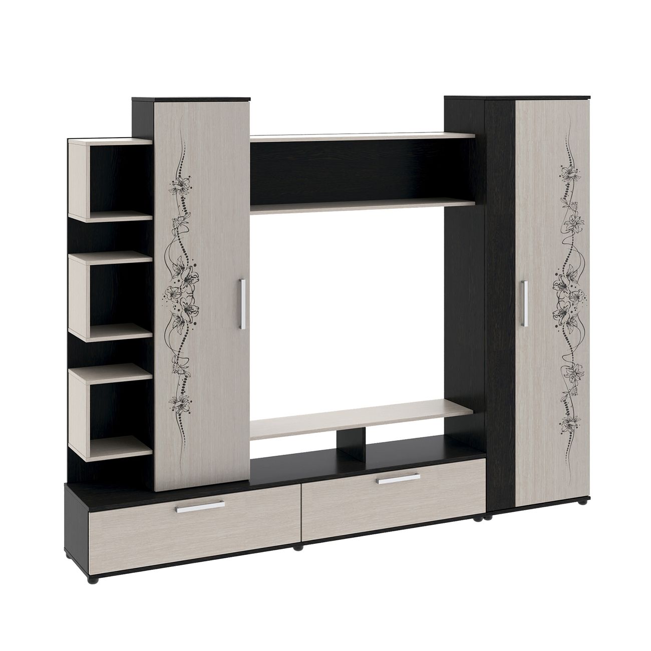 Стенка под ТВ является вместительной и позволяет организовать и сохранить пространство гостиной. Качественные материалы делают набор мебели для гостиной износостойким, способным прослужить многие годы - используется высококачественный безопасный ЛДСП - 16 мм. Данная модель мебели представляет собой качественной продукцией и экологически чистым изделием.