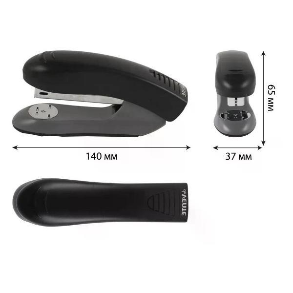 Степлер канцелярский незаменимый инструмент в офисе, учебном заведении и дома, который обеспечивает надежное скрепление документов, заметок и других бумажных материалов. Его компактный и эргономичный дизайн позволяет легко использовать степлер одной рукой, что делает его удобным в процессе работы. Современные модели степлеров могут скреплять до нескольких десятков листов за один раз, что значительно ускоряет выполнение задач, связанных с документацией. В нашем магазине доступны различные варианты степлеров. Кроме того, различные цвета и дизайны степлеров позволяют выбрать той, который лучше всего впишется в стиль рабочего пространства или станет ярким акцентом на столе. Степлер является не только практичным, но и эстетическим аксессуаром, который подчеркивает вашу организованность и заботу о деталях. Такой инструмент гарантирует, что важные документы всегда будут в порядке и готовыми к использованию, что особенно актуально в условиях динамичного рабочего процесса. Будь то небольшие заметки, отчеты или проекты, степлер станет верным помощником в создании аккуратного и структурированного документационного потока.Степлер, №24/6, 20 листов, корпус пластиковый, цвет черный, Everfine, 4142349. Торговая марка: Everfine; Страна: Китай; Упаковка: 12/48; Сертификат: 2063. Имеет два режима скрепления: постоянное и временное