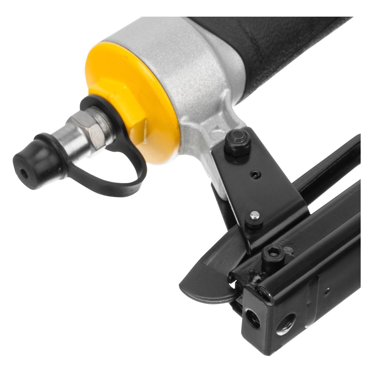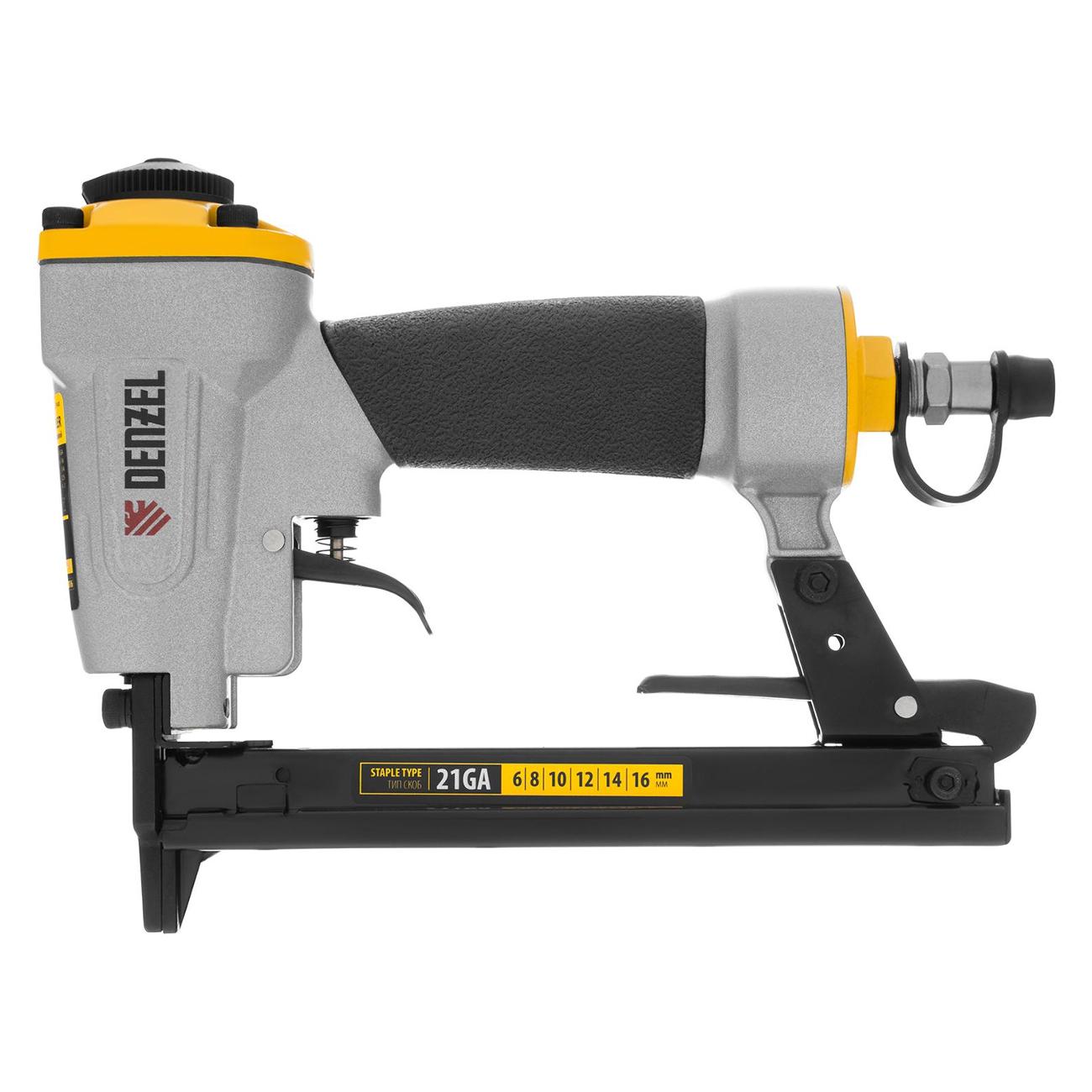 Нейлер-степлер Denzel PS8016 черного/серого цвета сделан из прочного алюминия, устойчивого к образованию коррозии. Вместимость магазина — 125 штук. Устройство совместимо со скобами 80/GA21 (размер — от 0,6 до 1,6 см). Габариты модели — 6х19х25 см. Вес изделия — 900 г. Давление — от 7 бар. В комплектацию входит масленка и набор ключей. Индикатор показывает наполненность магазина. Направление выпуска воздуха регулируется. Эргономичная ручка с прорезиненной поверхностью не скользит в ладони. Диаметр штуцера составляет 1,4".