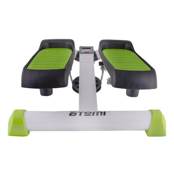Поворотный степпер Atemi AS1320M поставляется с эспандерами для тренировки рук. Корпус модели выполнен из пластика черного, белого и зеленого цвета с металлическим основанием. Устройство рассчитано на вес до 100 кг, а вес самого тренажера составляет 7 кг. Модель оснащена дисплеем, встроенным в корпус, который отображает количество пройденных шагов, время тренировки и количество сожженных калорий. Есть возможность регулировки нагрузки за счет гидравлической системы. Размер тренажера — 400х230х400 мм.