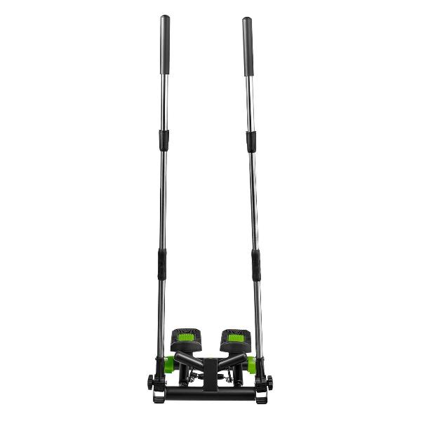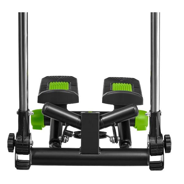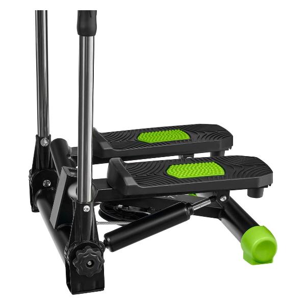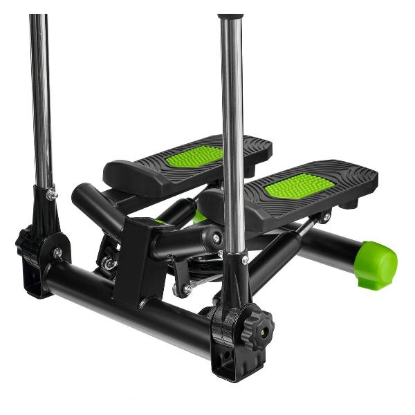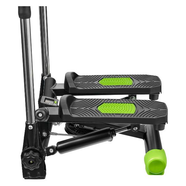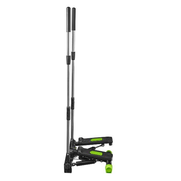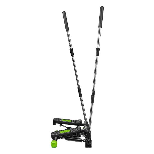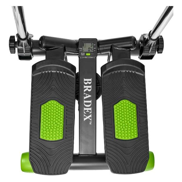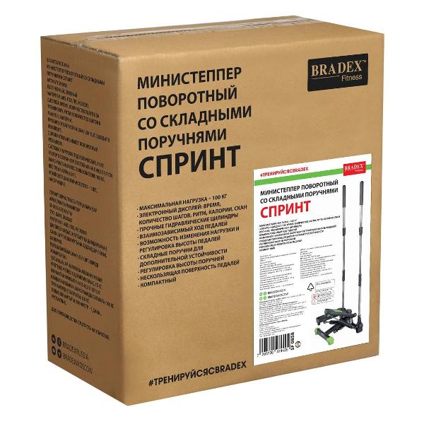 Степпер Bradex «Спринт» — тренажер поворотного типа с поручнями, позволяющими имитировать скандинавскую ходьбу. Модель оснащена системой нагружения с гидроцилиндрами и педалями с нескользящими поверхностями. Встроенный компьютер отслеживает показатели физической активности. На дисплей выводятся время тренировки, пройденное расстояние, количество сделанных шагов и потраченных калорий, частота пульса. Корпус, окрашенный в черный и зеленый цвета, сделан из металла и пластика. Размеры — 52х23,5х46 см, вес — 8,76 кг.