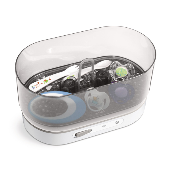 Для стерилизации детских бутылочек и аксессуаров используется водяной пар. Он уничтожает до 99,9% вредных микробов, при этом не используются химические вещества.