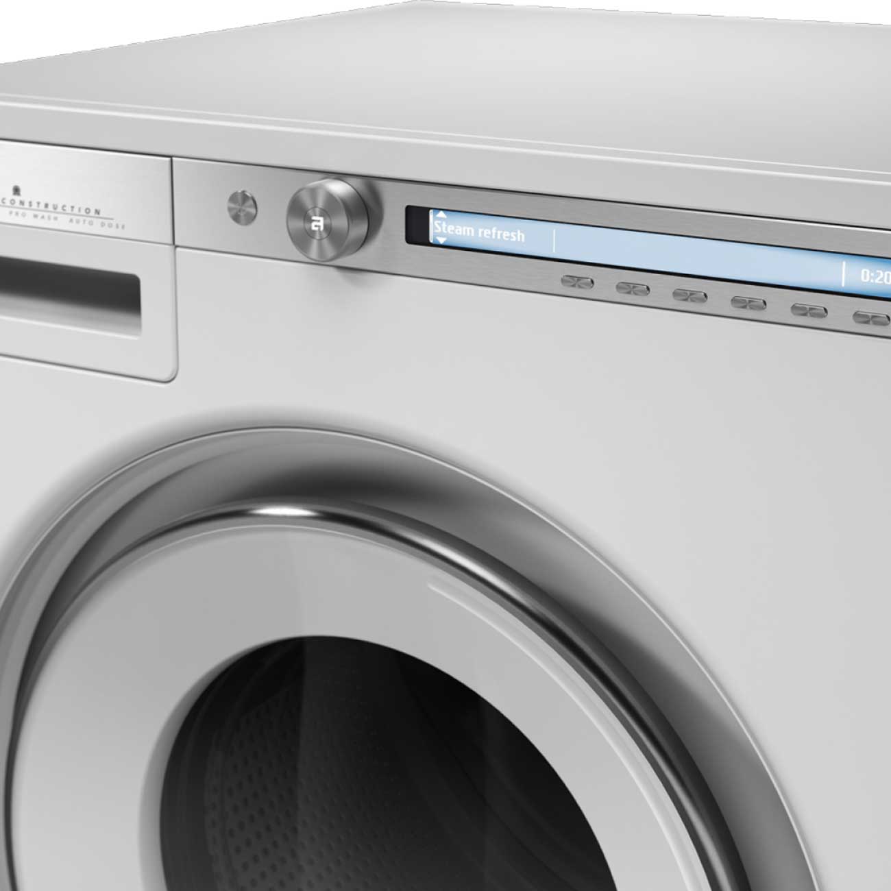 Скорость отжима не превышает 1600 оборотов в минуту. Управление осуществляется посредством электронной панели и механических переключателей. Вся информация о текущих настройках отображается на ЖК-дисплее. Есть индикация этапов программы и функция «Отложенный старт».