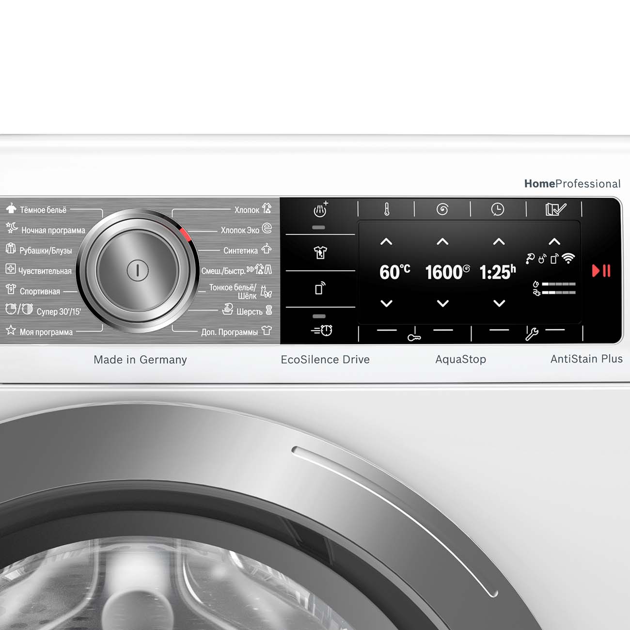 Стиральной машиной можно управлять не только обычным способом, но и дистанционно: со смартфона, установив приложение Home Connect. Вы удалённо запустите стирку, задав тип ткани и степень загрязнения, и получите уведомление об окончании цикла.