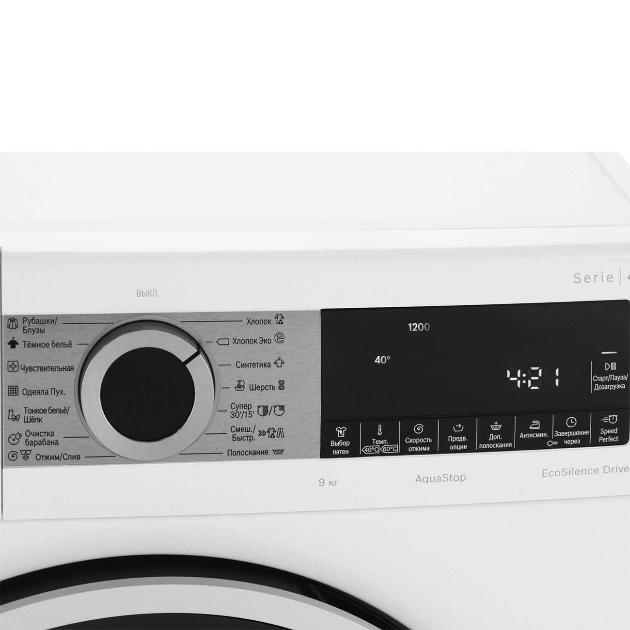 Стиральная машина Bosch Serie 4 WGA242X5OE вмещает до 9 кг белья. Диаметр люка 32 см, он открывается под углом 160°, так что даже объёмные вещи (постельные принадлежности, пледы, покрывала) вы загрузите и достанете легко и быстро. А высокая скорость отжима (до 1200 об/мин) позволит сократить продолжительность сушки.