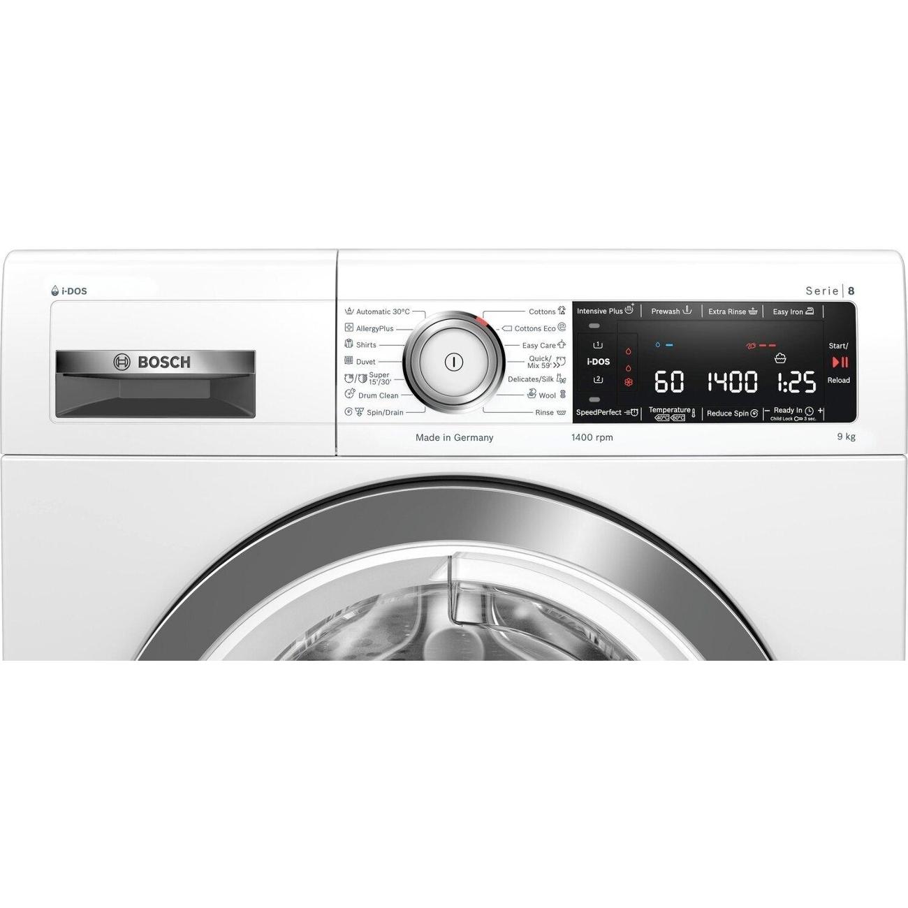 Стиральная машина Bosch WAV28K90ME вмещает до 9 кг. Функционирует в 14 программах и может постирать вещи из деликатных тканей, шерстяную одежду, джинсовую и обувь. Забытое белье можно доложить в процессе работы. Благодаря высокой максимальной скорости отжима 1400 об/мин одежда сохнет быстрее. Во время стирки прибор создает комфортный шум 46 дБ.