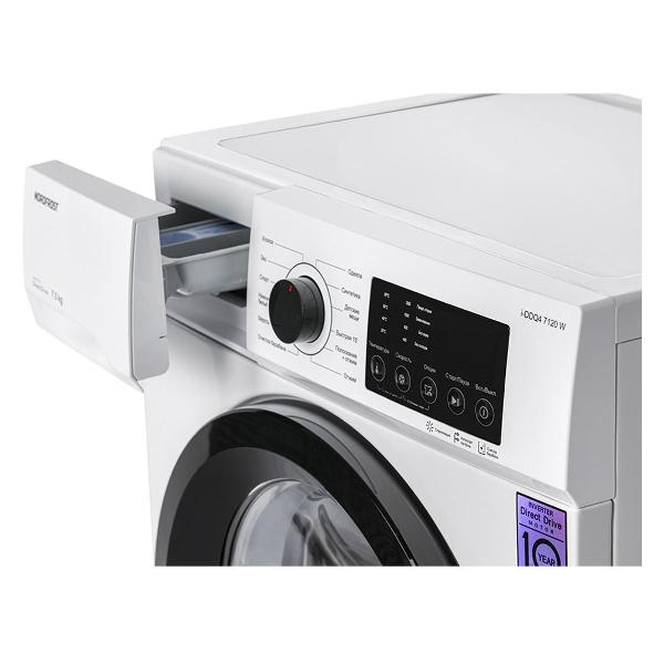Стиральная машина Nordfrost i-DDQ4 7120 W белого цвета с 12 программами вмещает до 7 кг белья. Габариты модели — 85х59,5х48 см. Вес изделия — 40 кг. Объем барабана составляет 46 л. На экране отображается выбранный режим, время до конца программы. Присутствует функция отложенного старта, система защиты от детей и контроля пенообразования. Уровень шума не превышает 60 дБ. Скорость отжима — до 1200 оборотов в минуту. Прибор оснащен инверторным мотором, защищен от протечек. Корпус сделан из прочного металла, дверь — из пластика и стекла.