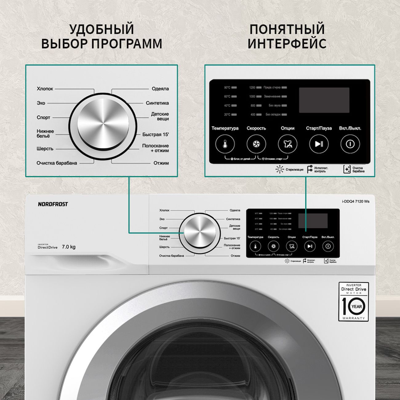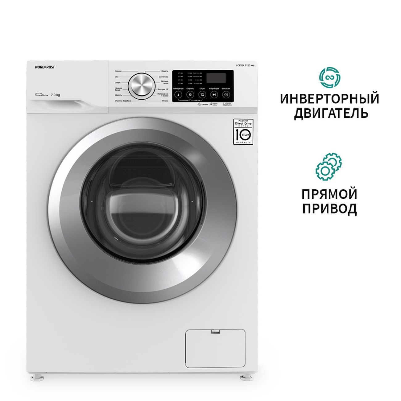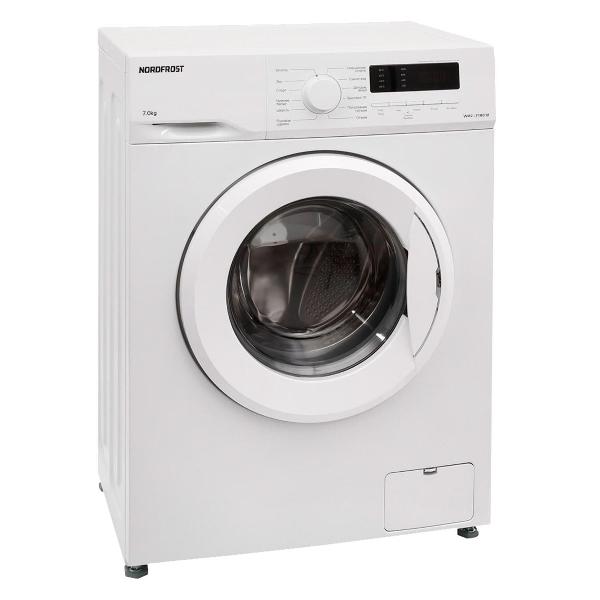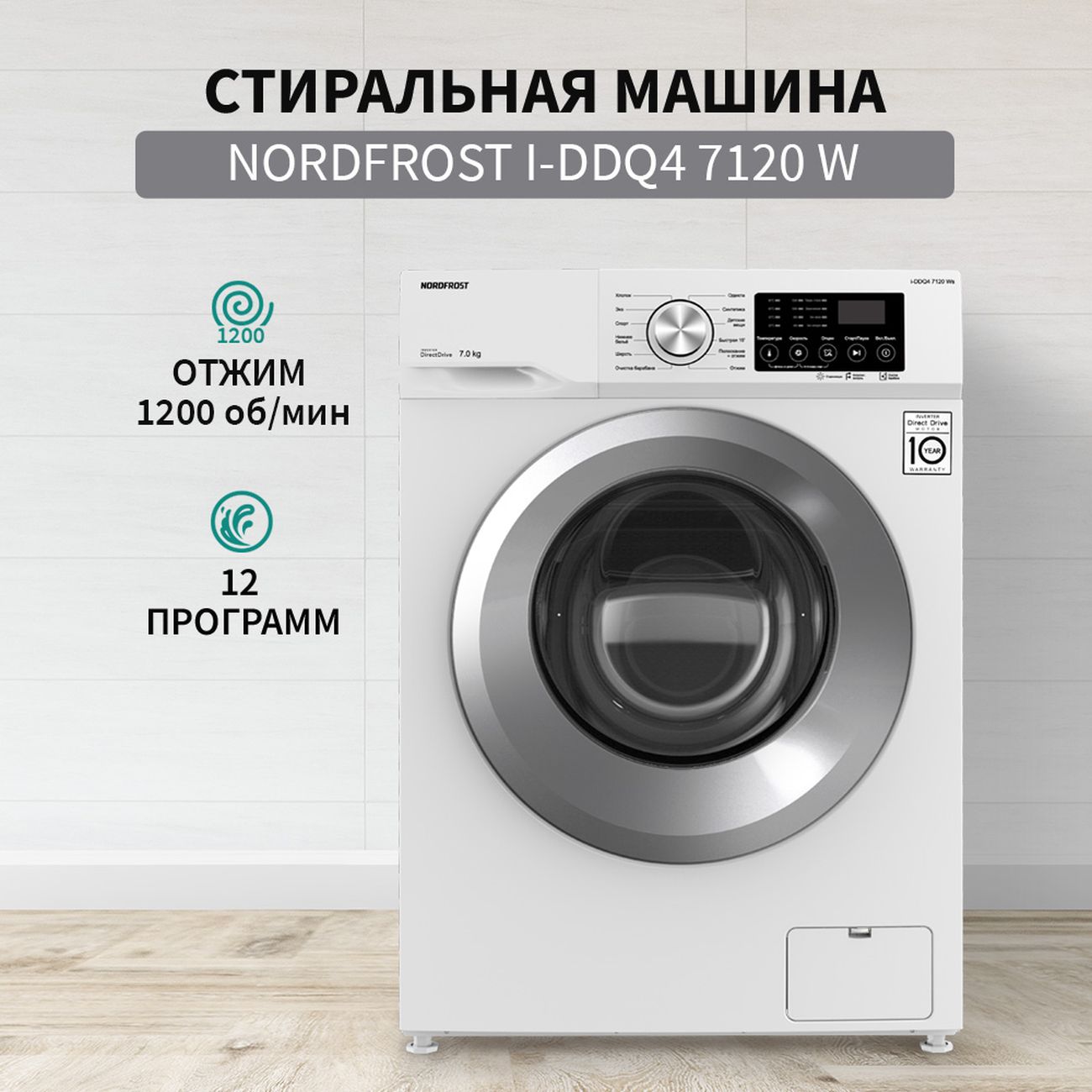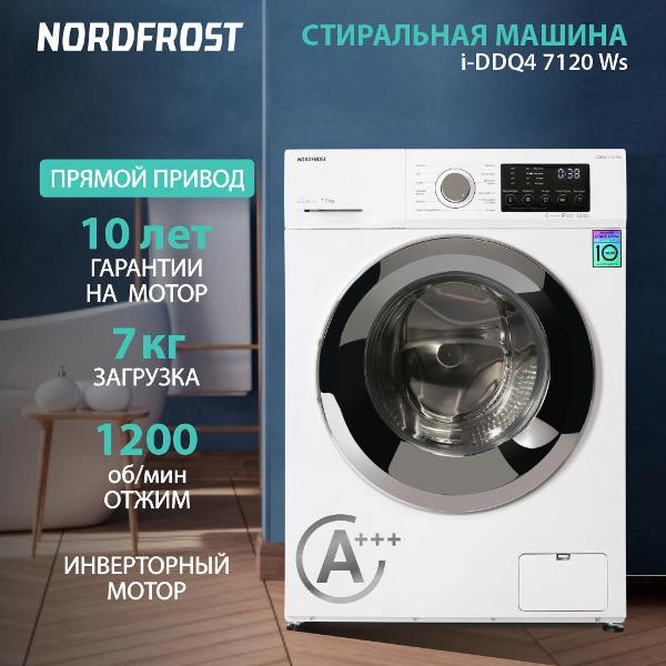 Стиральная машина Nordfrost i-DDQ4 7120 Ws белого цвета с 12 программами вмещает до 7 кг белья. Габариты модели — 85х59,5х48 см. Вес изделия — 58 кг. Объем барабана составляет 46 л. На экране отображается выбранный режим, время до конца программы. Присутствует функция отложенного старта, система защиты от детей и контроля пенообразования. Уровень шума не превышает 60 дБ. Скорость отжима — до 1200 оборотов в минуту. Прибор оснащен инверторным мотором, защищен от протечек. Корпус сделан из прочного металла, дверь — из пластика и стекла.