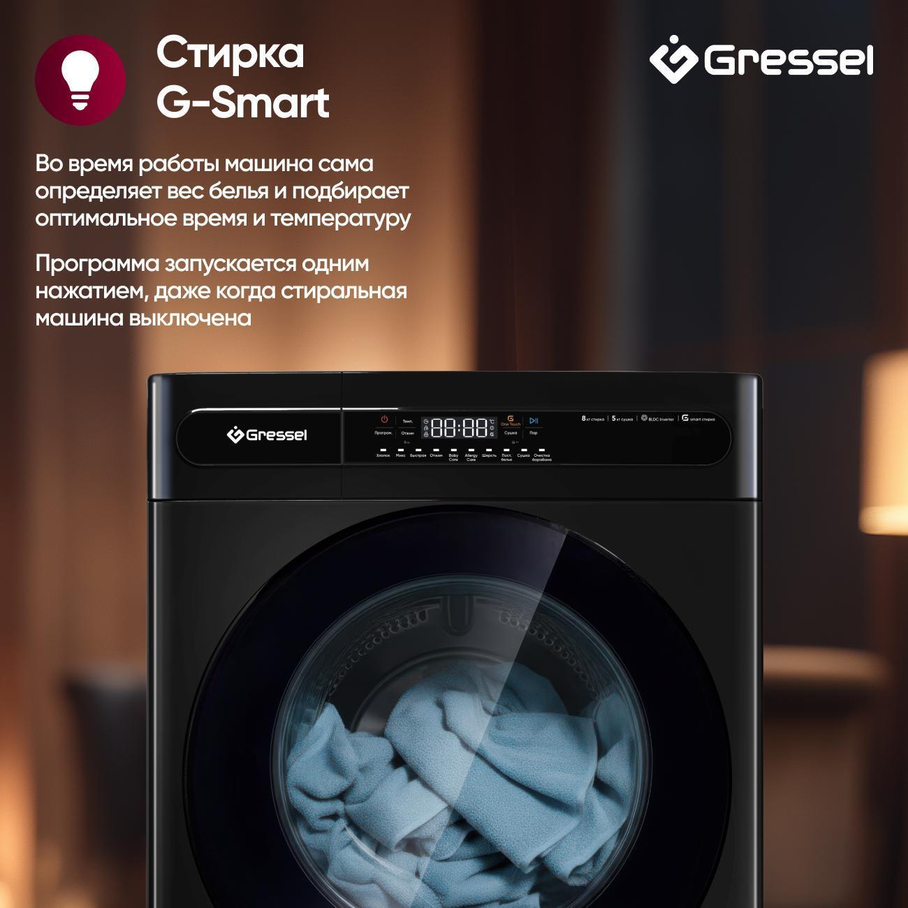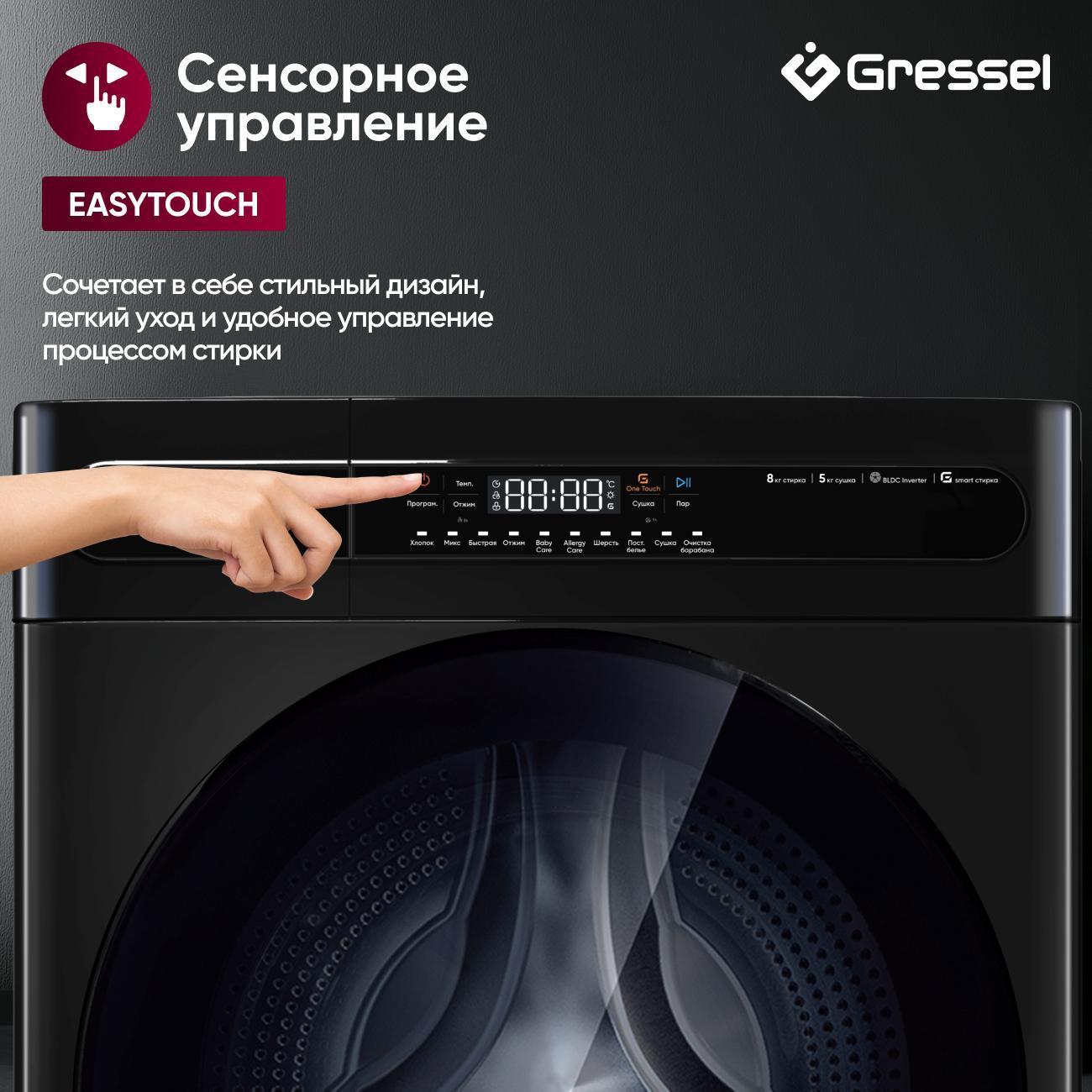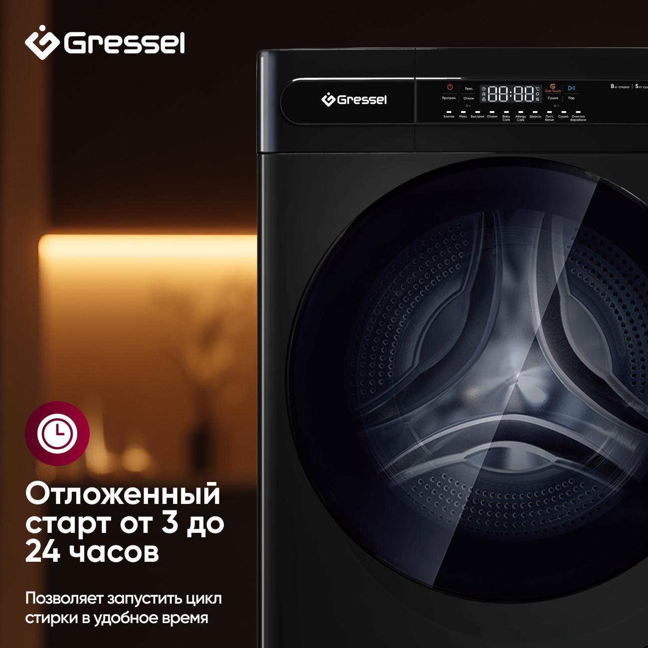 Стиральная машина с сушкой Gressel UGS704 — это полноценный помощник 2-в-1, созданный для комфортного ухода за бельём. Модель рассчитана на загрузку 8 кг при стирке и 5 кг при сушке, что делает её идеальным решением для семьи среднего размера. Инверторный мотор гарантирует тихую и долговечную работу, а максимальная скорость отжима 1400 об/мин обеспечивает эффективное удаление влаги. Чёрный корпус с полностью чёрной дверцей и сенсорным дисплеем придаёт прибору стильный, современный вид.