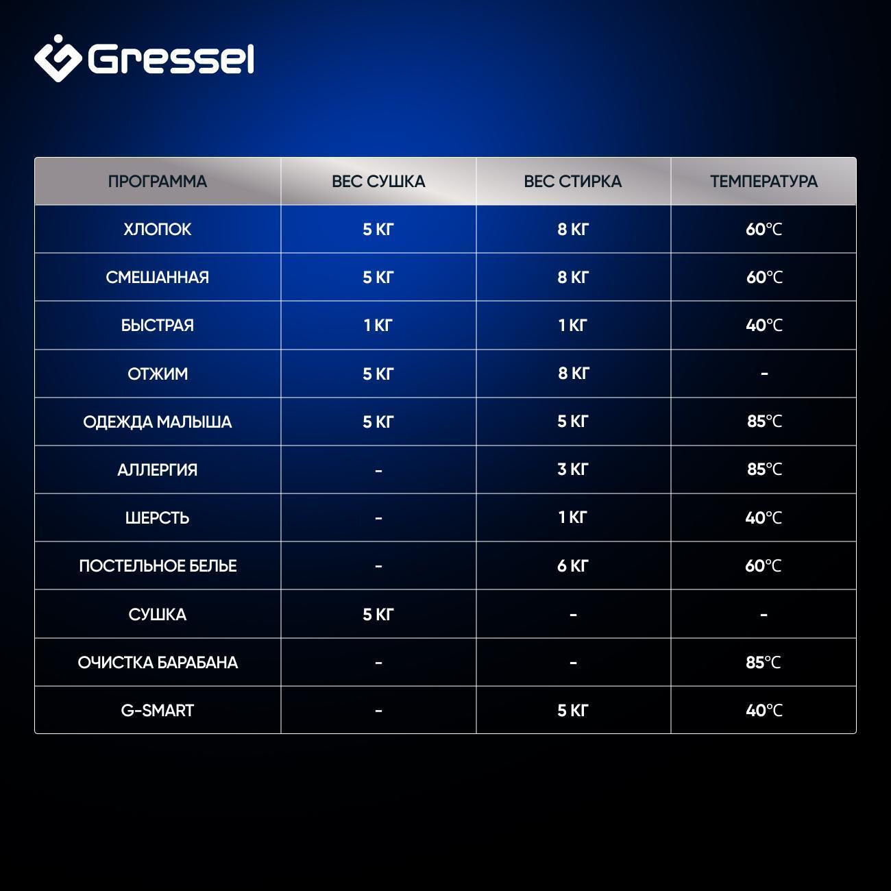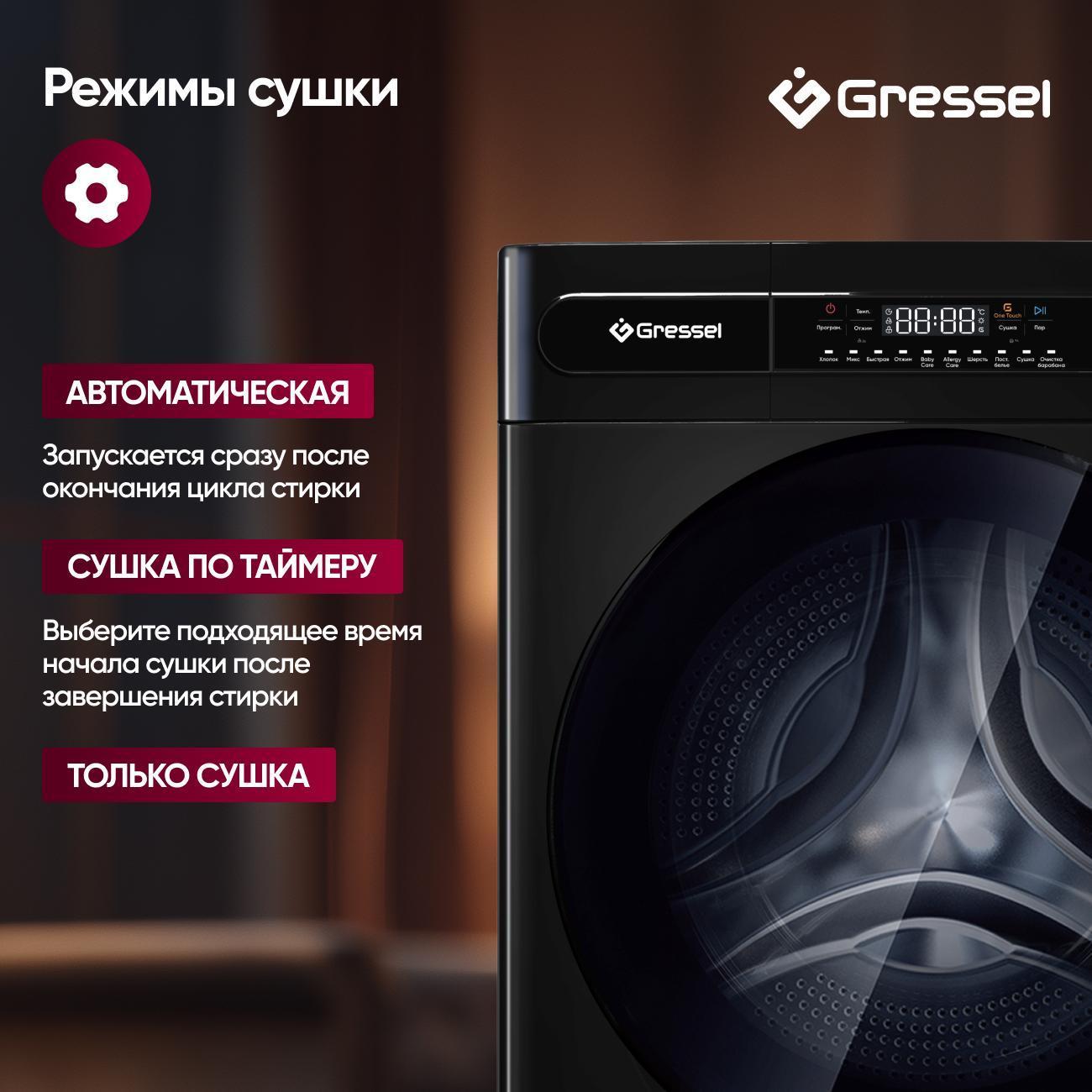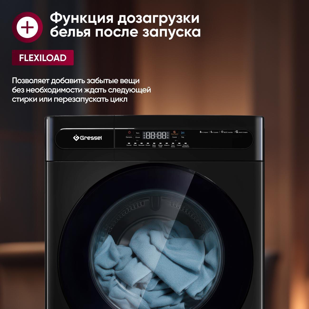Стиральная машина с сушкой Gressel UGS704 — это полноценный помощник 2-в-1, созданный для комфортного ухода за бельём. Модель рассчитана на загрузку 8 кг при стирке и 5 кг при сушке, что делает её идеальным решением для семьи среднего размера. Инверторный мотор гарантирует тихую и долговечную работу, а максимальная скорость отжима 1400 об/мин обеспечивает эффективное удаление влаги. Чёрный корпус с полностью чёрной дверцей и сенсорным дисплеем придаёт прибору стильный, современный вид.