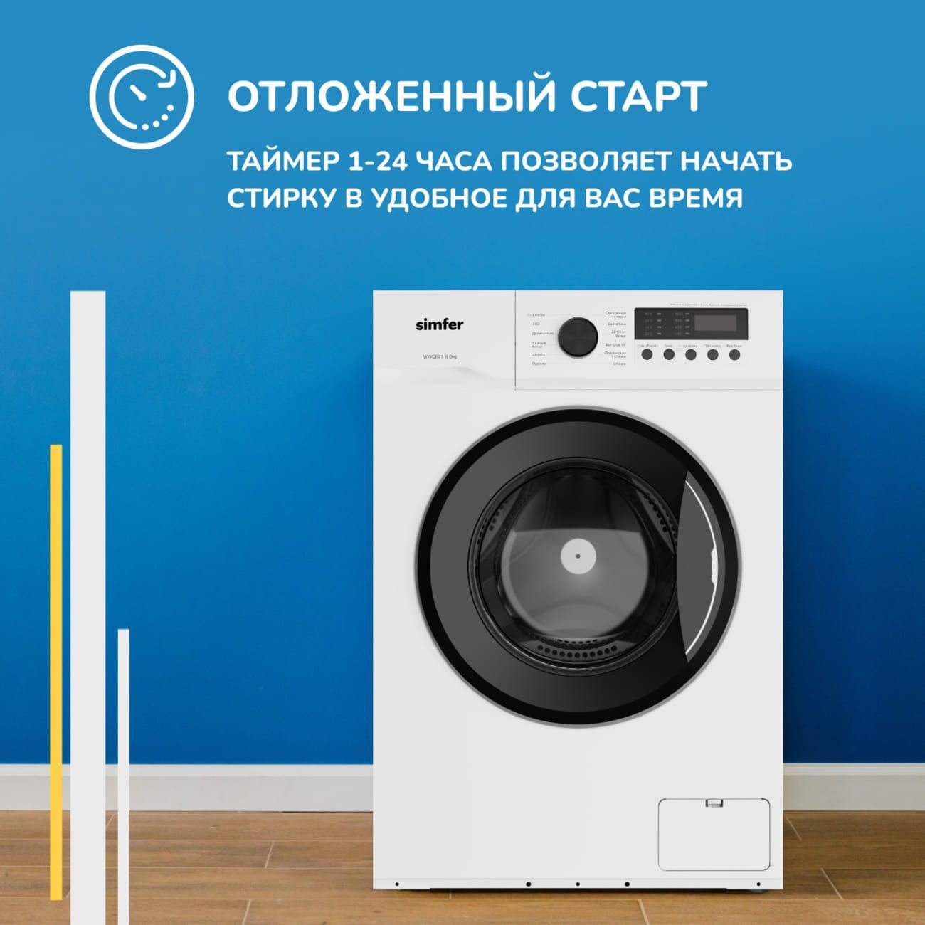 Отдельно стоящая стиральная машина Simfer WWC601 обладает весом 53 кг и габаритами 85х59,5х44 см. Прибор с фронтальной загрузкой вмещает до 6 кг белья. Дверца люка открывается налево.