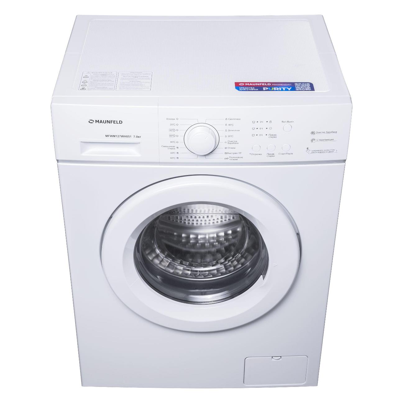 Узкая стиральная машина Maunfeld MFWM127WH051 обладает дверцей диаметром 43,9 см, изготовленной из пластика. Модель расходует до 1750 Вт мощности 52,5 л воды за один цикл. Класс энергоэффективности — А+++. Устройство оснащено стандартным мотором, позволяющим проводить отжим на скорости до 1200 об/мин. Объем барабана — 41 л.