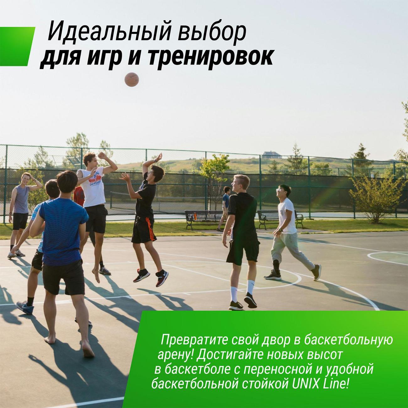 Баскетбольная стойка UNIX Line производится из стали с защитным полимерным покрытием. Собирается как конструктор по частям, которые фиксируются замковым соединением. Сооружение используется как в закрытых помещениях, так и для уличных соревнований. Команда может перевозить свое оборудование на другие площадки - стойки разбираются, складываются и легко переносятся. Данная система не предназначена для детей младше 3 лет. Крайне не рекомендуется выполнять заброс мяча, ухватившись за стойку или за кольцо корзины, так как она не предназначена для подобного использования.