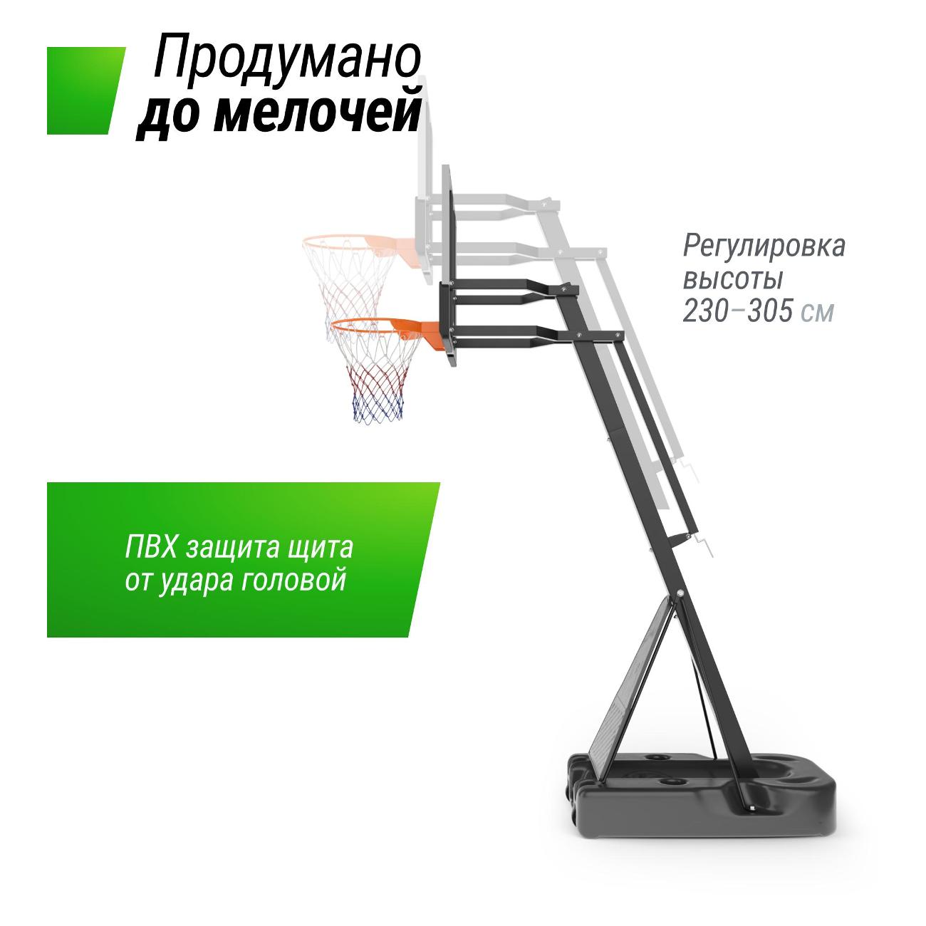 Специально разработанная устойчивая конструкция обеспечивает стабильность и безопасность во время игры, позволяя вам наслаждаться каждым забитым мячом. Олимпийский стандарт кольца 45 см позволит почувствовать себя настоящим профи в игре. Регулируемая высота щита от 2.30 до 3.05 м позволяет настраивать кольцо со стойкой под свой рост и профессионализм.