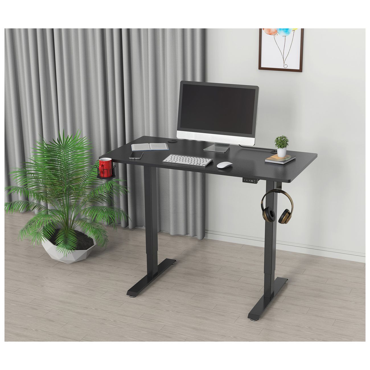Компьютерный стол Cactus CS-ED-BBK оснащен подъемным механизмом. Он подключается к розетке 220 В и позволяет опускать и поднимать столешницу в диапазоне от 720 до 1200 мм со скоростью до 25 мм/с. Предусмотрена память двух положений. Мебель сделана из МДФ и выдерживает нагрузку до 80 кг. Размеры рабочей поверхности — 60 х 120 см. Есть кабель-каналы, подстаканник и крючок для наушников.