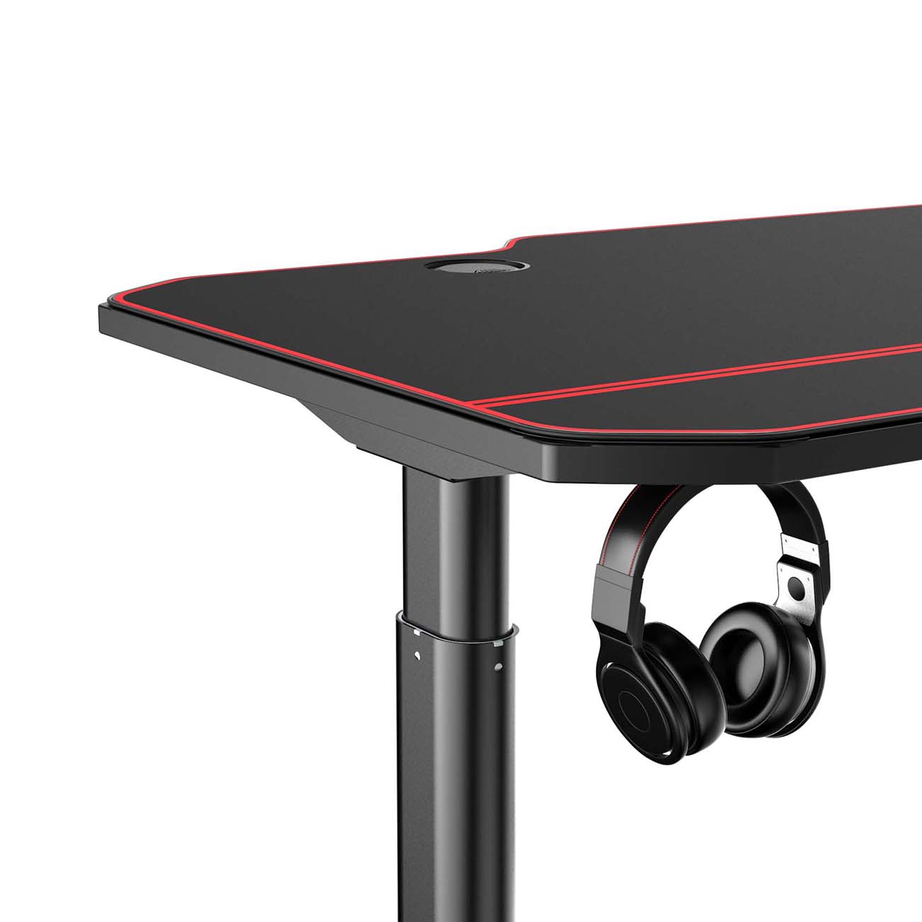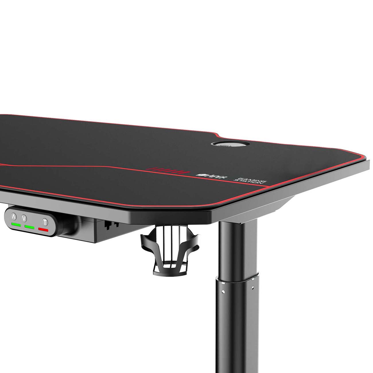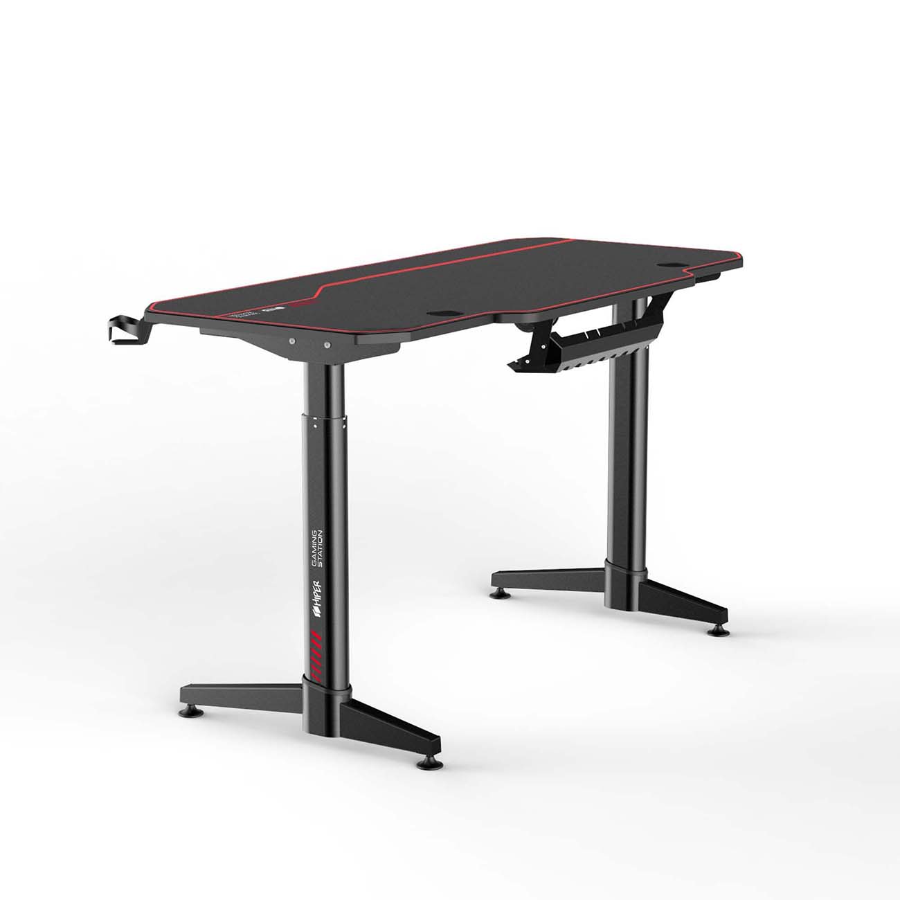 Столешница сделана из МДФ, но обладает карбоновым покрытием для эффектного вида. Опоры выполнены из окрашенной стали и демонстрируют необходимую прочность. Кроме того, производители оснастили Hiper Electro HG-EL1-1400 системой кабель-менеджмента, отдельными держателями для наушников и чашки.