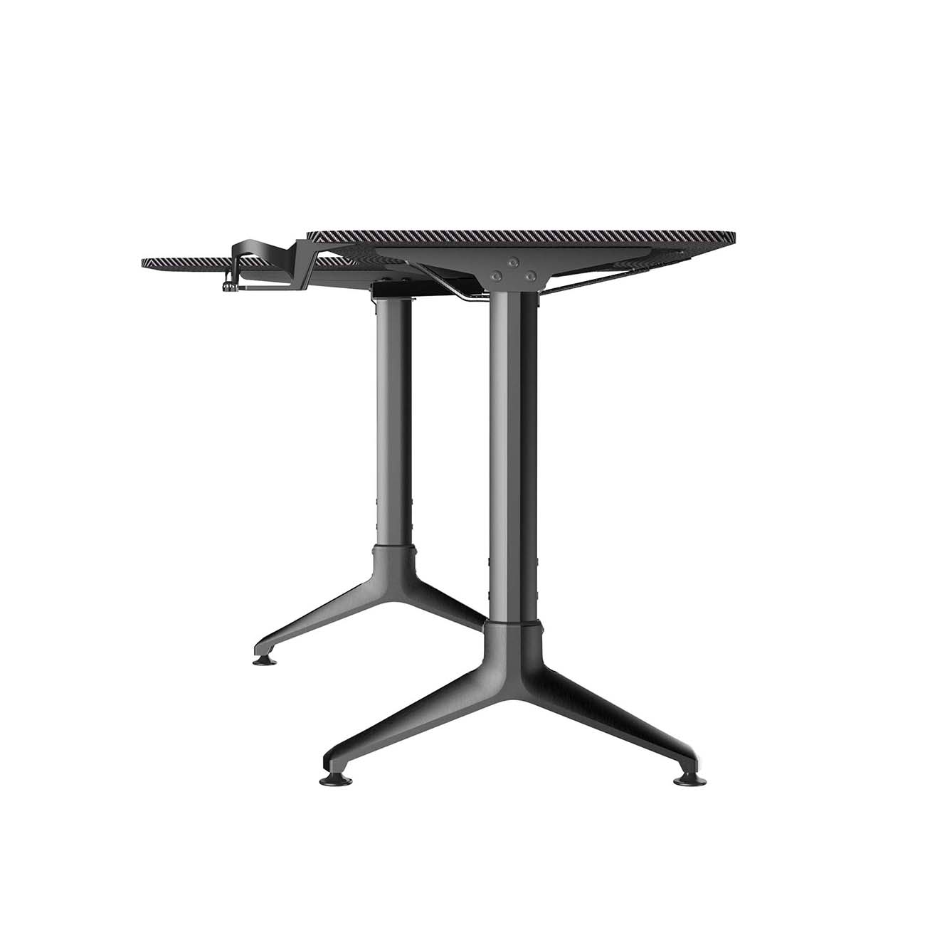 Модель обладает столешницей из МДФ с карбоновым покрытием, которое придаёт столу футуристичный облик. Опоры сделаны из алюминия и демонстрируют достаточную прочность. При этом ты можешь самостоятельно подобрать высоту из трёх вариантов, предусмотренных создателями в диапазоне от 70 до 80 см.
