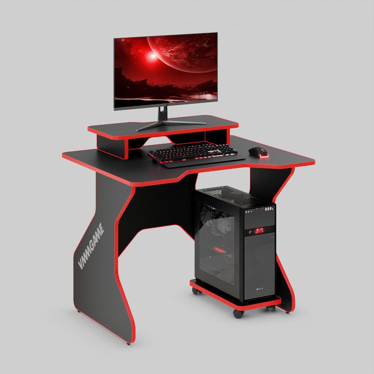 Компьютерный игровой стол Vmmgame One Dark 100 красного цвета поставляется с противоскользящим мини-матом, который располагается на поверхности столешницы. Кромки фигурные, плавные, что сводит к минимуму риск получить травму при случайном столкновении. На фронтальной части сделан эргономичный вырез. Мебель размещается на устойчивых ножках, исключающих переворачивание. Корпус изготовлен из ПВХ и ЛДСП. Для ухода применяют влажную ветошь, неабразивные средства бытовой химии. Толщина доски составляет 16 мм. Максимальная нагрузка — 80 кг. Габариты — 77х80х100 см. Вес — 20 кг.