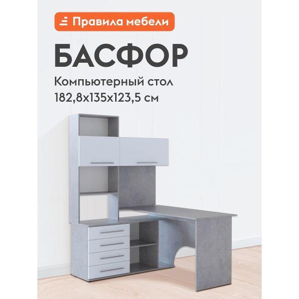 Компьютерный стол Басфор — это просторная поверхность и тумба с ящиками, полками и нишей под системный блок. Высокий стеллаж имеет открытые и два закрытых отделения, дверцы которых открываются вверх. Модель позволяет организовать максимально удобную и функциональную рабочую зону как в домашнем кабинете, так и офисном помещении.