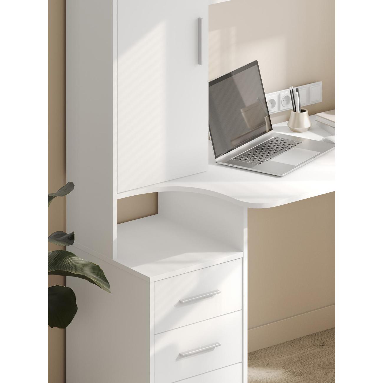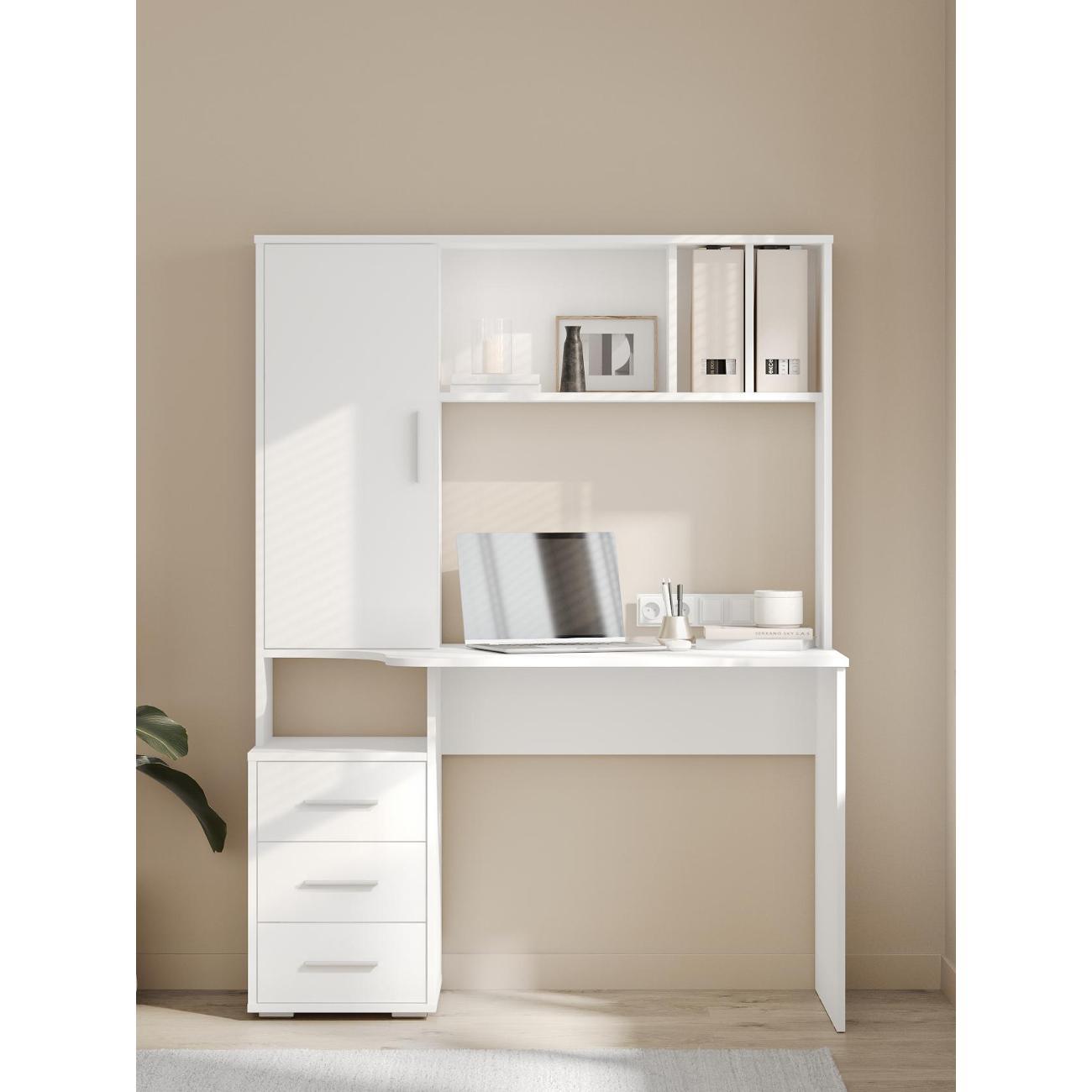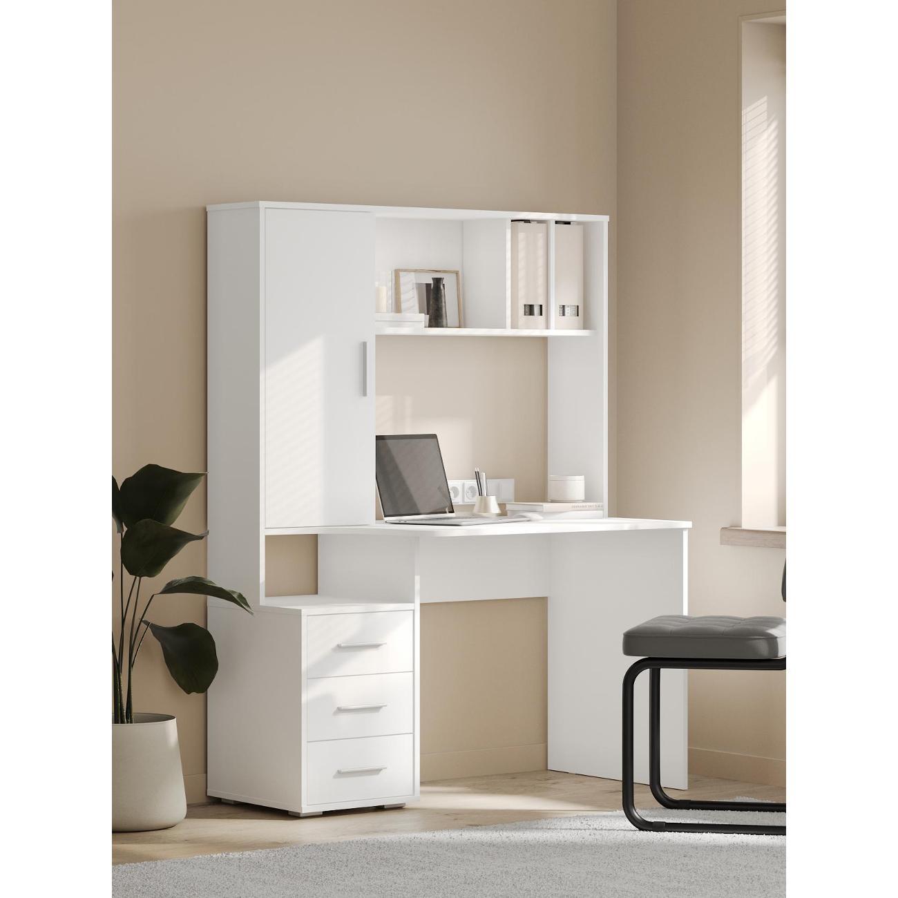 • функциональный — оснащен тумбой с тремя ящиками и надстройкой с полками и стеллажом;