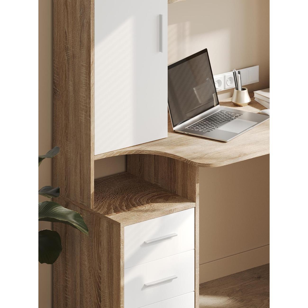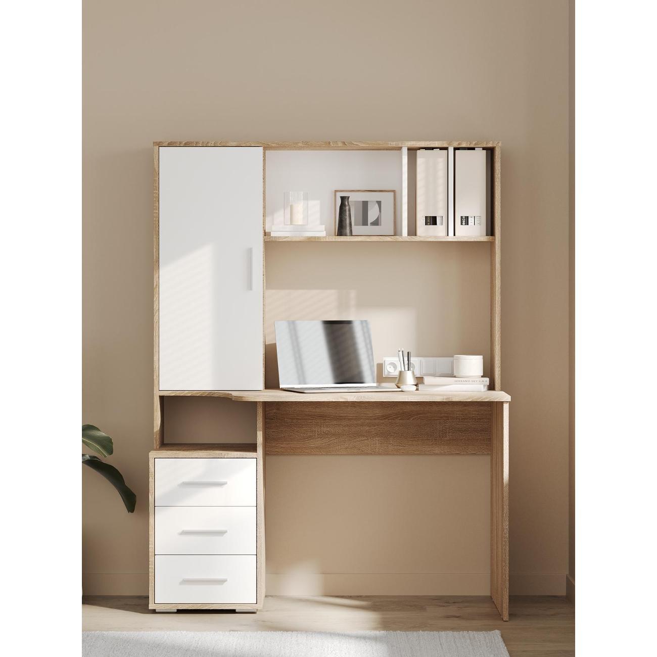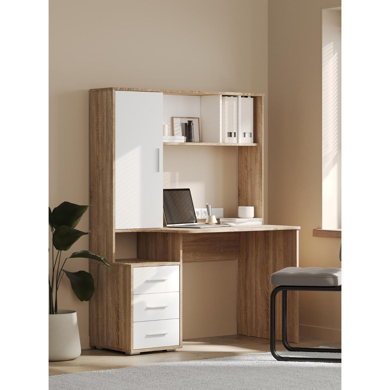 • функциональный — оснащен тумбой с тремя ящиками и надстройкой с полками и стеллажом;