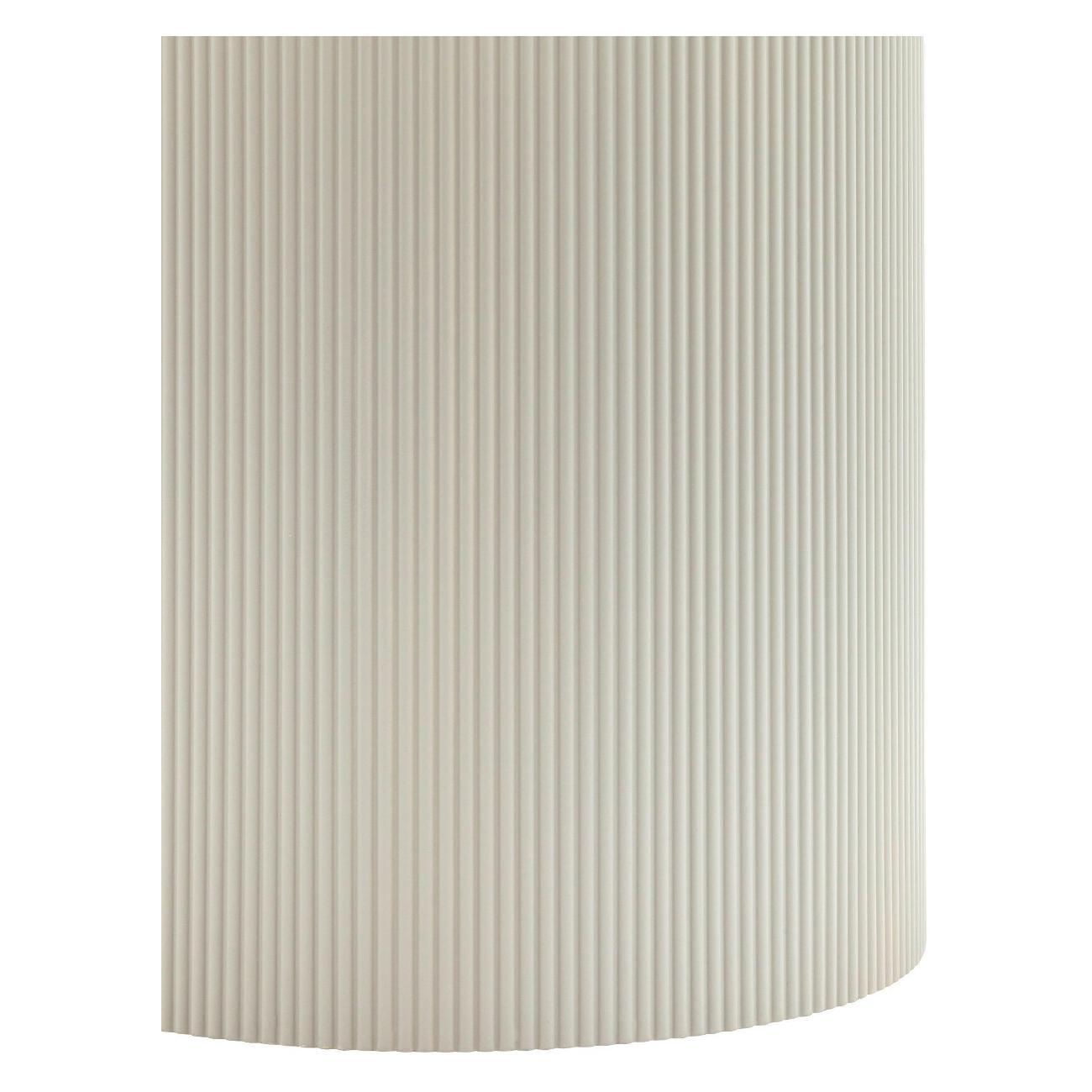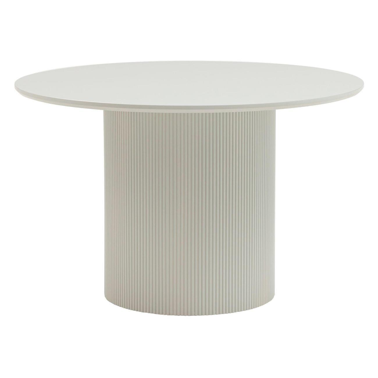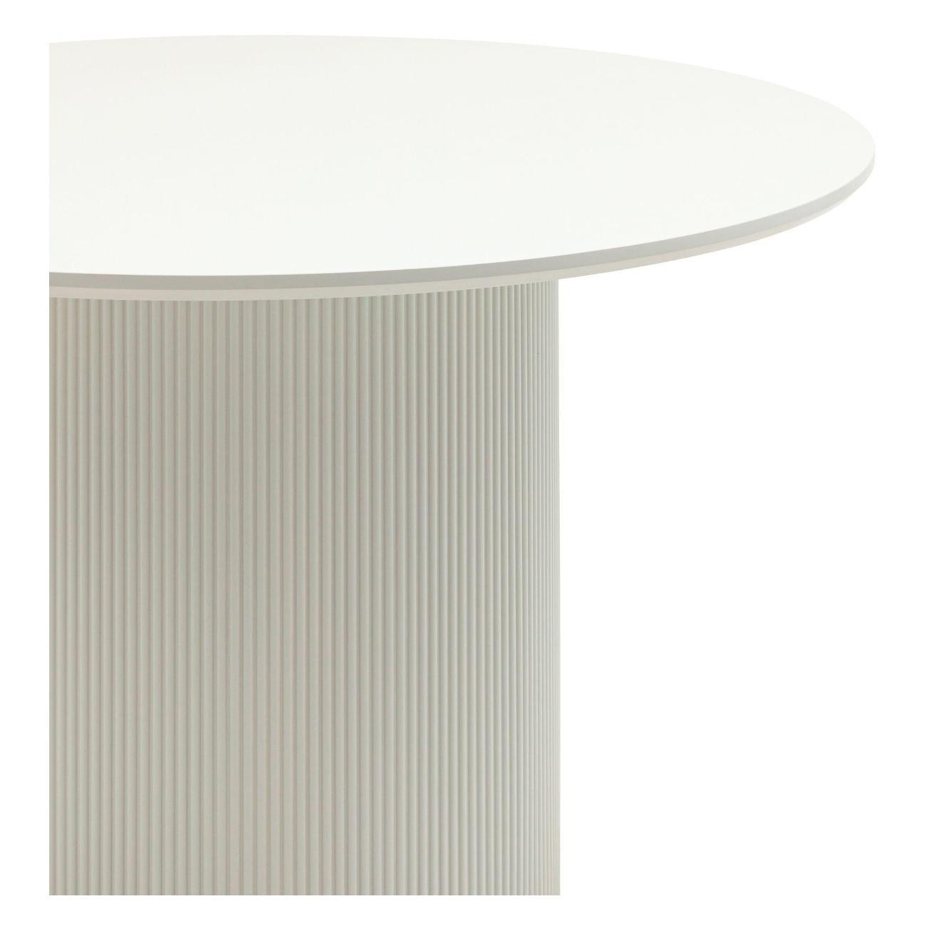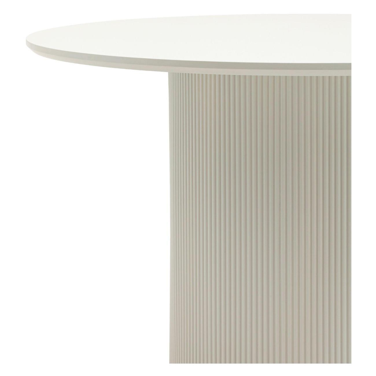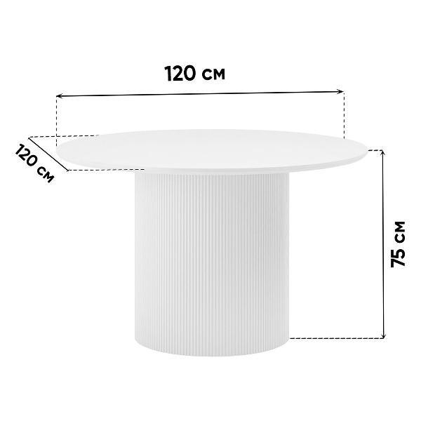 Столешница выполнена из прочного и долговечного МДФ. Светлая поверхность столешницы гармонично сочетается с массивной основой серого цвета. Простая круглая форма стола позволит легко вписать его в современный интерьер, стол украсит кухню, гостиную или современное кафе, ресторан. Опорное плиссированное основание стола в лаконичном дизайне надёжно удерживает всю конструкцию и дополняет монолитный образ.