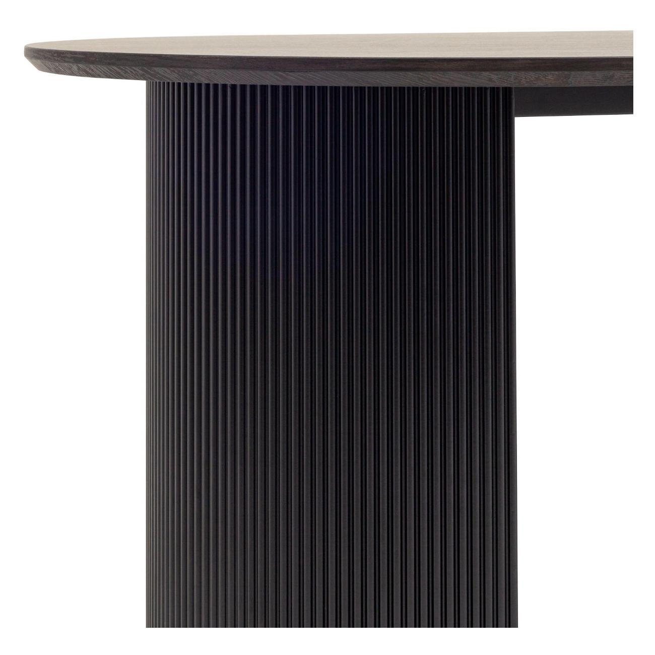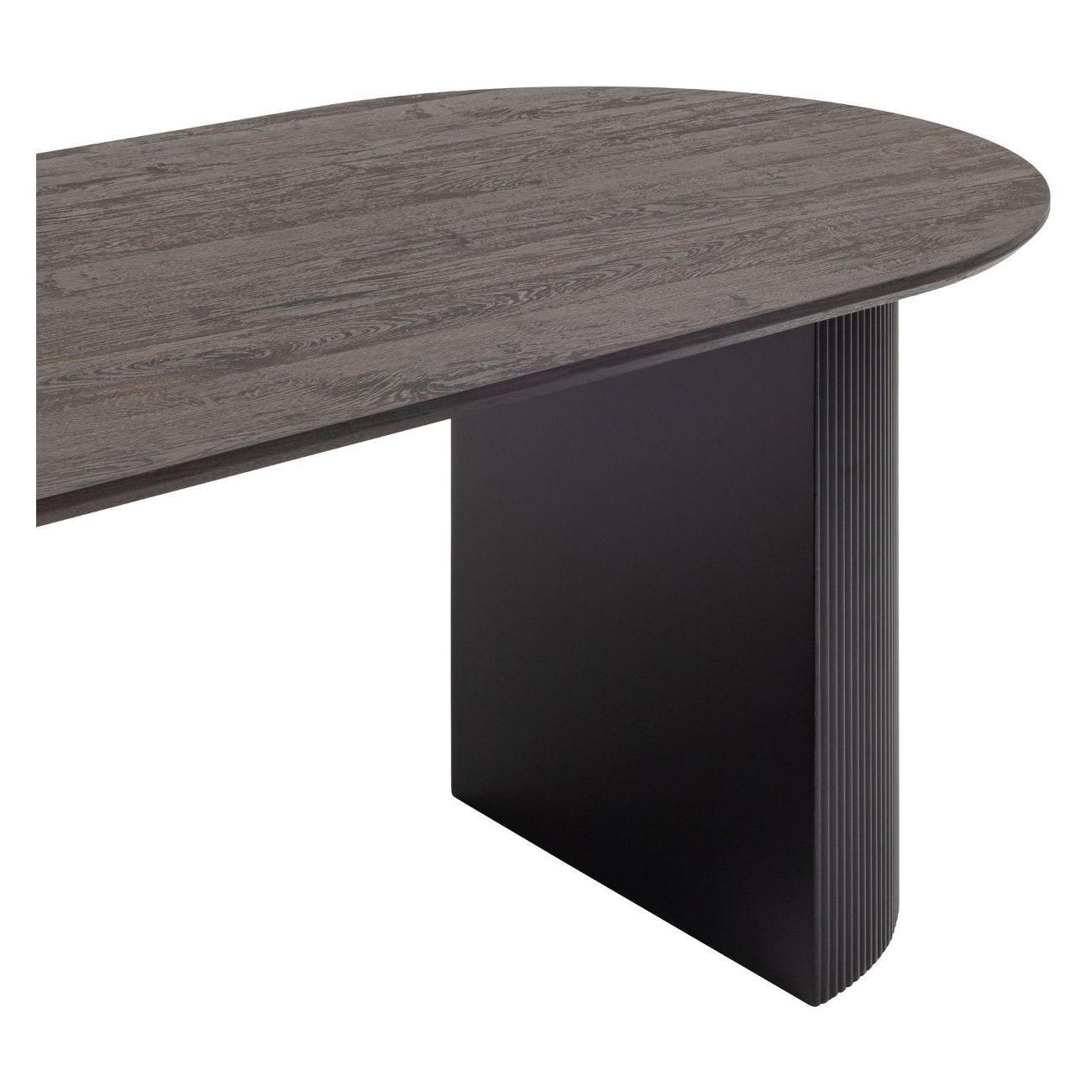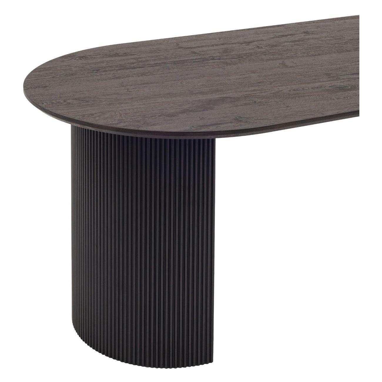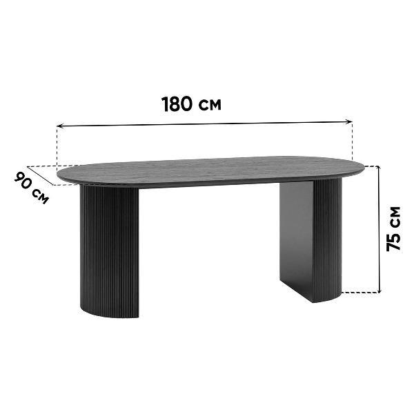 Столешница выполнена из прочного и долговечного МДФ. Темная поверхность столешницы гармонично сочетается с массивными ножками черного цвета. Простая овальная форма стола позволит легко вписать его в современный интерьер, стол украсит кухню, гостиную или современное кафе, ресторан. Опорные плиссированные ножки в лаконичном дизайне надёжно удерживают всю конструкцию и дополняют монолитный образ.