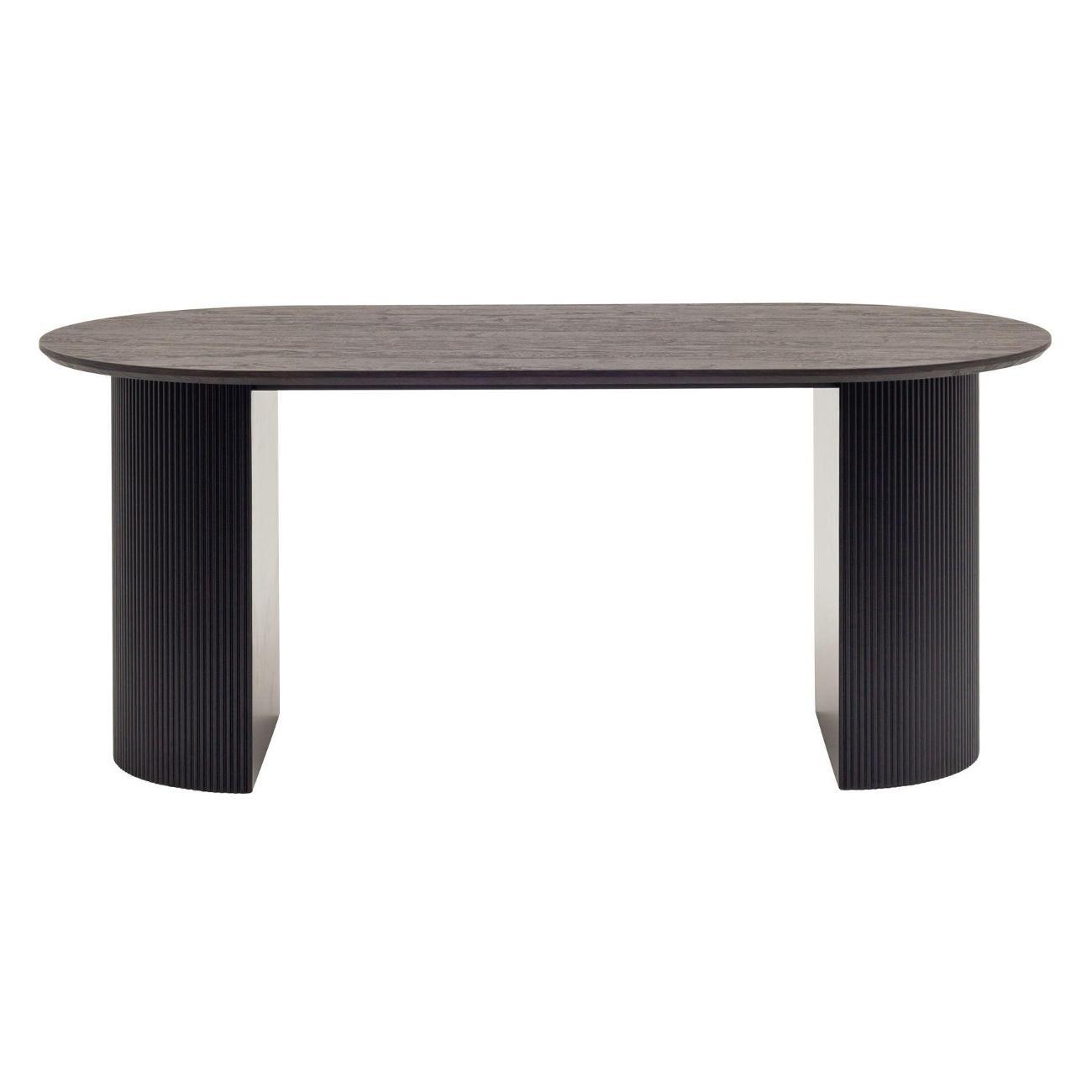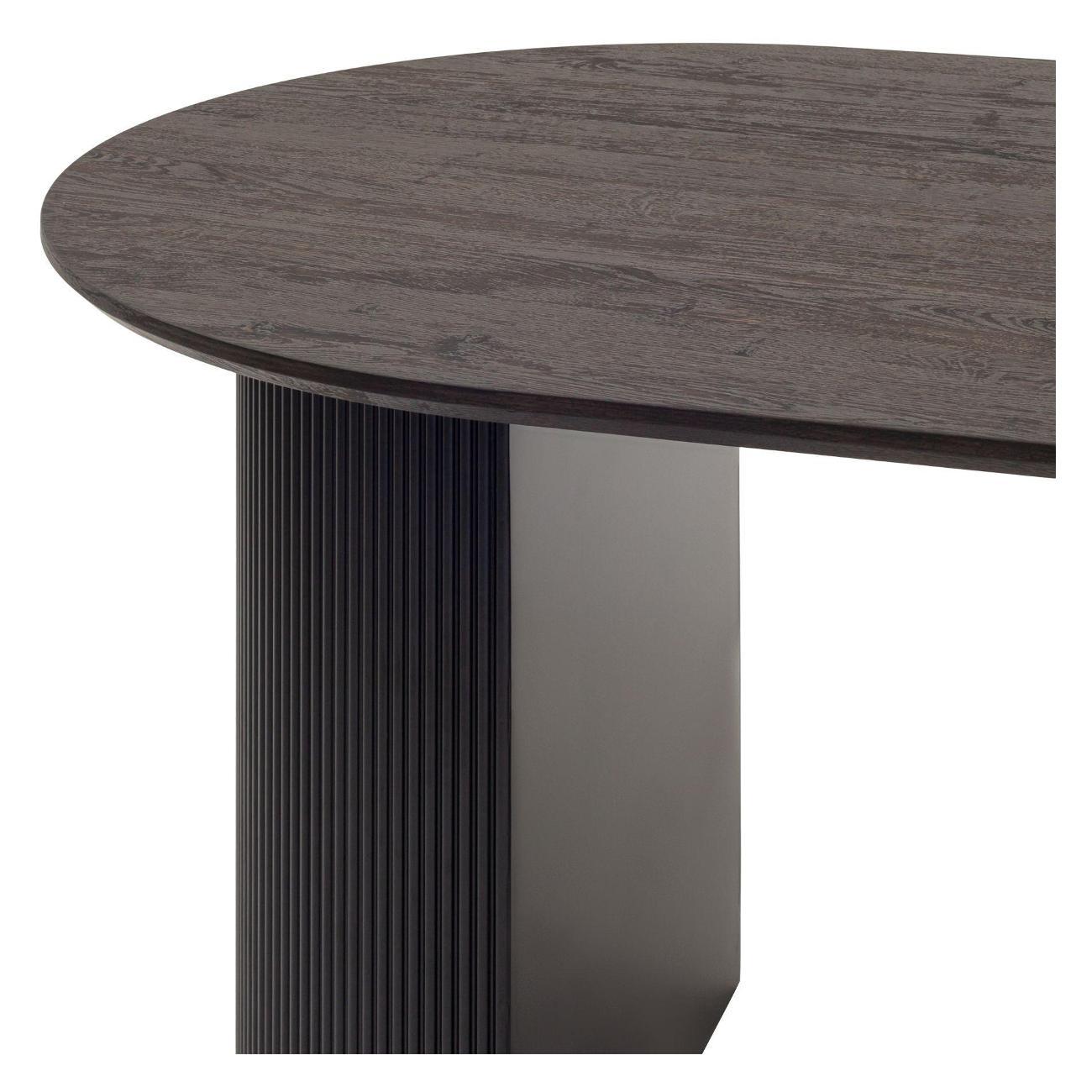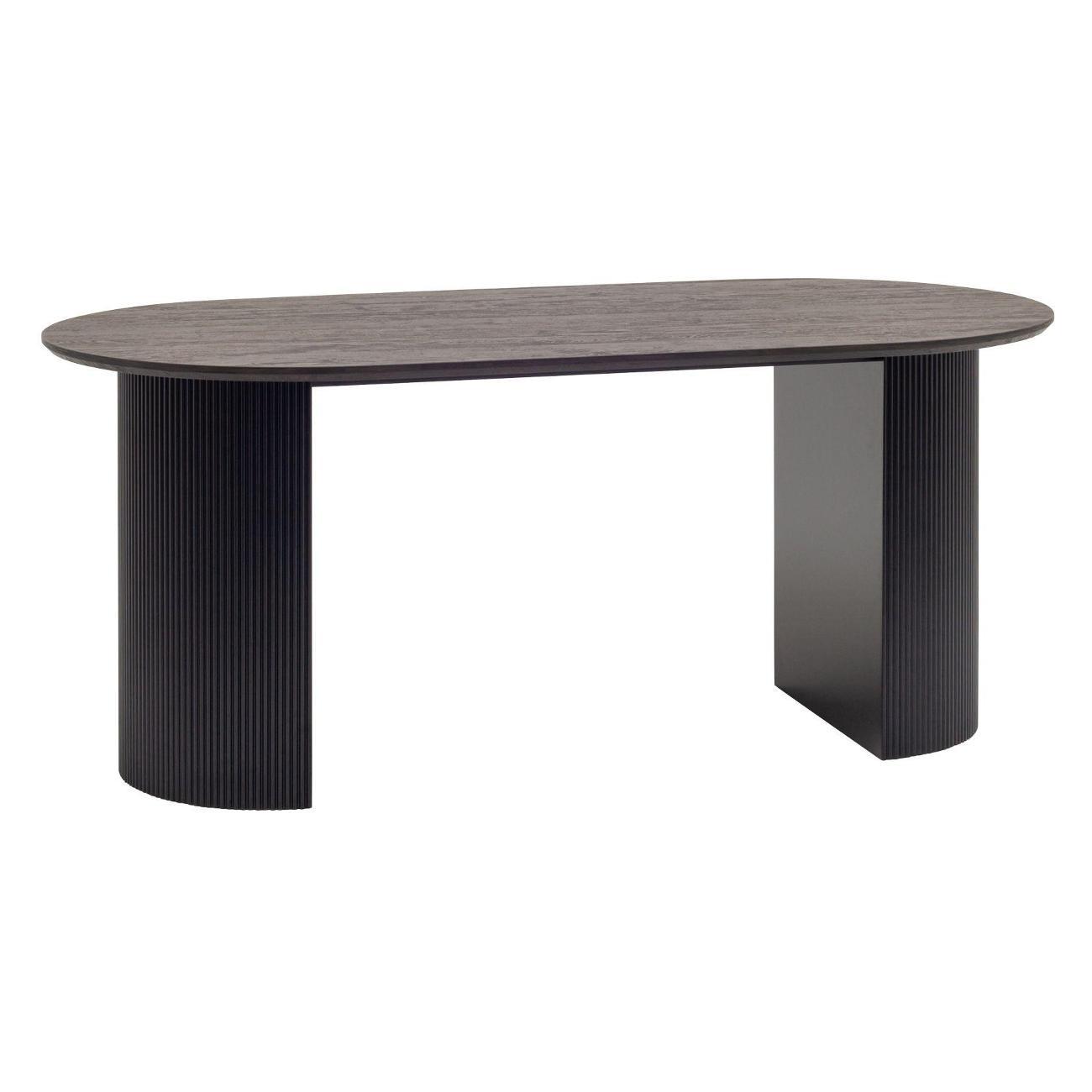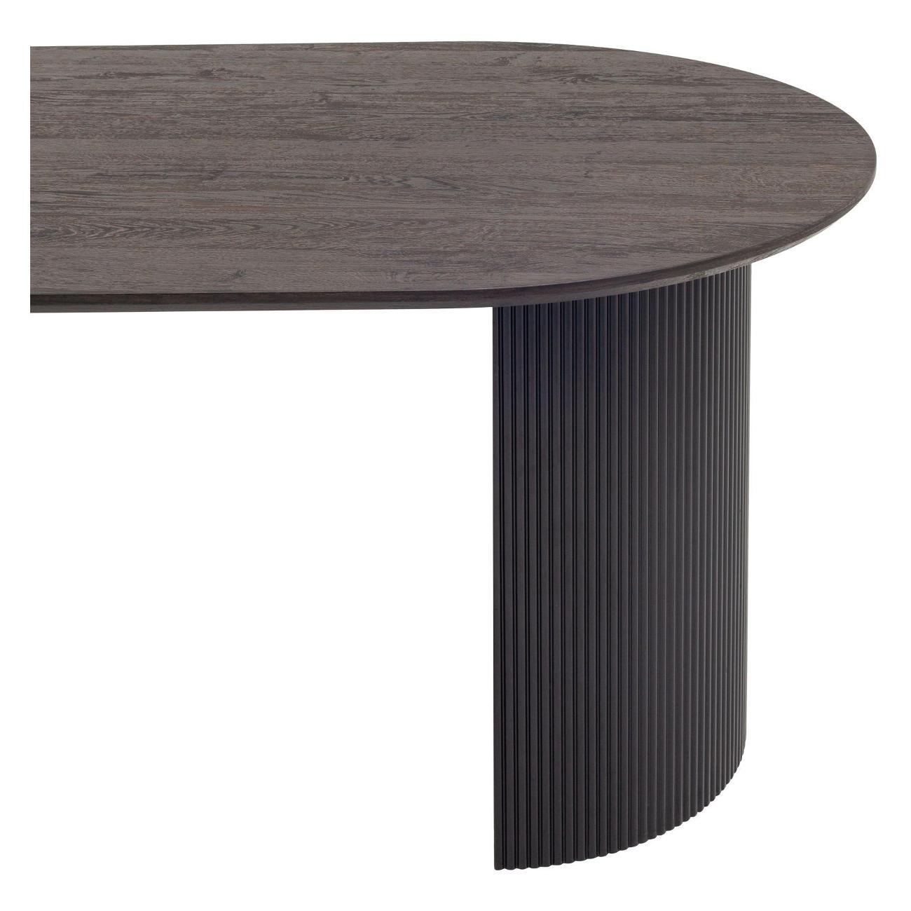 Столешница выполнена из прочного и долговечного МДФ. Темная поверхность столешницы гармонично сочетается с массивными ножками черного цвета. Простая овальная форма стола позволит легко вписать его в современный интерьер, стол украсит кухню, гостиную или современное кафе, ресторан. Опорные плиссированные ножки в лаконичном дизайне надёжно удерживают всю конструкцию и дополняют монолитный образ.