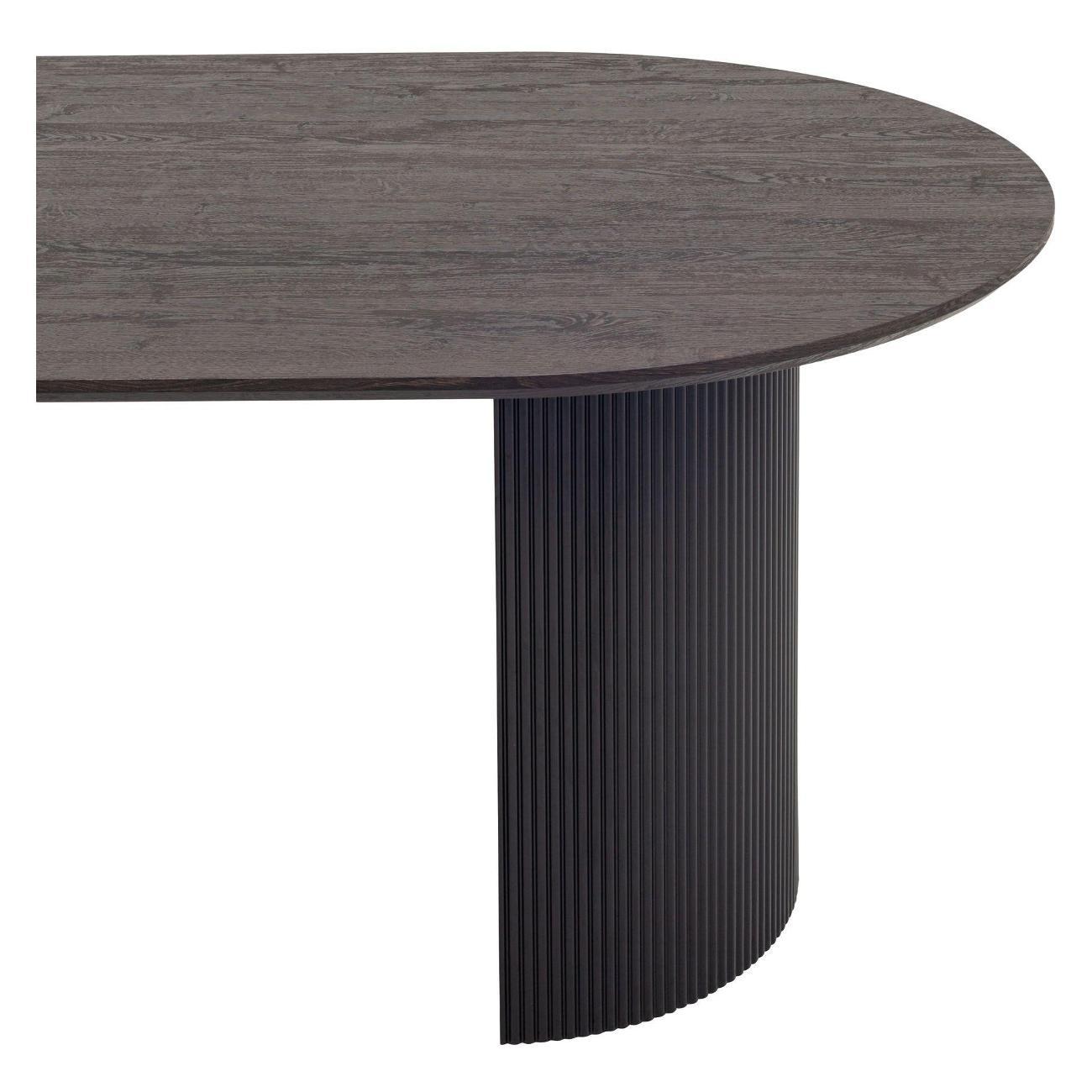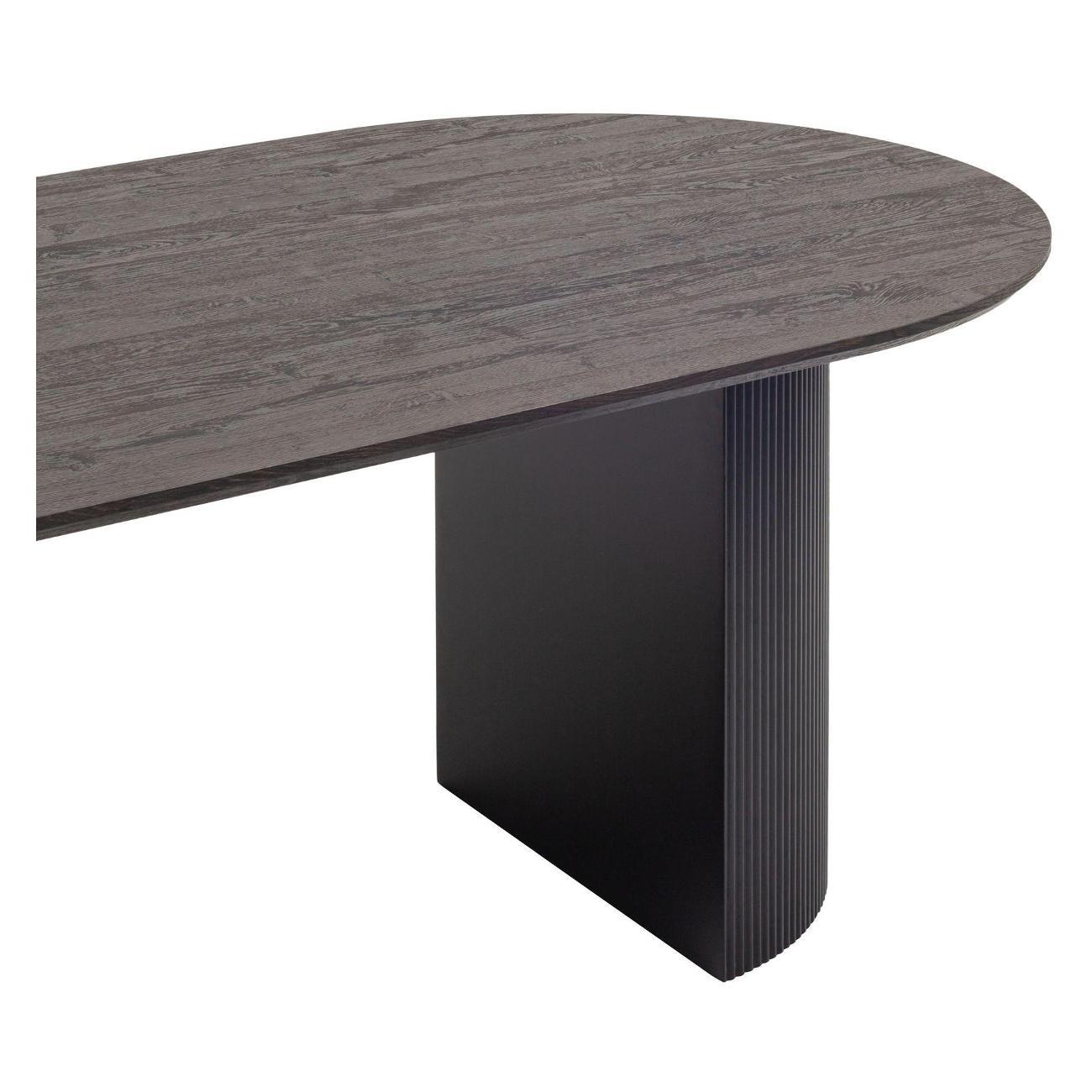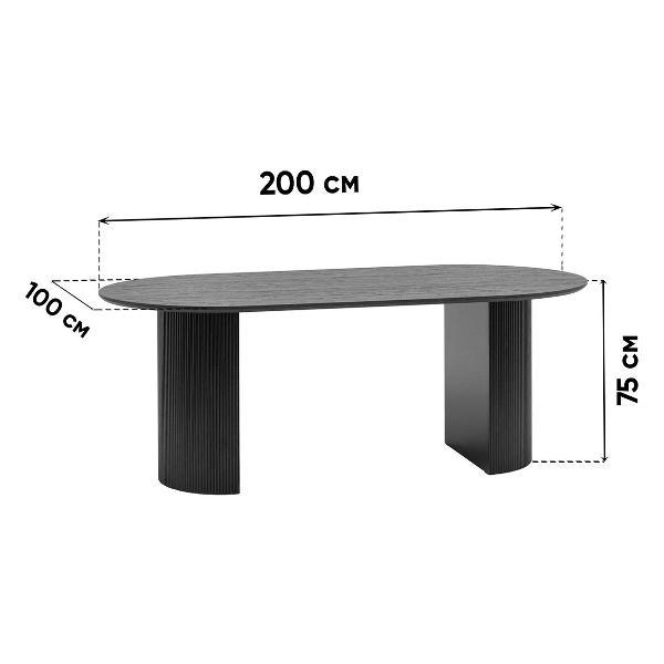 Столешница выполнена из прочного и долговечного МДФ. Темная поверхность столешницы гармонично сочетается с массивными ножками черного цвета. Простая овальная форма стола позволит легко вписать его в современный интерьер, стол украсит кухню, гостиную или современное кафе, ресторан. Опорные плиссированные ножки в лаконичном дизайне надёжно удерживают всю конструкцию и дополняют монолитный образ.