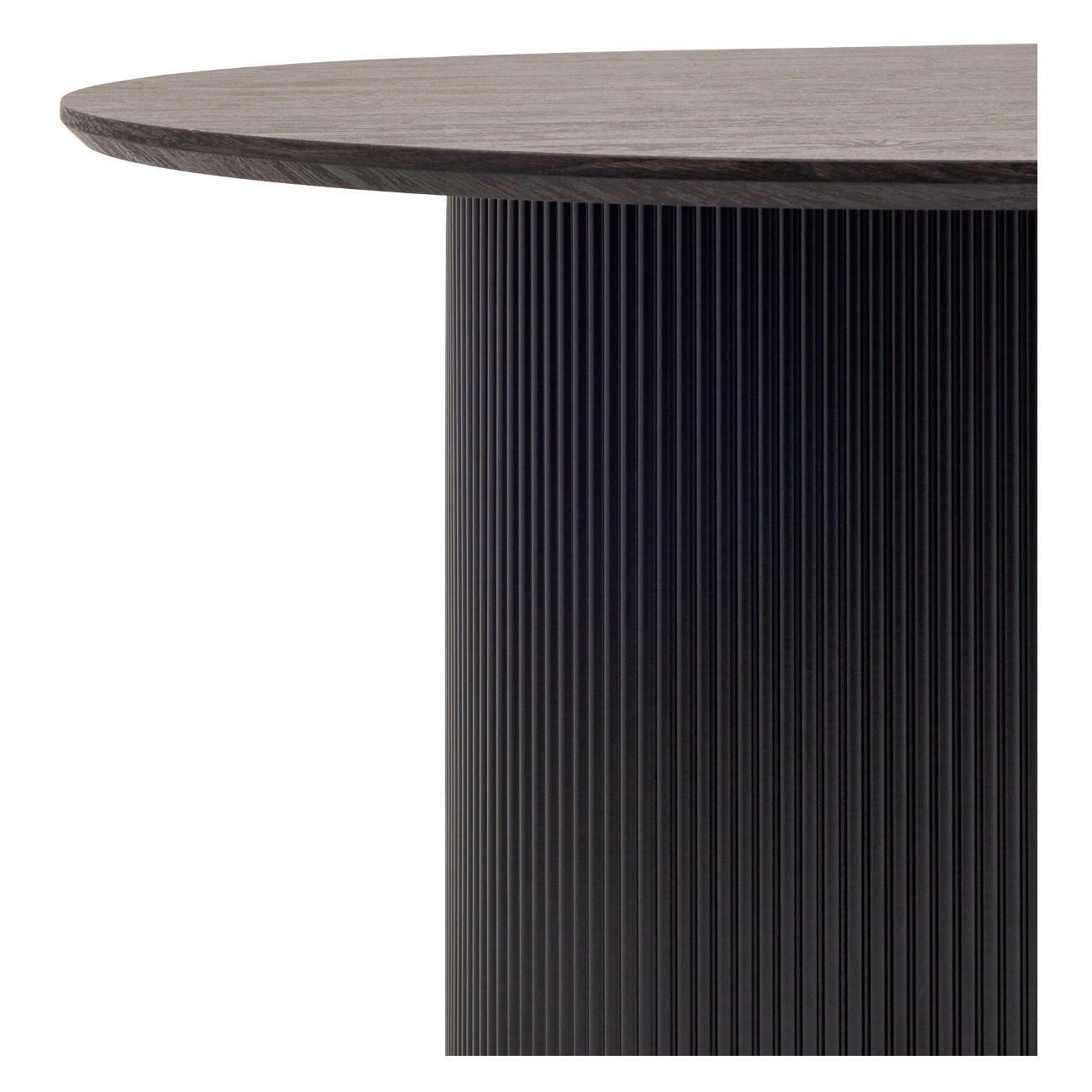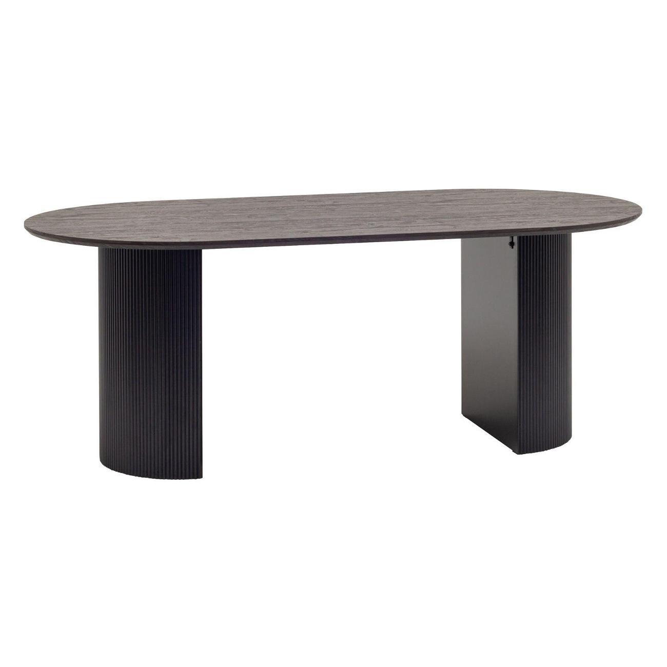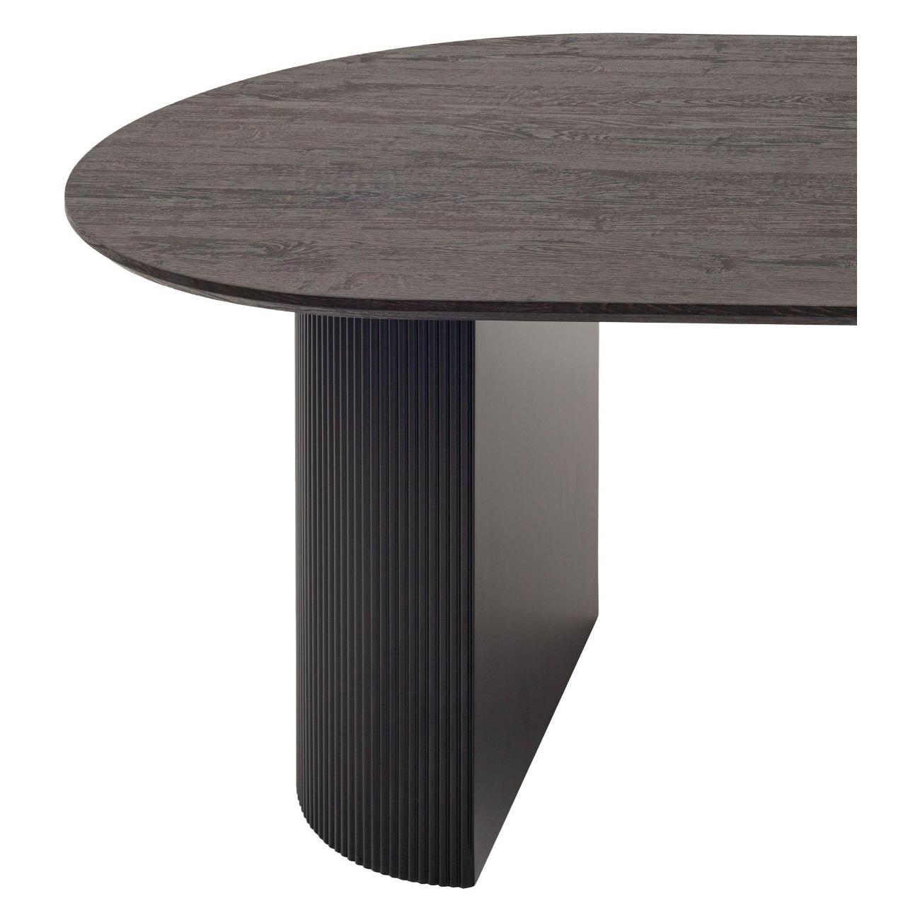 Столешница выполнена из прочного и долговечного МДФ. Темная поверхность столешницы гармонично сочетается с массивными ножками черного цвета. Простая овальная форма стола позволит легко вписать его в современный интерьер, стол украсит кухню, гостиную или современное кафе, ресторан. Опорные плиссированные ножки в лаконичном дизайне надёжно удерживают всю конструкцию и дополняют монолитный образ.