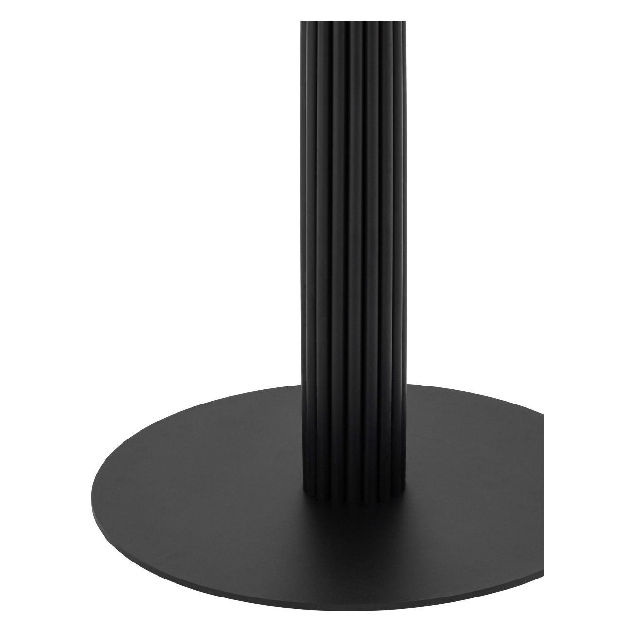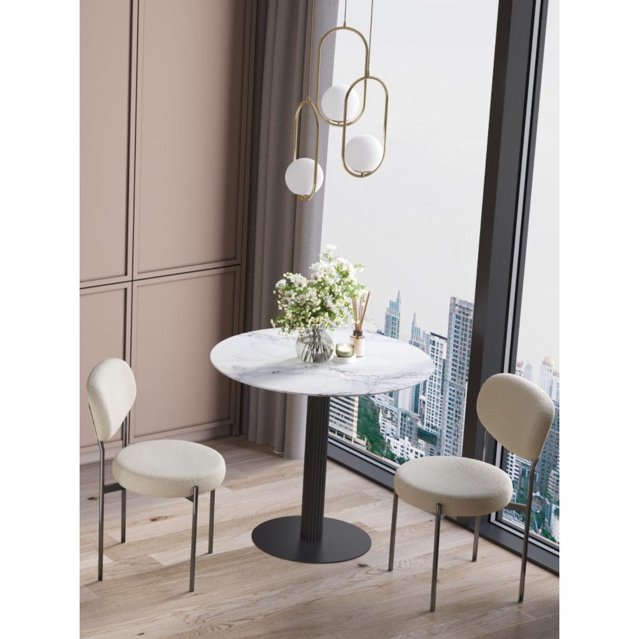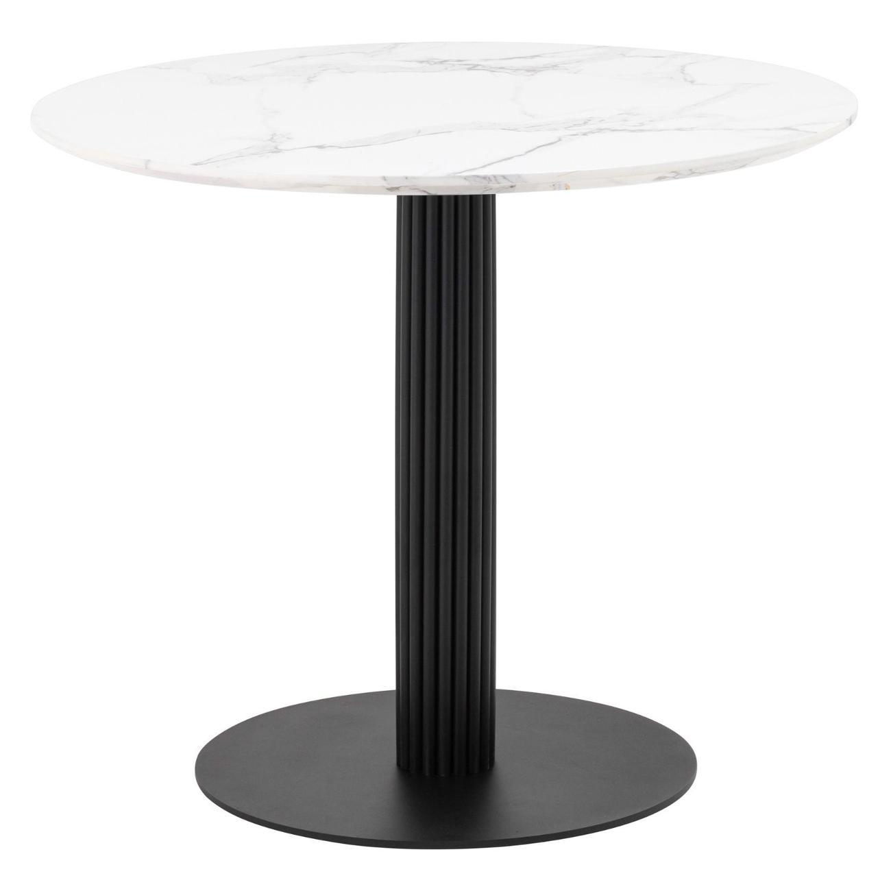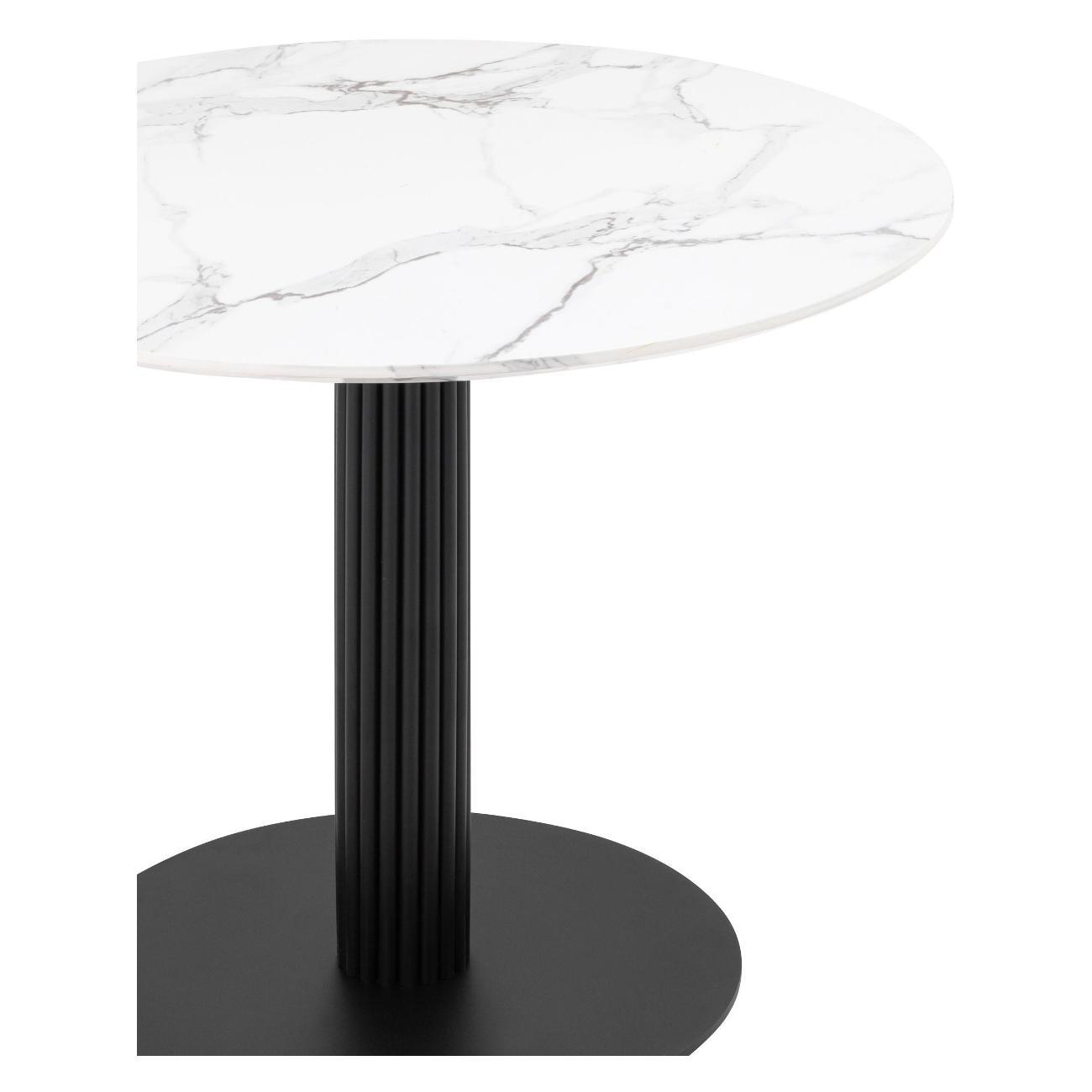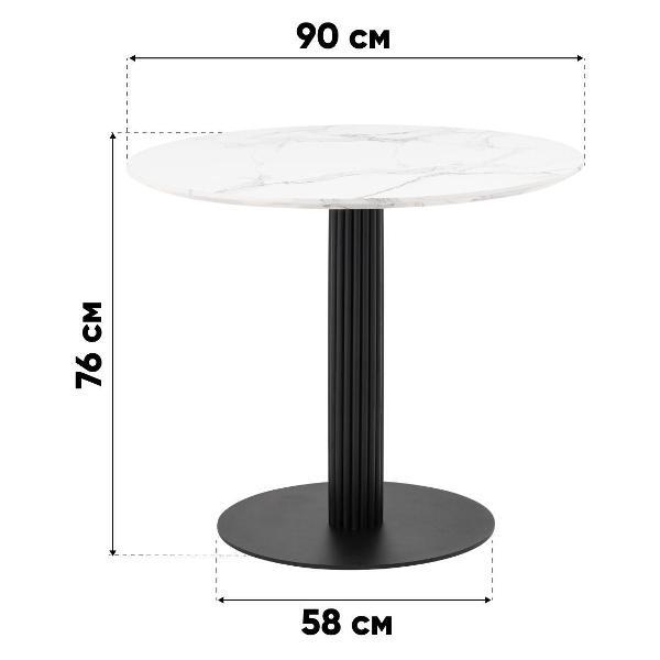 Стильный стол с металлическим плиссе основанием. Круглая столешница с рисунком белого мрамора выполнена из МДФ - прочного, экологически безопасного материала, который устойчив к перепадам температур и повышенной влажности. Поверхность столешницы декорирована рисунком белого мрамора, который идеально сочетается с металлическим основанием в черном цвете. Диаметр столешницы 90 см.