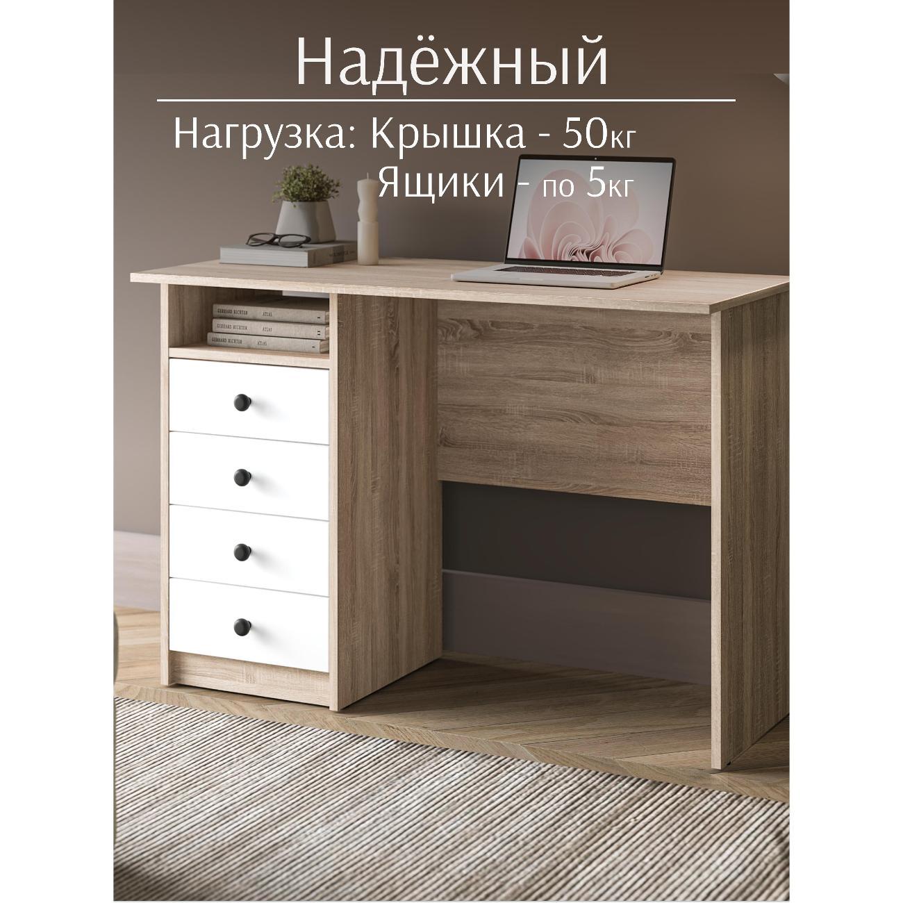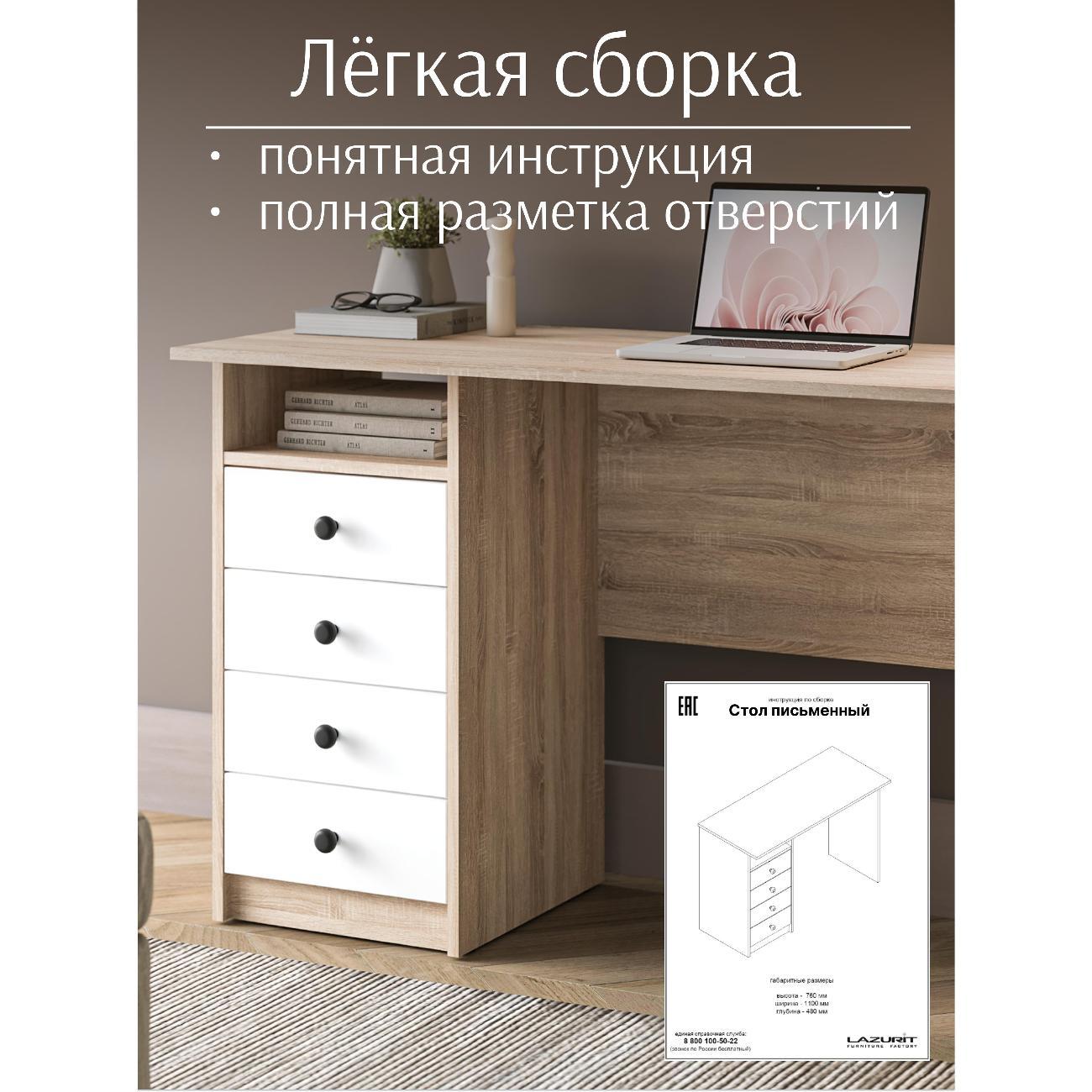 Функциональный письменный стол оснащен четырьмя вместительными ящиками где удобно хранить тетради, документы и канцелярию. Благодаря этому письменный стол с ящиками поддерживает порядок и делает рабочее пространство более организованным.