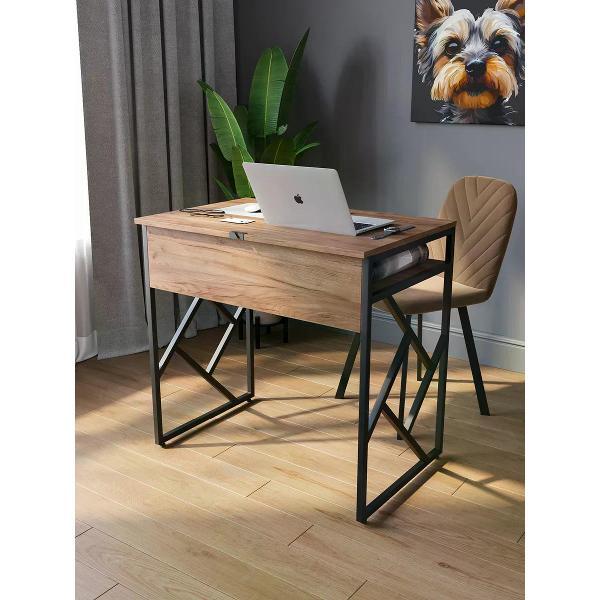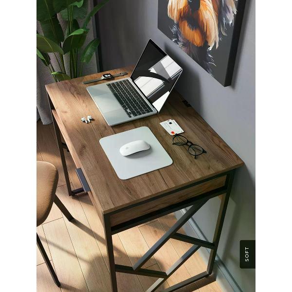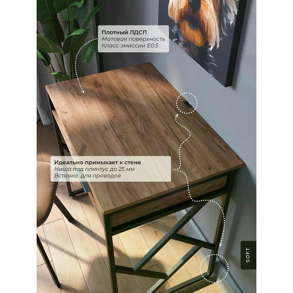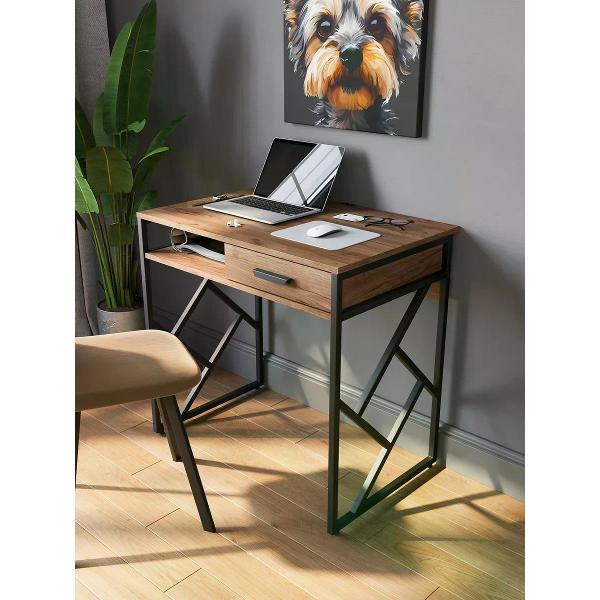 Современный письменный стол для работы и учебы размером 80 х 53 см. Можно использовать как компьютерный стол для ноутбука или для стационарного компьютера. Компактный письменный стол с выдвижным ящиком помогает поддерживать порядок. Данный небольшой офисный стол имеет надежную конструкцию, способную выдерживать нагрузку до 150 кг. Металлическое подстолье гарантирует устойчивость и долговечность. Высота стола составляет 77 см. Рабочий стол в стиле лофт идеально примыкает к стене, экономя пространство в комнате.