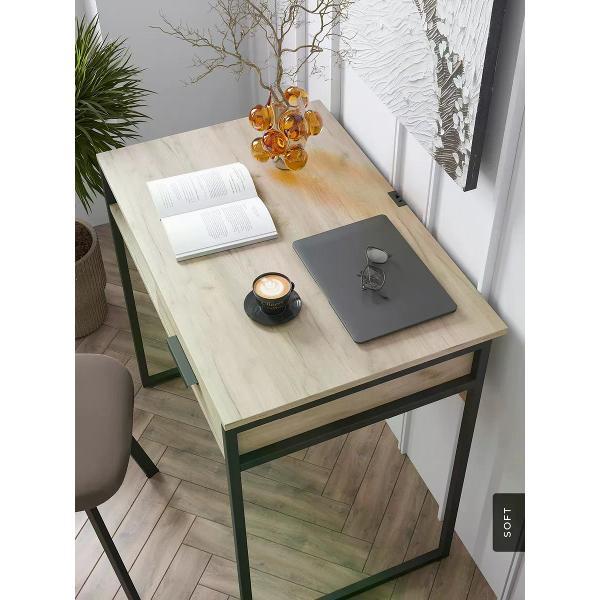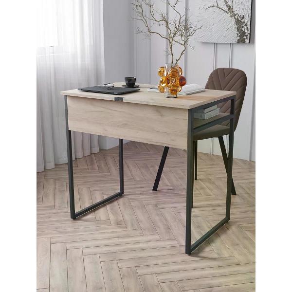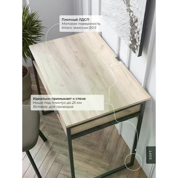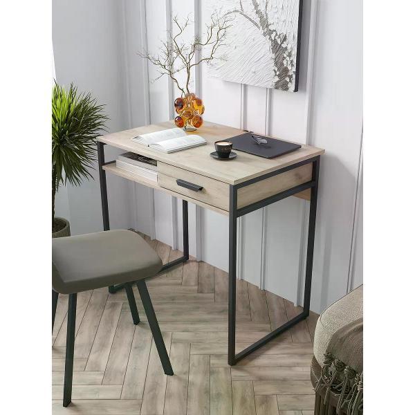 Современный письменный стол для работы и учебы размером 80 х 53 см. Можно использовать как компьютерный стол для ноутбука или для стационарного компьютера. Компактный письменный стол с выдвижным ящиком помогает поддерживать порядок. Данный небольшой офисный стол имеет надежную конструкцию, способную выдерживать нагрузку до 150 кг. Металлическое подстолье гарантирует устойчивость и долговечность. Высота стола составляет 77 см. Рабочий стол в стиле лофт идеально примыкает к стене, экономя пространство в комнате.