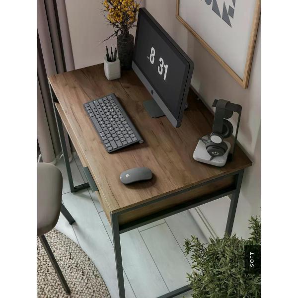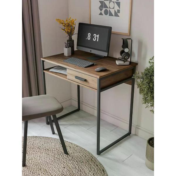 Современный письменный стол для работы и учебы размером 80 х 53 см. Можно использовать как компьютерный стол для ноутбука или для стационарного компьютера. Компактный письменный стол с выдвижным ящиком помогает поддерживать порядок. Данный небольшой офисный стол имеет надежную конструкцию, способную выдерживать нагрузку до 150 кг. Металлическое подстолье гарантирует устойчивость и долговечность. Высота стола составляет 77 см. Рабочий стол в стиле лофт идеально примыкает к стене, экономя пространство в комнате.