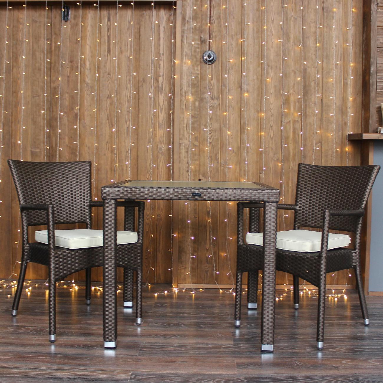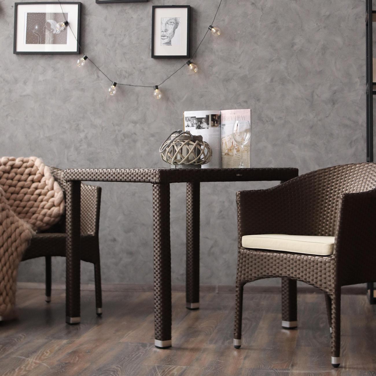 Каркас стола искусно оплетен искусственным ротангом, который не только придает ему изысканный вид, но и устойчив к ультрафиолету, влаге и перепадам температур.