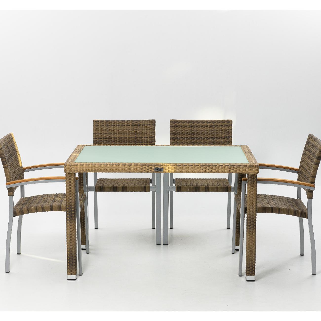 Каркас стола искусно оплетен искусственным ротангом, который не только придает ему изысканный вид, но и устойчив к ультрафиолету, влаге и перепадам температур.