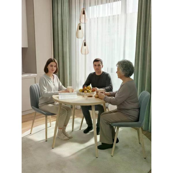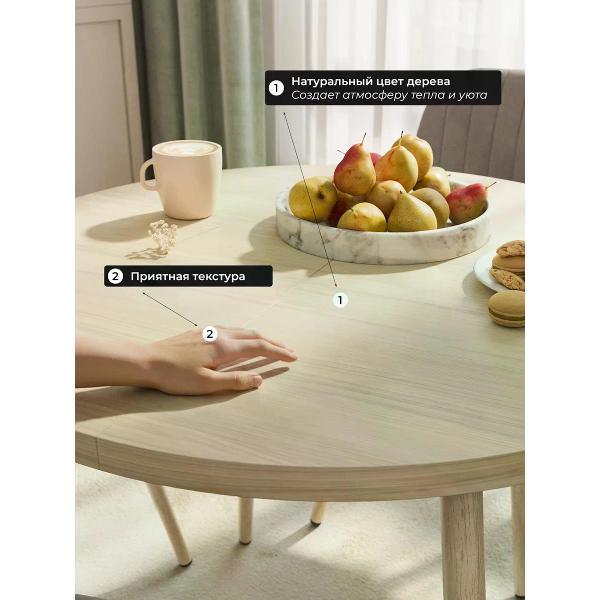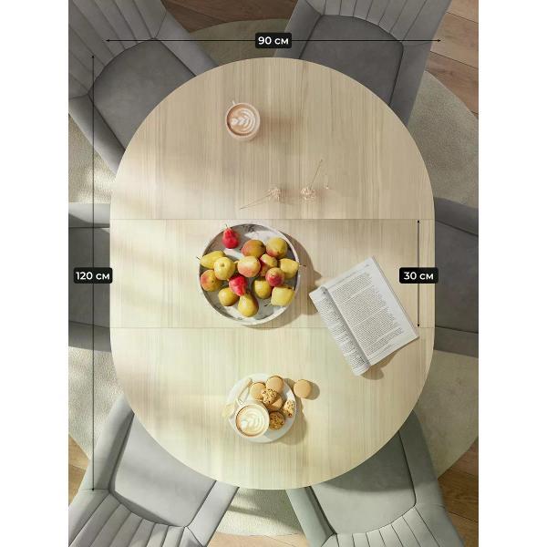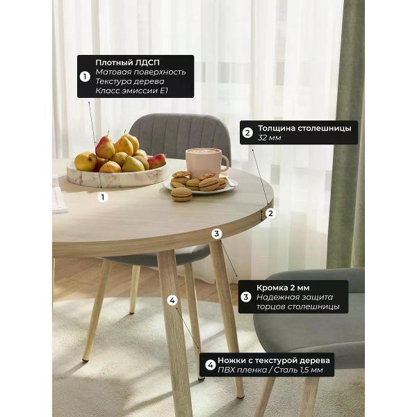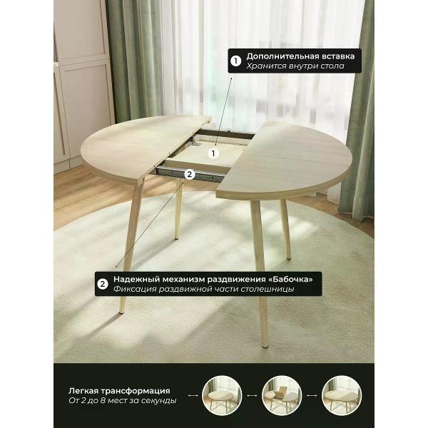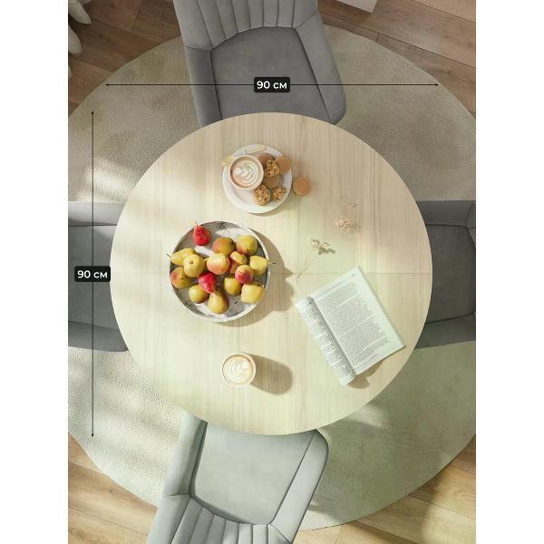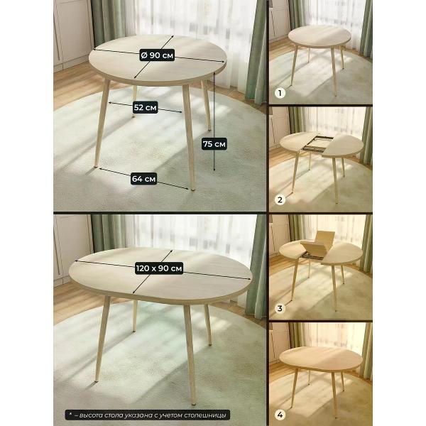 Круглый обеденный раздвижной стол на 90 см — удобное и стильное решение для современного интерьера кухни. Диаметр стола 90 см. Раскладной кухонный стол в разложенном виде составляет 120 см, что позваляет уместить 6 персон. Металлические ножки из метелла обеспечивают устойчивость и добавляют прочности всей конструкции, а покрытие из ПВХ под дерево подчеркивают стиль, который актуален для современных кухонь. Столешница толщиной 32 мм выполнена из плотного ЛДСП, ПВХ кромка 2 мм обеспечивает долговечность и легкость в уходе. В сложенном состоянии круглый стол занимает минимум места, что особенно ценно для малогабаритных помещений или комнат с ограниченной площадью. Высота кухонного стола - 75 см, оптимально для стандартных стульев и комфортной посадки взрослых людей и детей. Современный круглый стол идеально вписывается в пространство, создавая уютную атмосферу для обедов с семьей или встреч с друзьями.