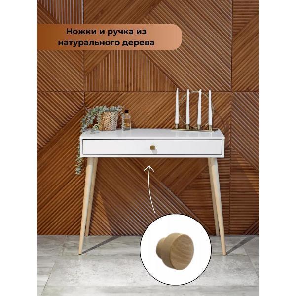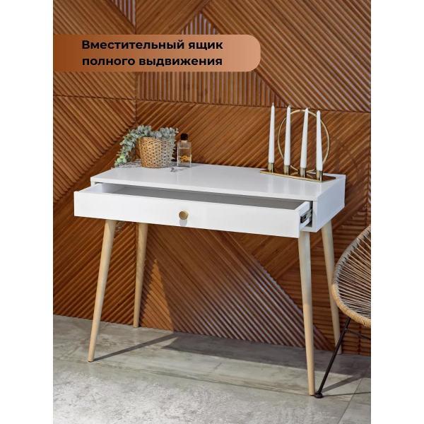 Туалетный столик имеет выдвижной ящик, который полностью выдвигается. Ящик без ручки открывается от нажатия на фасад, система Puch-open надежного производителя. Направляющие ящика телескопические шариковые и бесшумные. Опоры для мебели изготовлены из металла с долговечным порошковым покрытием.