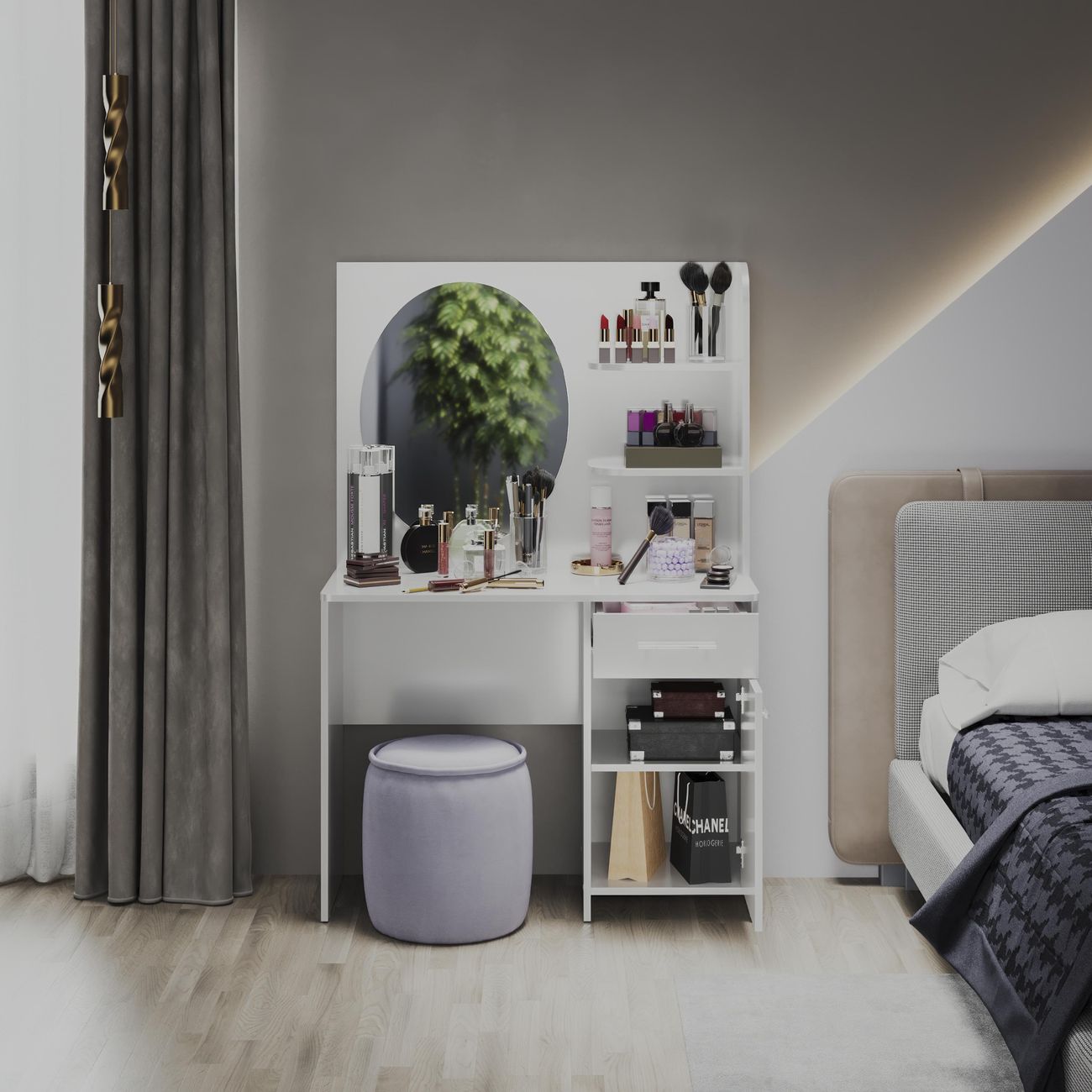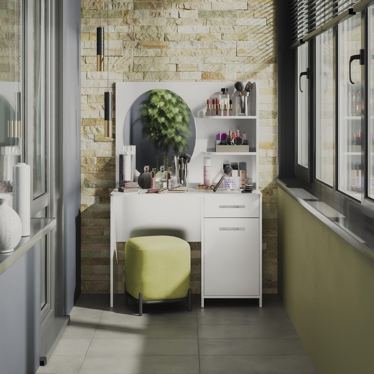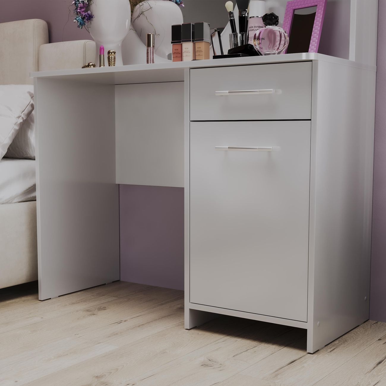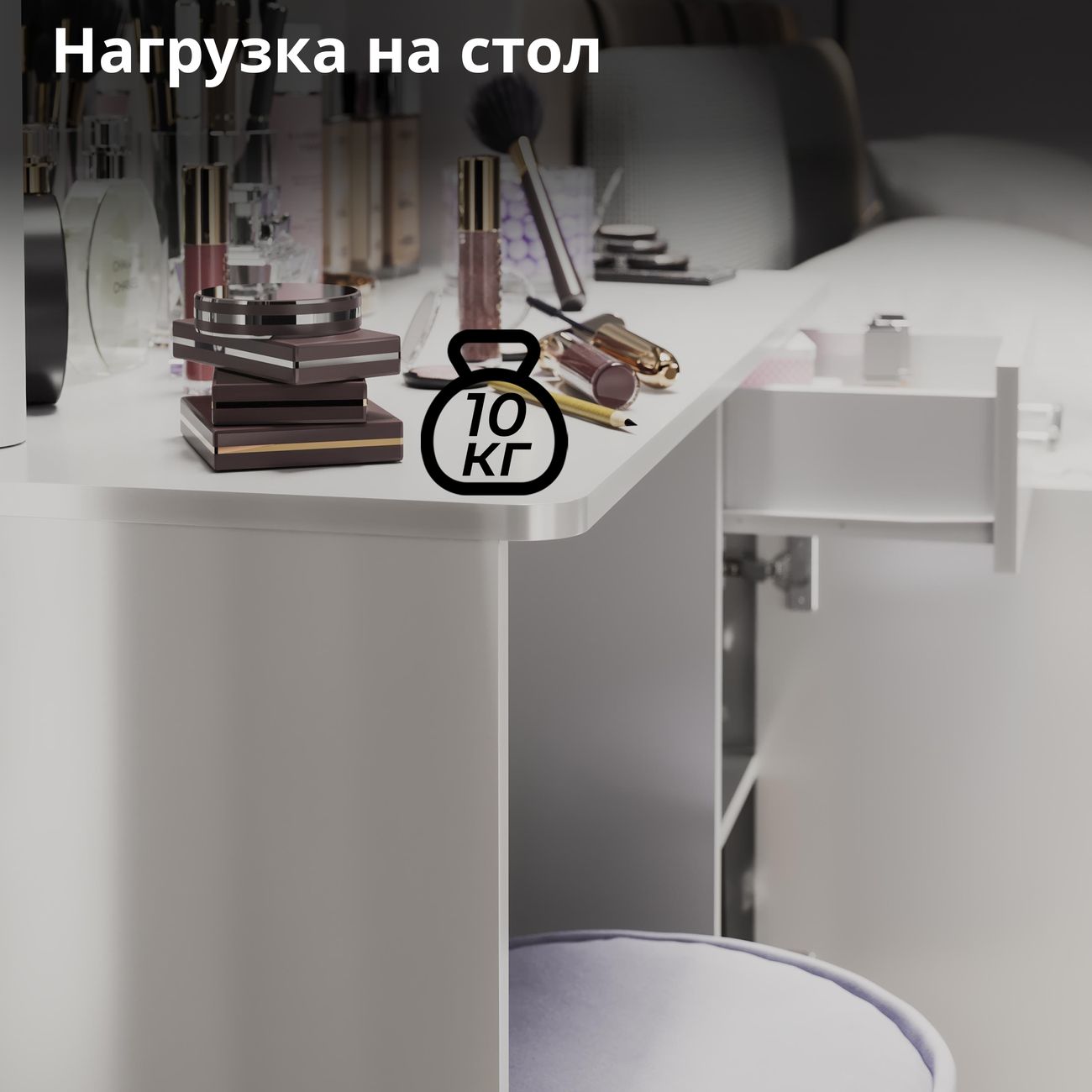 Туалетный стол Дакота от ТриЯ - это сочетание стиля и функциональности. Туалетный стол выполнен в современном стиле, что позволяет ему легко вписаться в любой интерьер. Белый цвет товара придает ему легкость и воздушность, а глянцевый эффект делает его еще более привлекательным. Столешница туалетного стола изготовлена из ЛДСП, что обеспечивает его прочность и долговечность. Толщина столешницы составляет 1,6 см, что делает ее достаточно устойчивой и надежной. Туалетный стол оснащен двумя ножками, что придает ему дополнительную устойчивость и позволяет равномерно распределить нагрузку. Особенностью туалетного стола является наличие ящика и тумбы, что позволяет хранить различные мелочи и аксессуары. Также в комплекте идет зеркало, что делает использование стола еще более удобным и практичным. Туалетный стол Дакота от ТриЯ - это не только стильный и функциональный элемент интерьера, но и удобное решение для организации пространства в спальне.