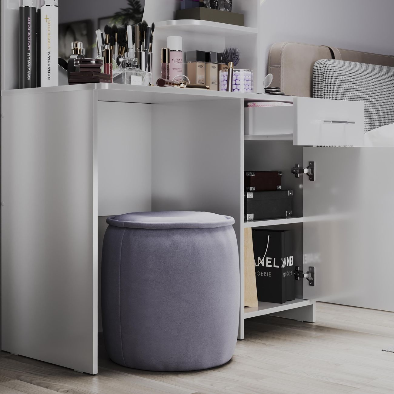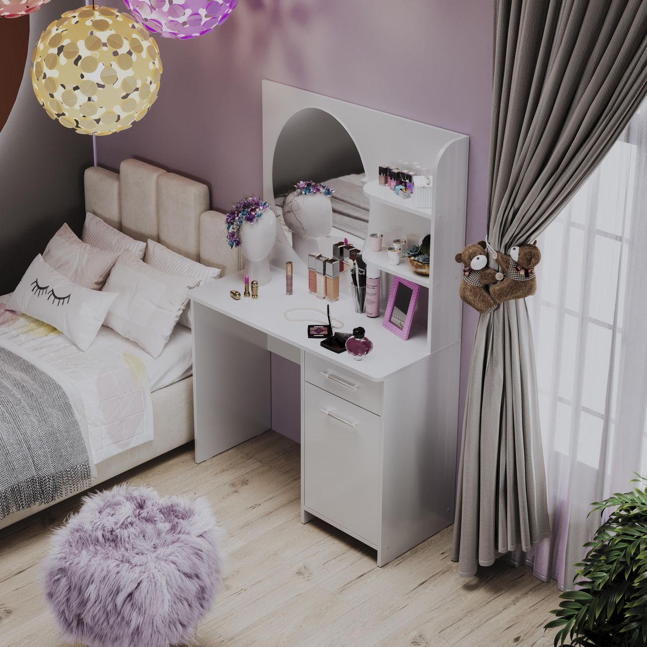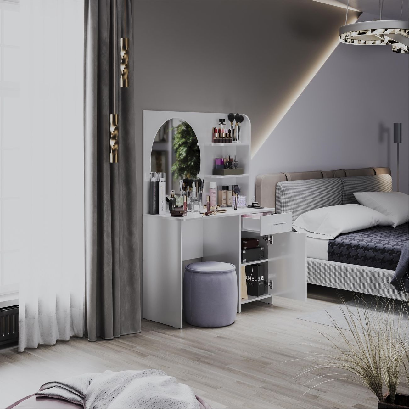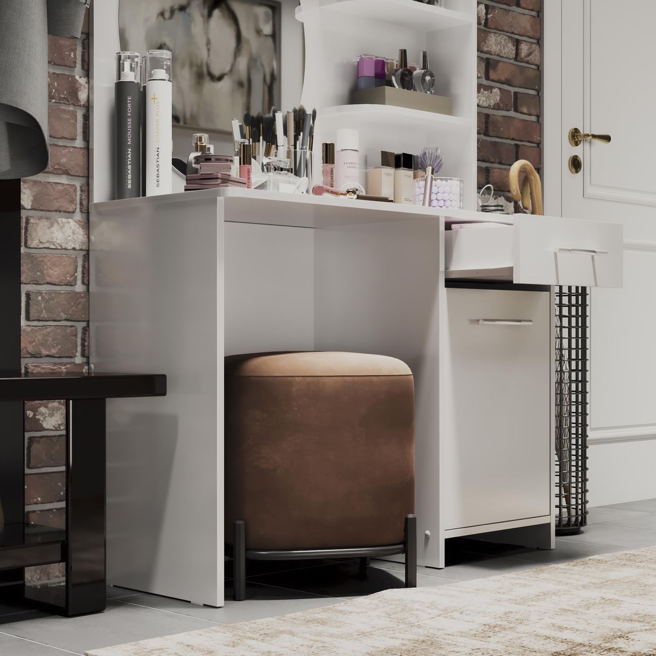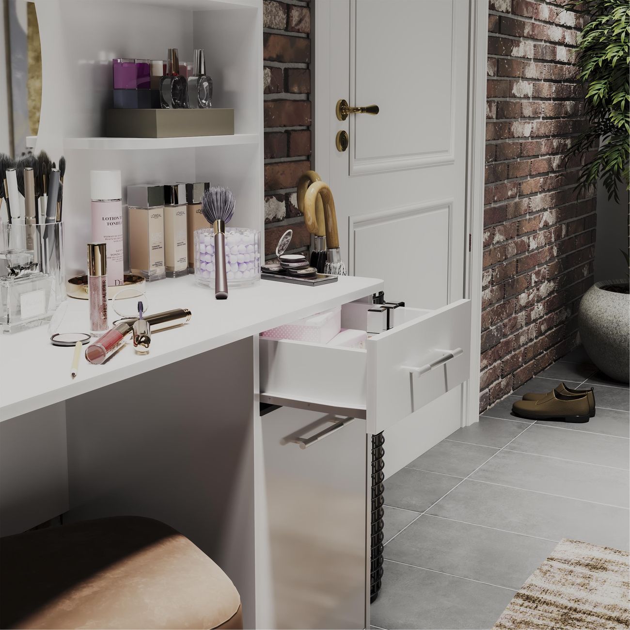 Туалетный стол Дакота от ТриЯ - это сочетание стиля и функциональности. Туалетный стол выполнен в современном стиле, что позволяет ему легко вписаться в любой интерьер. Белый цвет товара придает ему легкость и воздушность, а глянцевый эффект делает его еще более привлекательным. Столешница туалетного стола изготовлена из ЛДСП, что обеспечивает его прочность и долговечность. Толщина столешницы составляет 1,6 см, что делает ее достаточно устойчивой и надежной. Туалетный стол оснащен двумя ножками, что придает ему дополнительную устойчивость и позволяет равномерно распределить нагрузку. Особенностью туалетного стола является наличие ящика и тумбы, что позволяет хранить различные мелочи и аксессуары. Также в комплекте идет зеркало, что делает использование стола еще более удобным и практичным. Туалетный стол Дакота от ТриЯ - это не только стильный и функциональный элемент интерьера, но и удобное решение для организации пространства в спальне.