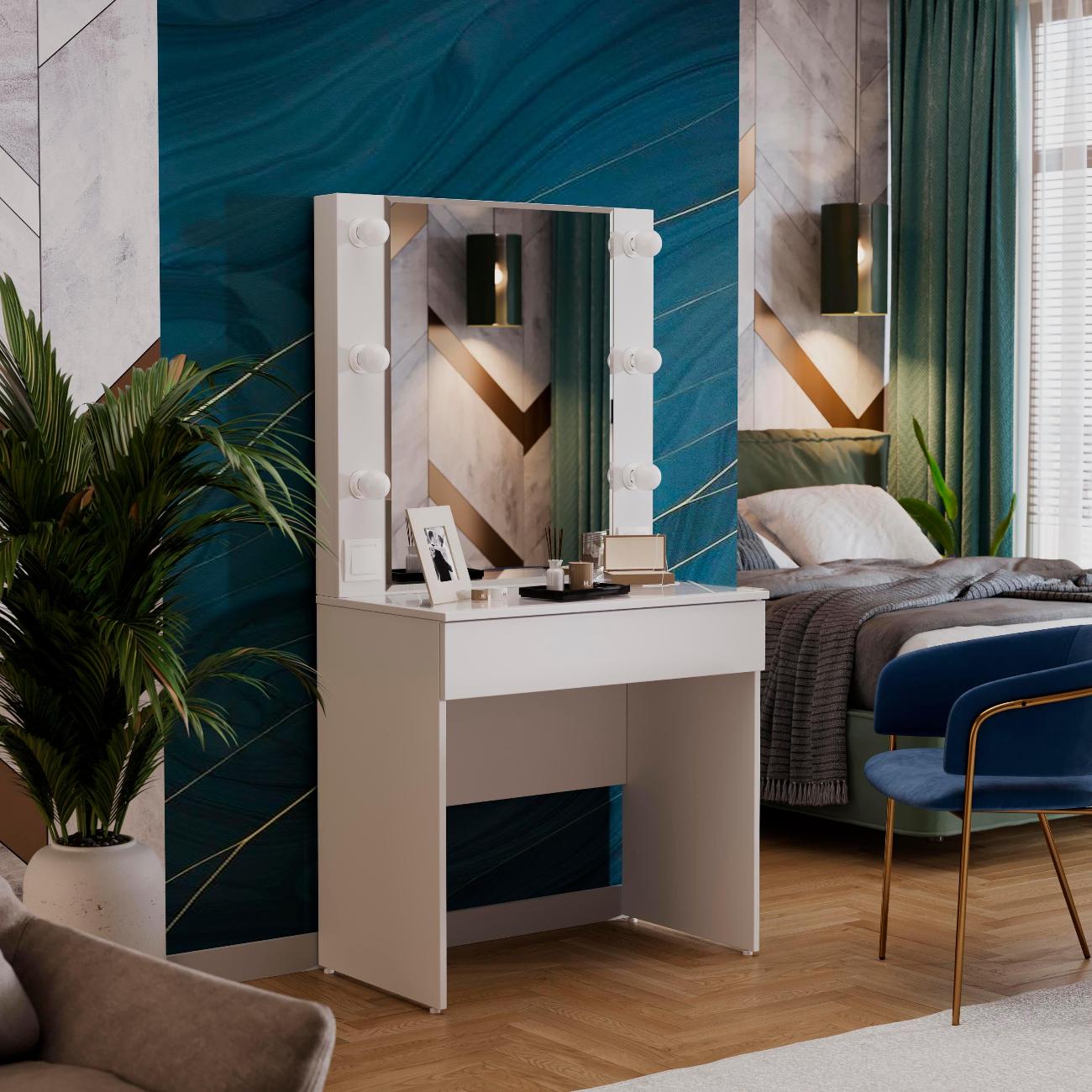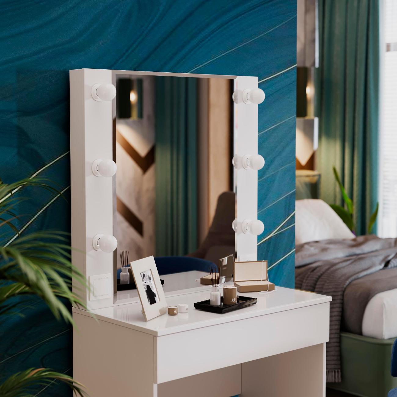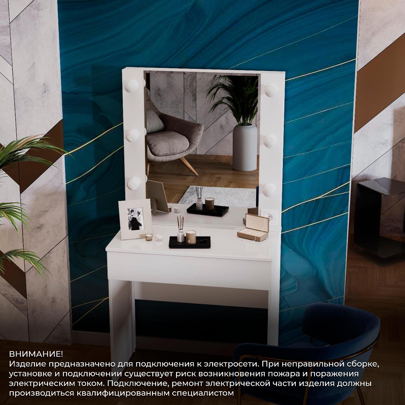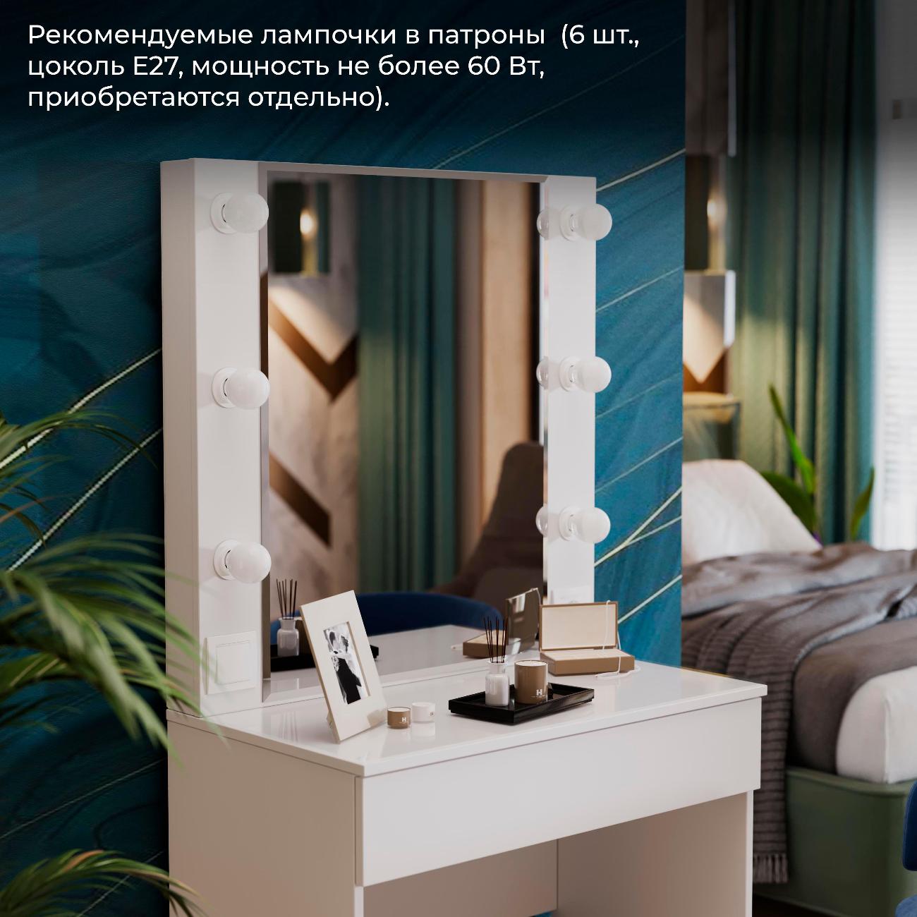 Стол туалетный «Марго» совмещает в себе изящество и функционал, которые будут к месту в любой квартире. Помимо внешней привлекательности, стол достаточно вместителен. Конструкцией предусмотрена просторная столешница со стеклом и практичный ящик под ней, где можно разместить все необходимые аксессуары и косметику. Стол имеет достаточно большое зеркало, а наличие подсветки обеспечит комфортный уход за собой, которая дает ровный и мягкий свет. Обратите внимание! Лампочки в комплект не входят!
