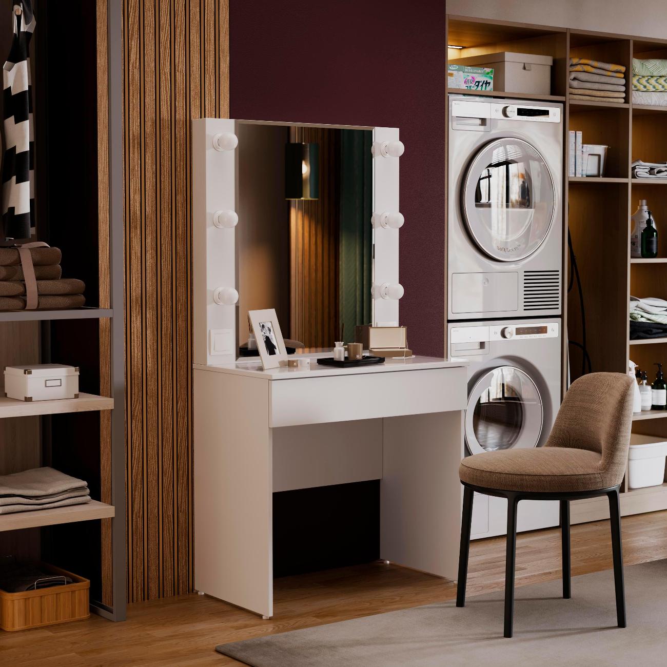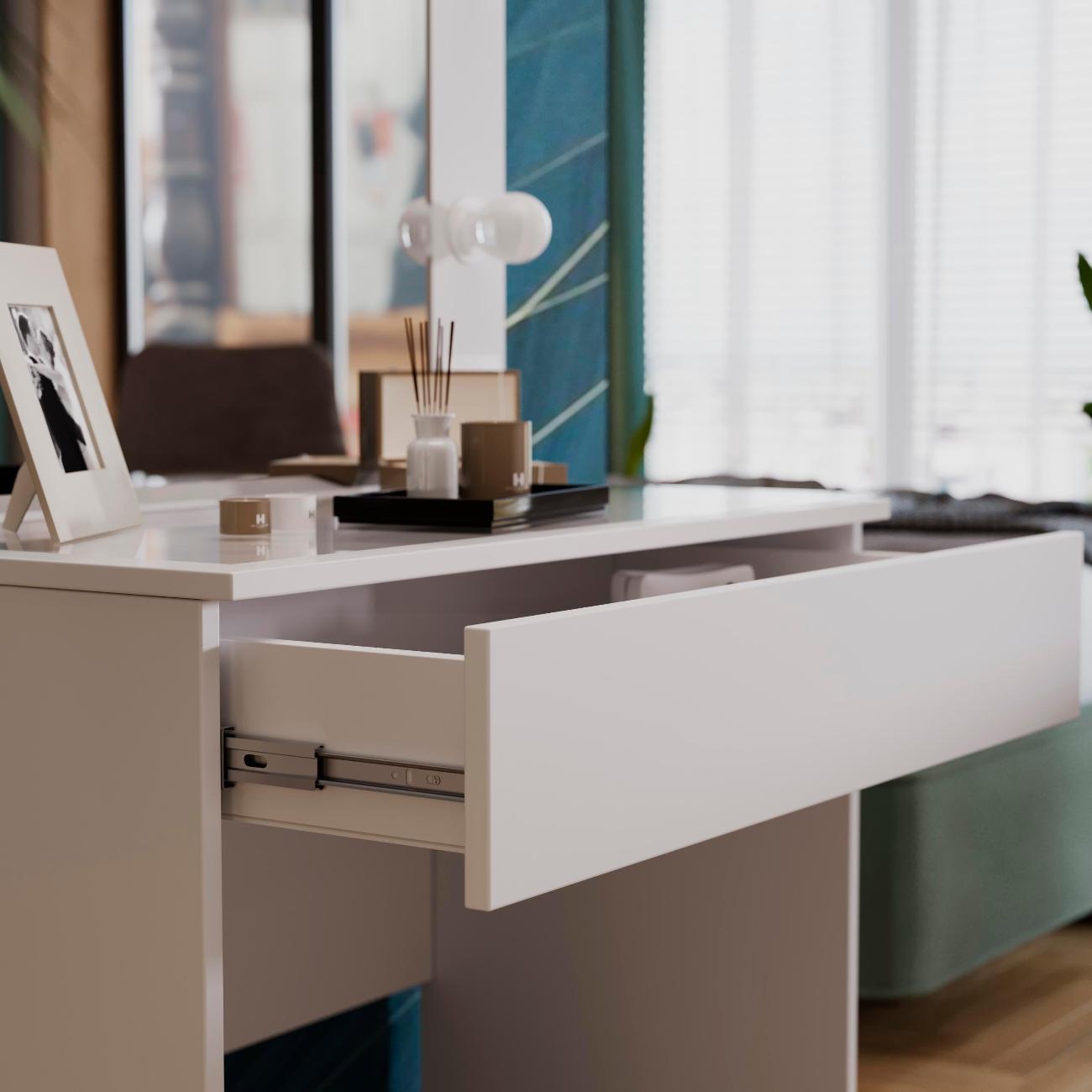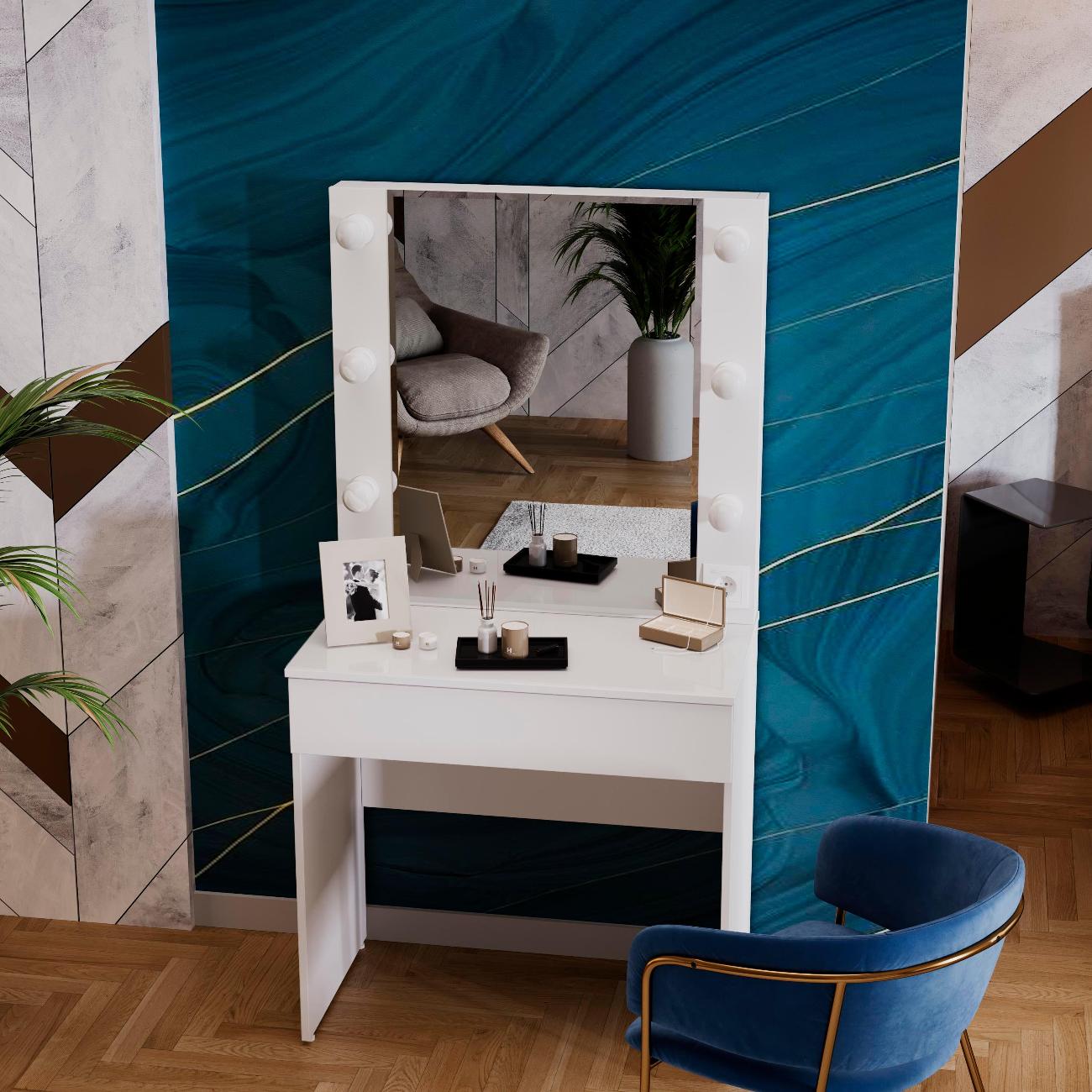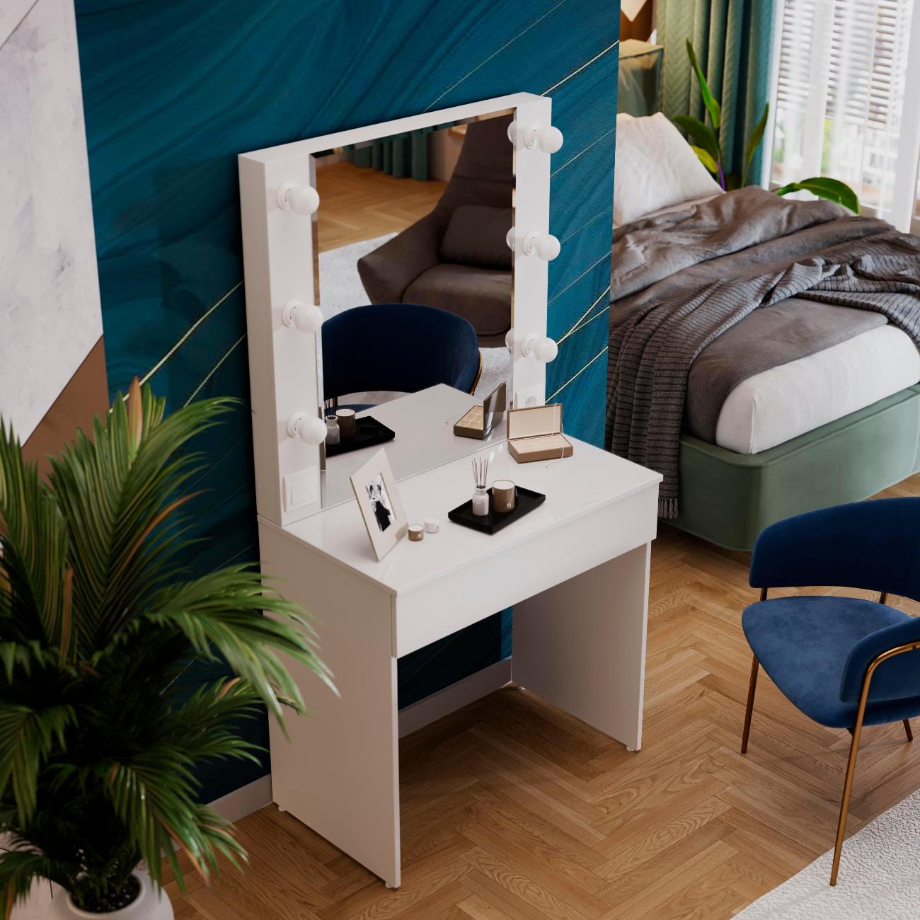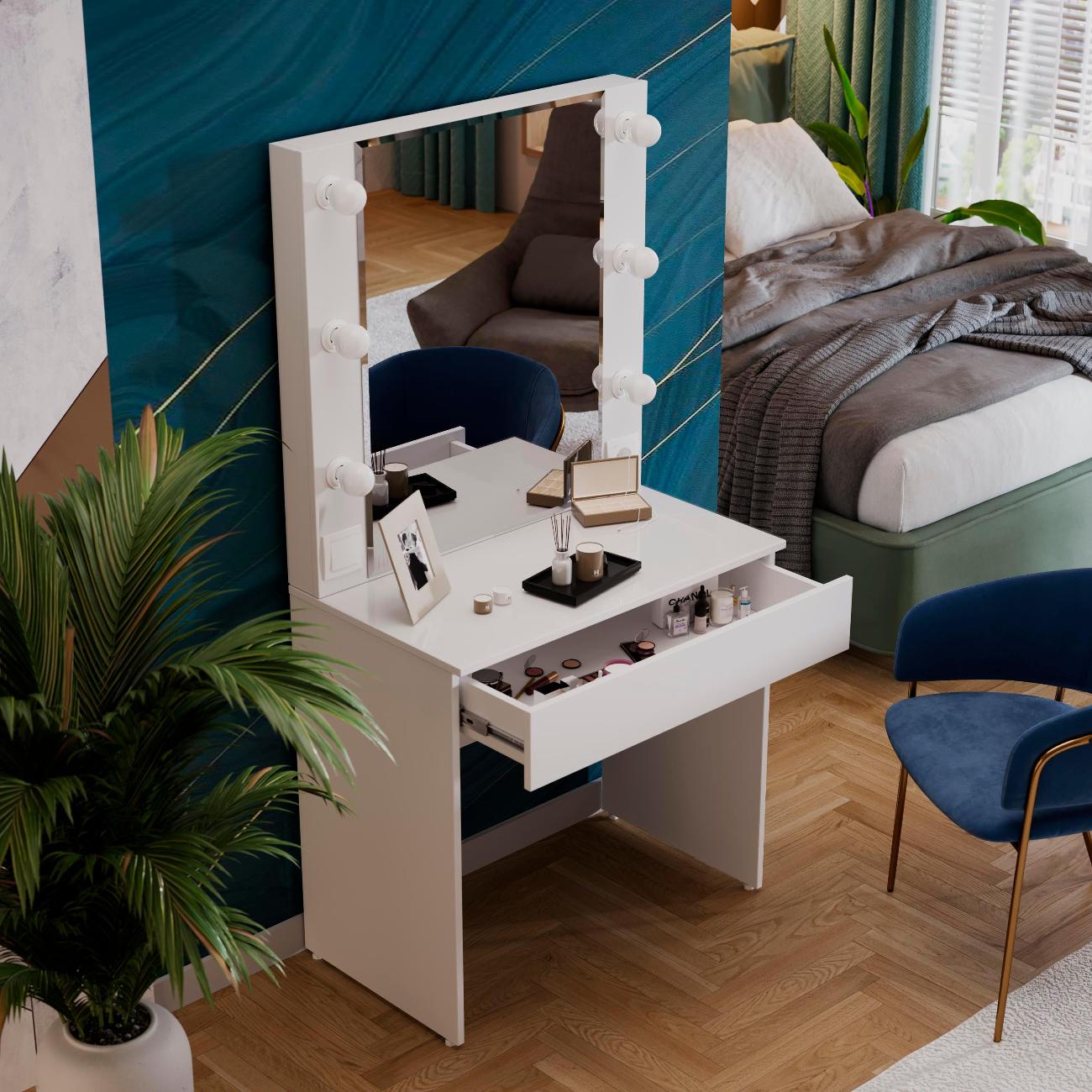 Стол туалетный «Марго» совмещает в себе изящество и функционал, которые будут к месту в любой квартире. Помимо внешней привлекательности, стол достаточно вместителен. Конструкцией предусмотрена просторная столешница со стеклом и практичный ящик под ней, где можно разместить все необходимые аксессуары и косметику. Стол имеет достаточно большое зеркало, а наличие подсветки обеспечит комфортный уход за собой, которая дает ровный и мягкий свет. Обратите внимание! Лампочки в комплект не входят!