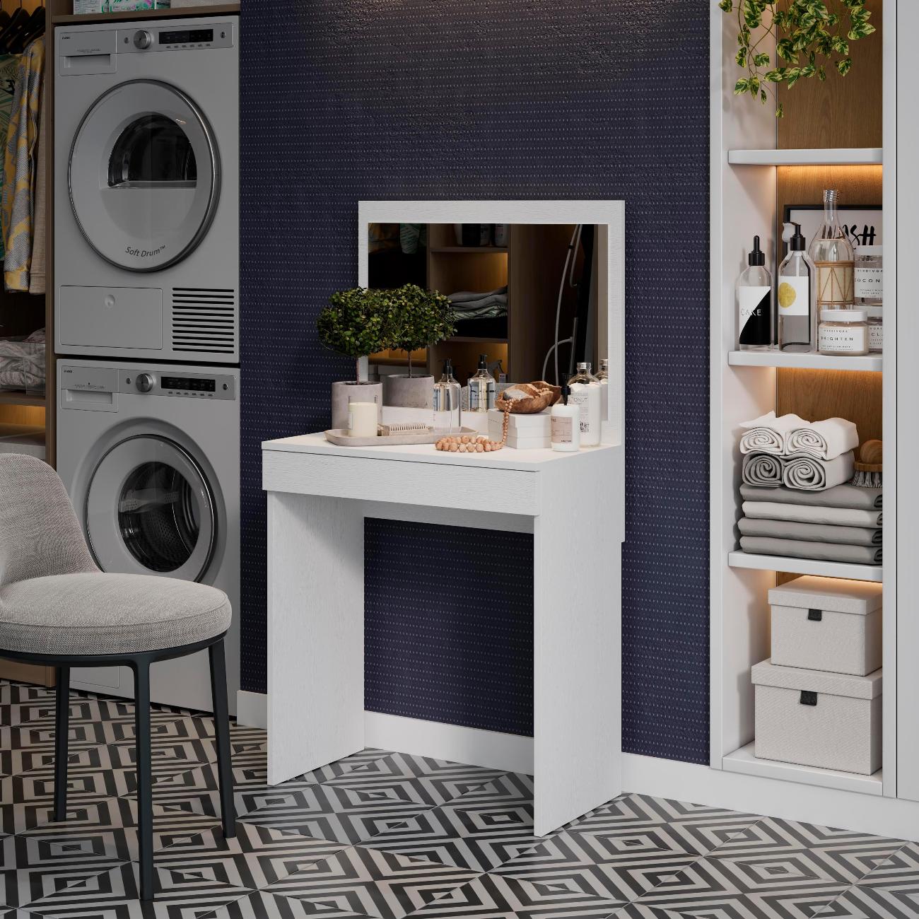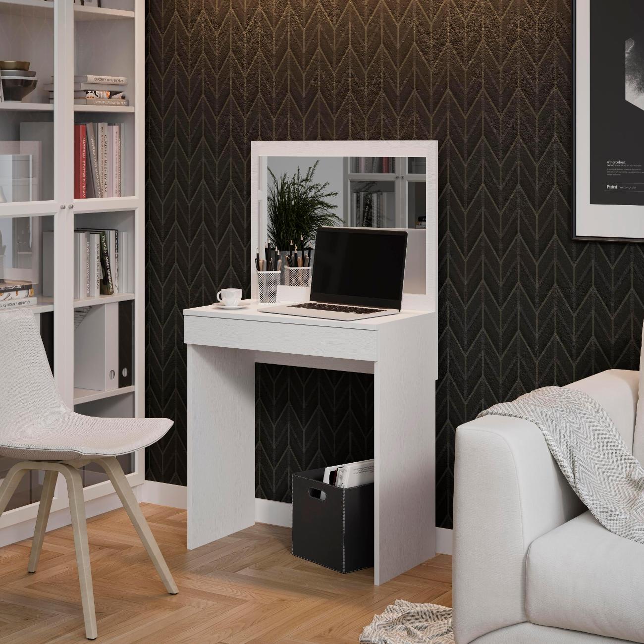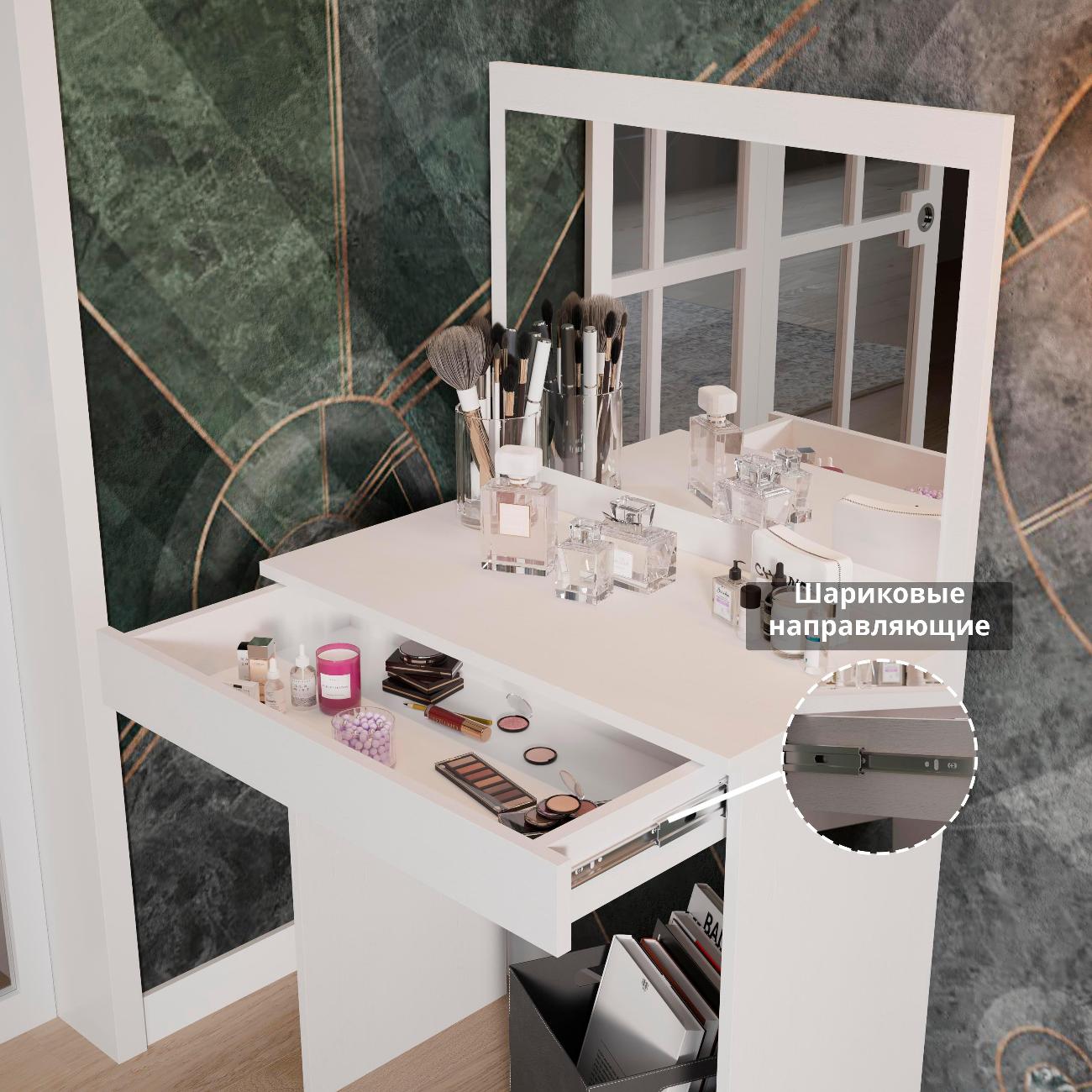 Белый туалетный стол Никки гармонично впишется в любой современный интерьер. Классический минималистичный дизайн, сбалансированная конструкция, доступная цена. Дамский столик предназначен для размещения на нем косметики, парфюмерии, украшения и привести себя в порядок перед зеркалом. Модель оборудована удобной столешницей, выдвижным ящиком для защиты ваших косметических средств от пыли и прямых солнечных лучей и зеркалом. Выдвижной ящик оснащен качественной фурнитурой - шариковые направляющие полного выдвижения. Столик для макияжа оформлен в текстуре Белый Ясень, она является эстетически красивой, универсальной и приятной на ощупь. Качественные материалы делают стол износостойким, способным прослужить многие годы - используется экологически безопасный ЛДСП - 16 мм. Благодаря трюмо ежедневные процедуры и нанесение макияжа станет комфортнее, удобнее, практичнее и быстрее. Он представляет собой качественной продукцией и экологически чистым изделием. Поставляется в разобранном виде. Все технические отверстия сделаны на производстве, фурнитура для сборки и инструкция идет в комплекте, также инструкцию Вы можете найти в карточке товара. Прежде чем приступить к сборке, необходимо убедиться в качестве, количестве и соответствии всех деталей. Если таковые выявлены, незамедлительно свяжитесь с площадкой и продавцом, для разрешения вопроса, не приступая к сбору изделия.