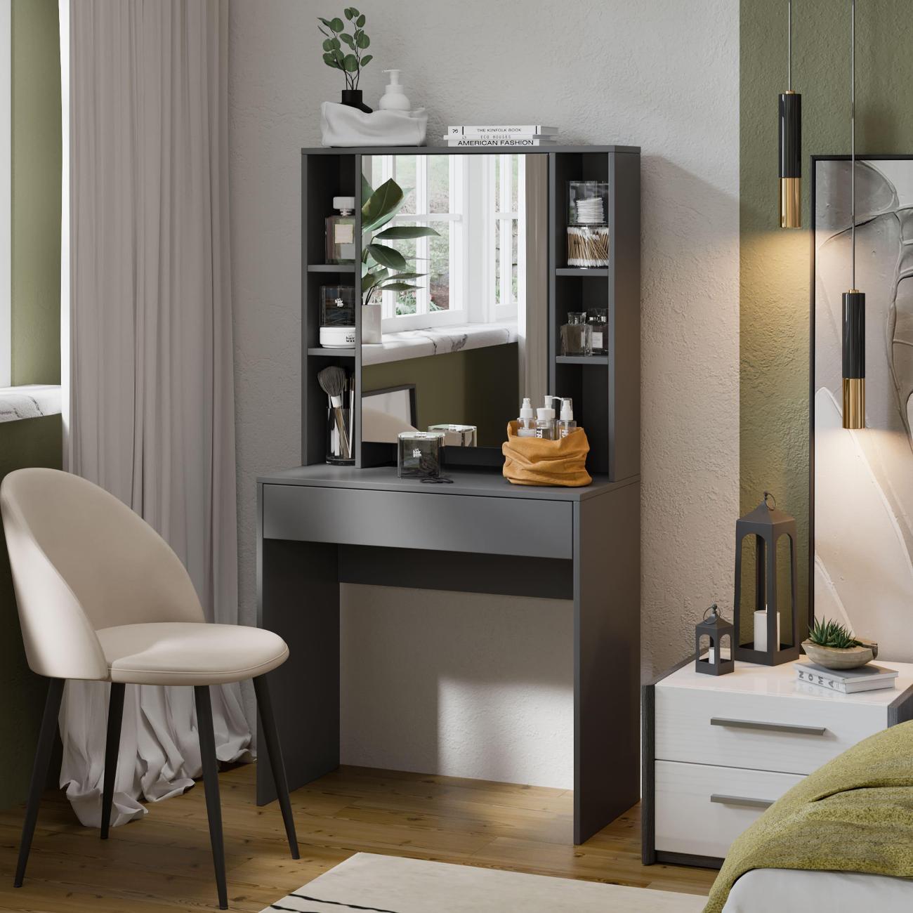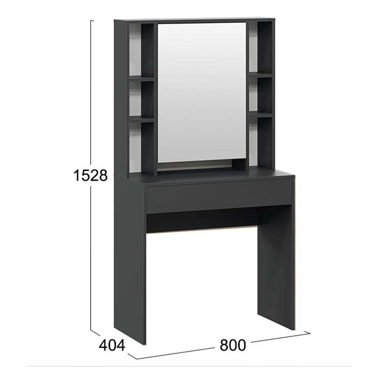 Туалетный стол Салли - идеальное место для проведения ежедневных процедур, нанесения макияжа, разнообразие расцветок изделия позволяют приобрести подходящую модель для помещения, оформленного в любом стиле. Классический и минималистичный дизайн, сбалансированная конструкция, доступная цена. Дамский столик предназначен для размещения на нем косметики, парфюмерии, украшения и привести себя в порядок перед зеркалом. Модель оборудована удобной столешницей, выдвижным ящиком для защиты ваших косметических средств от пыли и прямых солнечных лучей, зеркалом и дополнительных полочек по бокам. Также есть скрытый ящик с небольшими полочками за зеркалом. Выдвижной ящик оснащен качественной фурнитурой - шариковые направляющие полного выдвижения. Качественные материалы делают столик для макияжа износостойким, способным прослужить многие годы - используется экологически безопасный ЛДСП - 16 мм. Благодаря трюмо ежедневные процедуры и нанесение макияжа станет комфортнее, удобнее, практичнее и быстрее. Поставляется в разобранном виде. Все технические отверстия сделаны на производстве, фурнитура для сборки и инструкция идет в комплекте, также инструкцию Вы можете найти в карточке товара. Прежде чем приступить к сборке, необходимо убедиться в качестве, количестве и соответствии всех деталей. Если таковые выявлены, незамедлительно свяжитесь с площадкой и продавцом, для разрешения вопроса, не приступая к сбору изделия.