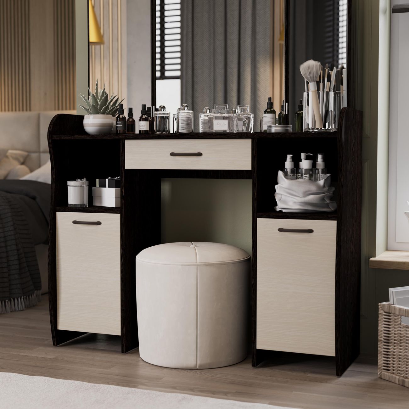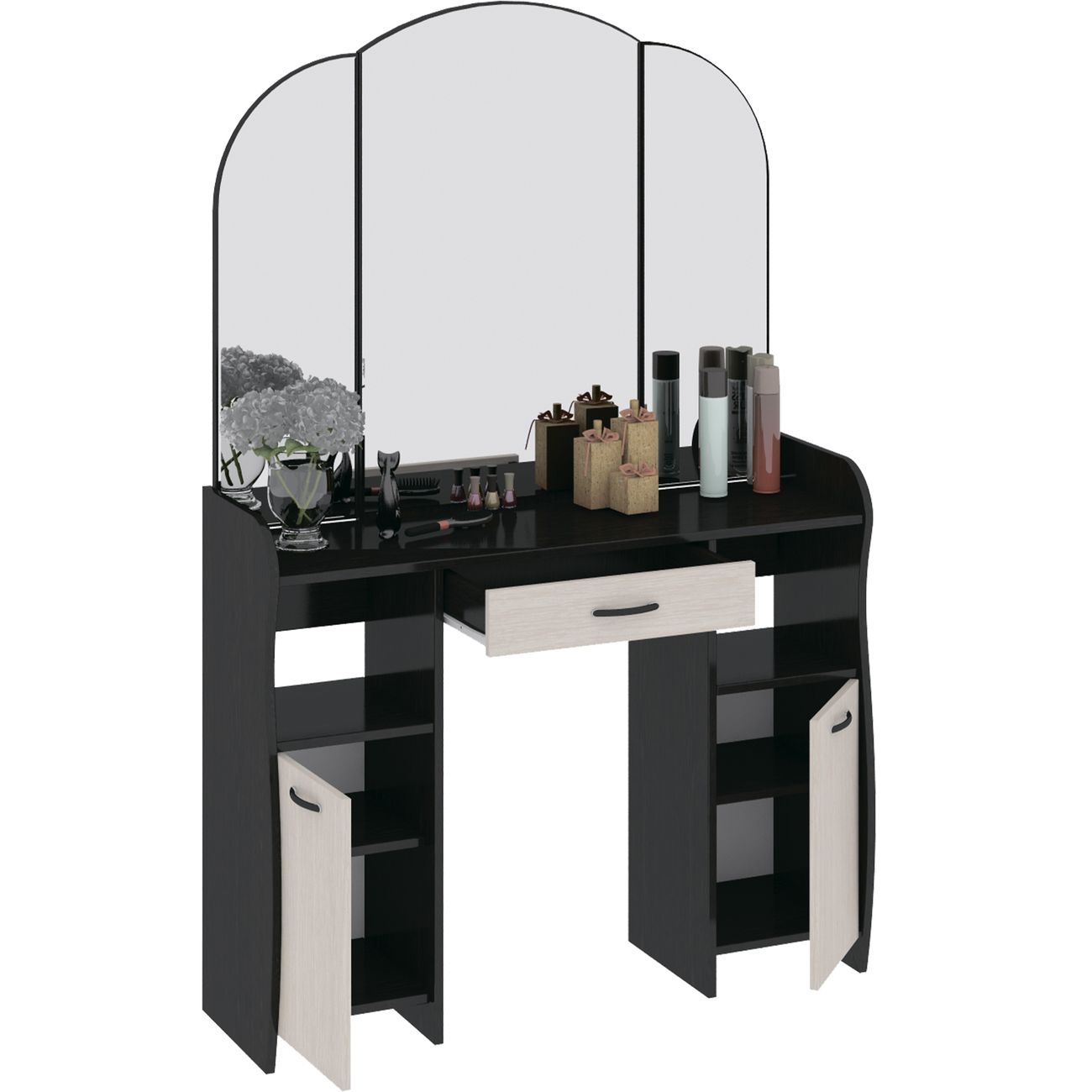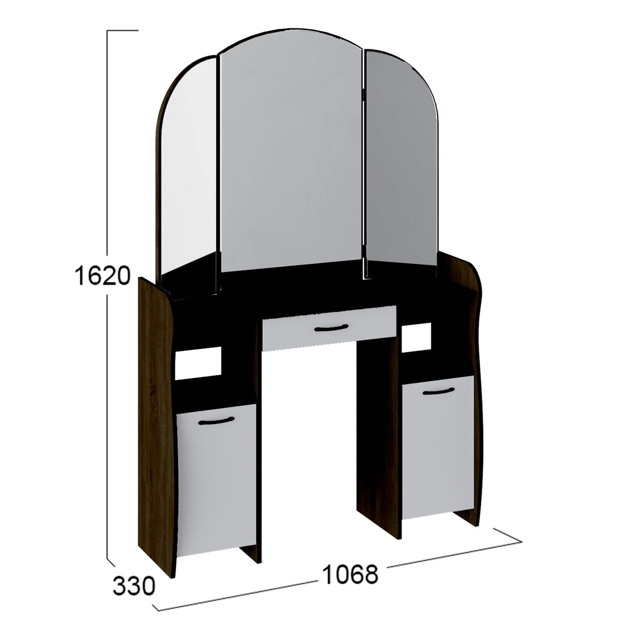 Туалетный стол София тип 2 является лучшим удобным вариантом организации места для ухода за собой и нанесения макияжа для любой девушки, разнообразие расцветок изделия позволяют приобрести подходящую модель для помещения, оформленного в любом стиле. Классический и минималистичный дизайн, сбалансированная конструкция, доступная цена. Дамский столик предназначен для размещения на нем косметики, парфюмерии, украшения и привести себя в порядок перед зеркалом. Материалы Модель оборудована удобной столешницей, выдвижным ящиком для защиты ваших косметических средств от пыли и прямых солнечных лучей, ящиками по бокам и регулируемыми зеркалами, которые придают изюминку в дизайне столика. Качественные материалы делают столик для макияжа износостойким, способным прослужить многие годы - используется экологически безопасный ЛДСП - 16 мм. Благодаря трюмо ежедневные процедуры и нанесение макияжа станет комфортнее, удобнее, практичнее и быстрее. Дополнительная информация Поставляется в разобранном виде. Все технические отверстия сделаны на производстве, фурнитура для сборки и инструкция идет в комплекте, также инструкцию Вы можете найти в карточке товара. Прежде чем приступить к сборке, необходимо убедиться в качестве, количестве и соответствии всех деталей. Если таковые выявлены, незамедлительно свяжитесь с площадкой и продавцом, для разрешения вопроса, не приступая к сбору изделия. Товар после сборки возврату и обмену не подлежит.