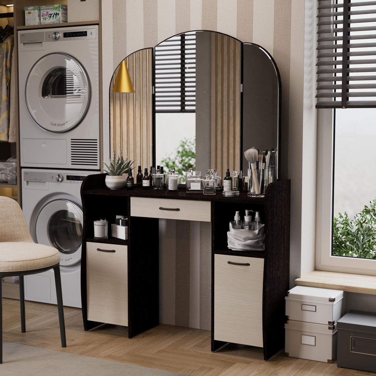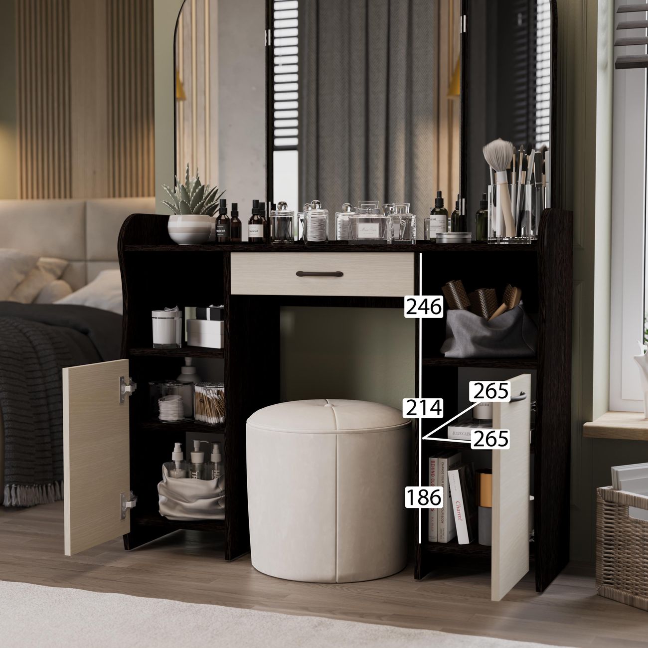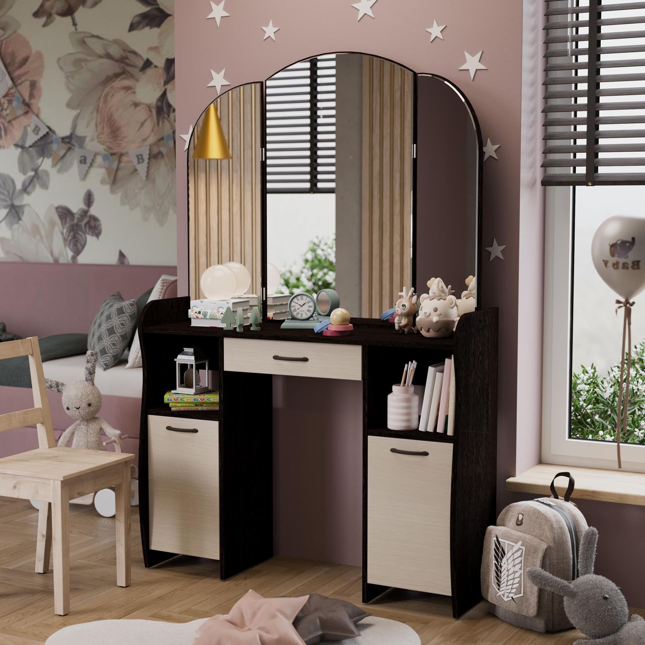 Туалетный стол София тип 2 является лучшим удобным вариантом организации места для ухода за собой и нанесения макияжа для любой девушки, разнообразие расцветок изделия позволяют приобрести подходящую модель для помещения, оформленного в любом стиле. Классический и минималистичный дизайн, сбалансированная конструкция, доступная цена. Дамский столик предназначен для размещения на нем косметики, парфюмерии, украшения и привести себя в порядок перед зеркалом. Материалы Модель оборудована удобной столешницей, выдвижным ящиком для защиты ваших косметических средств от пыли и прямых солнечных лучей, ящиками по бокам и регулируемыми зеркалами, которые придают изюминку в дизайне столика. Качественные материалы делают столик для макияжа износостойким, способным прослужить многие годы - используется экологически безопасный ЛДСП - 16 мм. Благодаря трюмо ежедневные процедуры и нанесение макияжа станет комфортнее, удобнее, практичнее и быстрее. Дополнительная информация Поставляется в разобранном виде. Все технические отверстия сделаны на производстве, фурнитура для сборки и инструкция идет в комплекте, также инструкцию Вы можете найти в карточке товара. Прежде чем приступить к сборке, необходимо убедиться в качестве, количестве и соответствии всех деталей. Если таковые выявлены, незамедлительно свяжитесь с площадкой и продавцом, для разрешения вопроса, не приступая к сбору изделия. Товар после сборки возврату и обмену не подлежит.