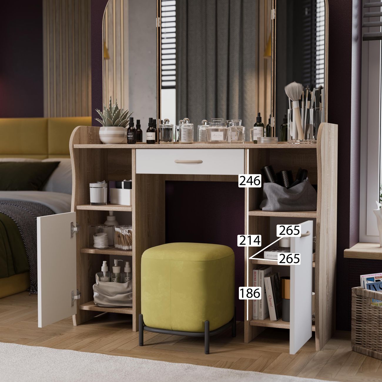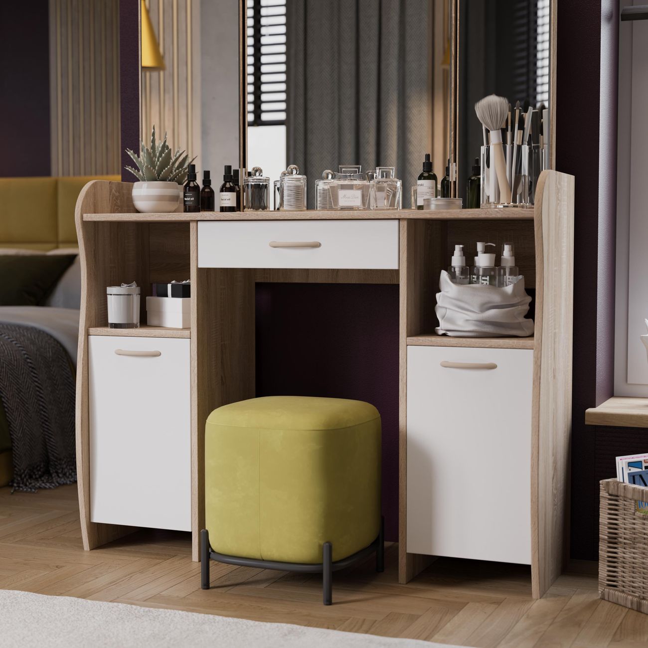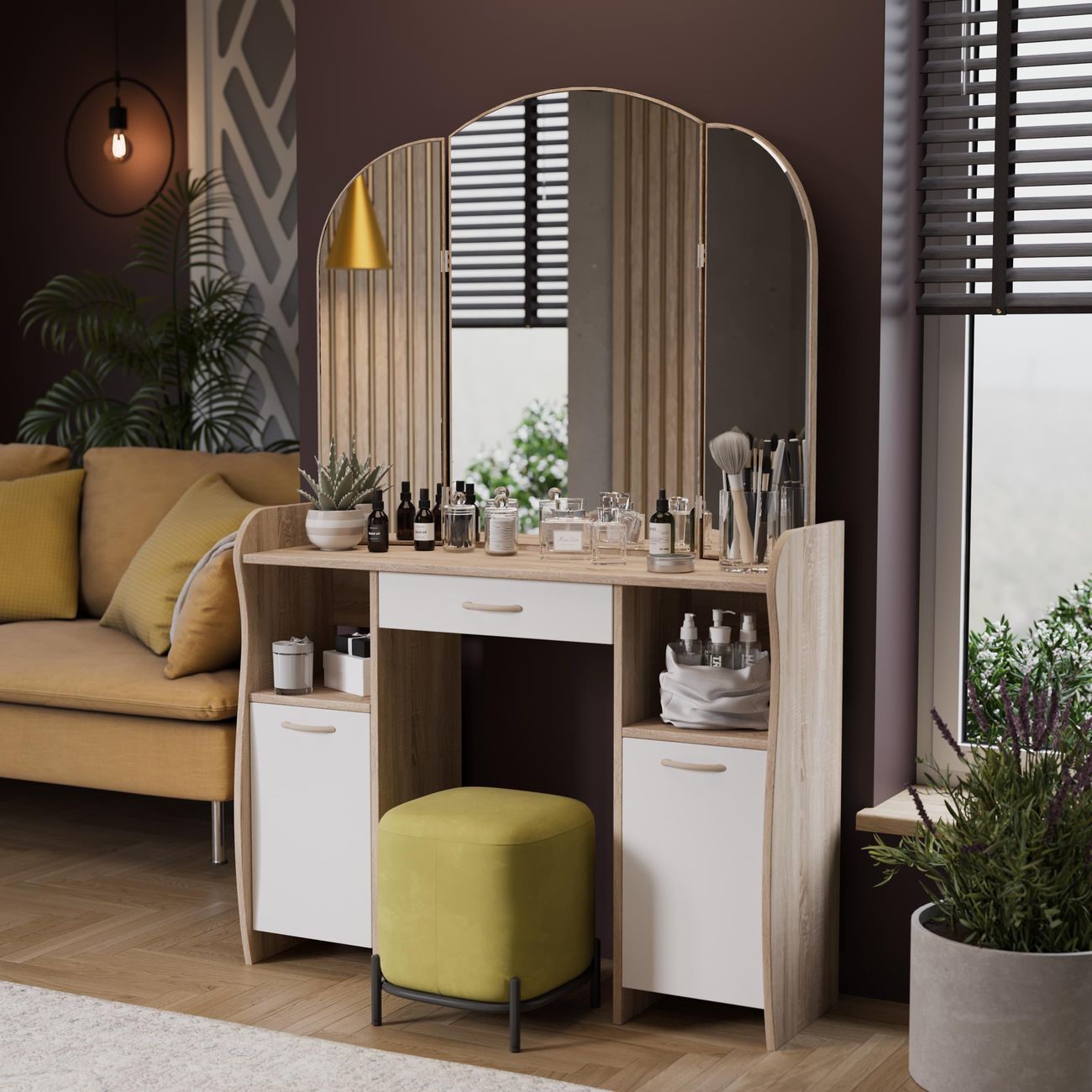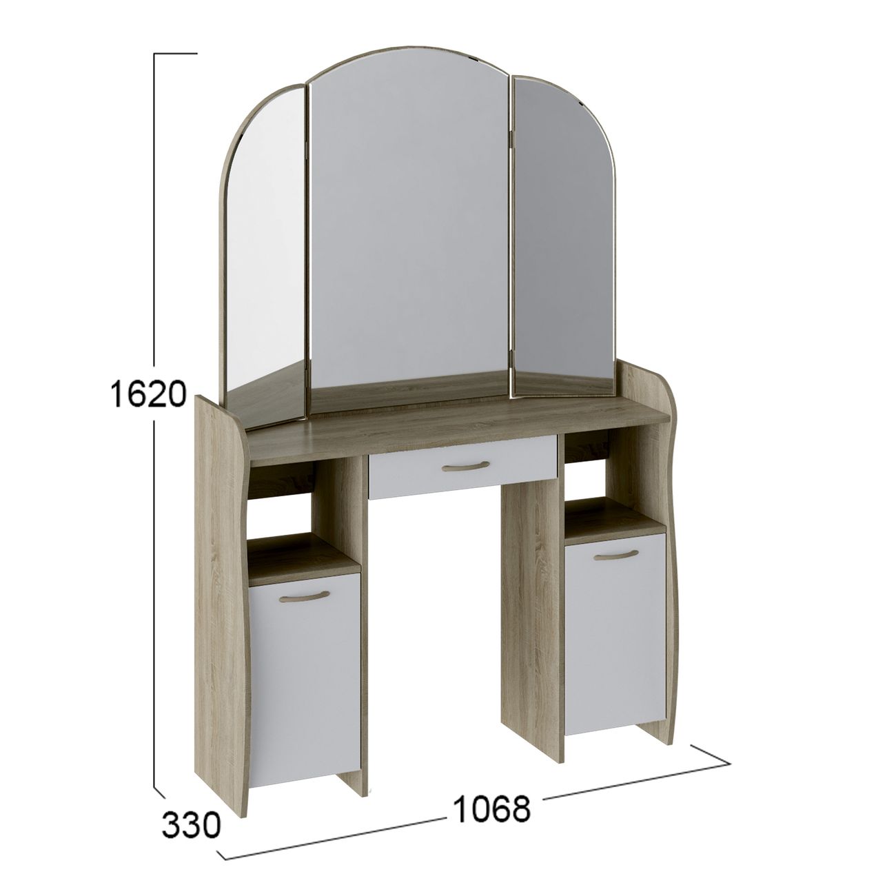 Туалетный стол София тип 2 является лучшим удобным вариантом организации места для ухода за собой и нанесения макияжа для любой девушки, разнообразие расцветок изделия позволяют приобрести подходящую модель для помещения, оформленного в любом стиле. Классический и минималистичный дизайн, сбалансированная конструкция, доступная цена. Дамский столик предназначен для размещения на нем косметики, парфюмерии, украшения и привести себя в порядок перед зеркалом. Материалы Модель оборудована удобной столешницей, выдвижным ящиком для защиты ваших косметических средств от пыли и прямых солнечных лучей, ящиками по бокам и регулируемыми зеркалами, которые придают изюминку в дизайне столика. Качественные материалы делают столик для макияжа износостойким, способным прослужить многие годы - используется экологически безопасный ЛДСП - 16 мм. Благодаря трюмо ежедневные процедуры и нанесение макияжа станет комфортнее, удобнее, практичнее и быстрее. Дополнительная информация Поставляется в разобранном виде. Все технические отверстия сделаны на производстве, фурнитура для сборки и инструкция идет в комплекте, также инструкцию Вы можете найти в карточке товара. Прежде чем приступить к сборке, необходимо убедиться в качестве, количестве и соответствии всех деталей. Если таковые выявлены, незамедлительно свяжитесь с площадкой и продавцом, для разрешения вопроса, не приступая к сбору изделия. Товар после сборки возврату и обмену не подлежит.