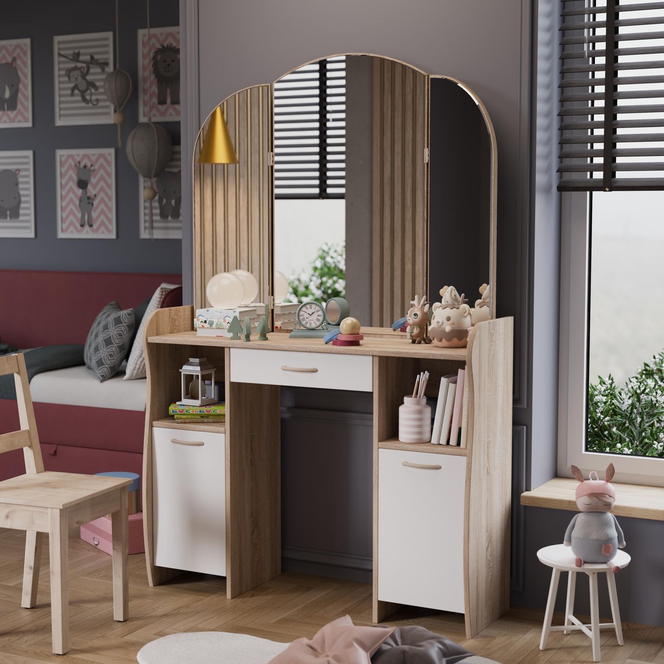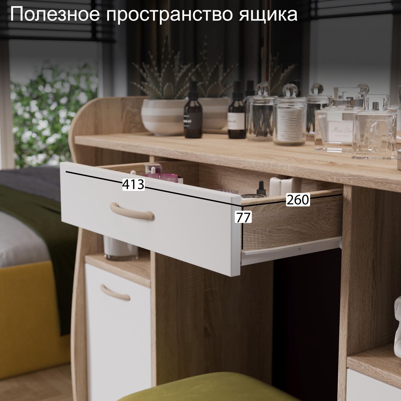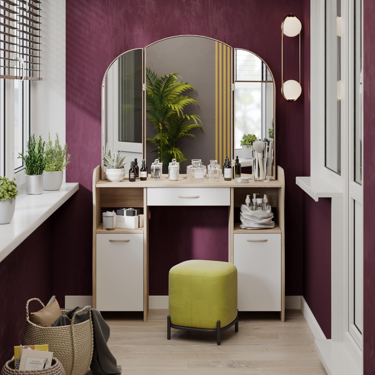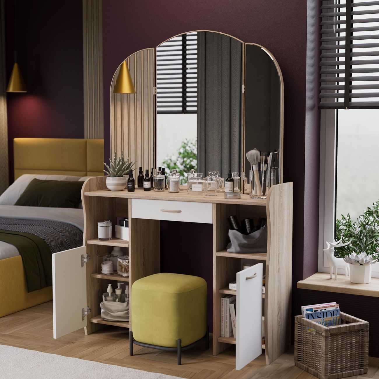 Туалетный стол София тип 2 является лучшим удобным вариантом организации места для ухода за собой и нанесения макияжа для любой девушки, разнообразие расцветок изделия позволяют приобрести подходящую модель для помещения, оформленного в любом стиле. Классический и минималистичный дизайн, сбалансированная конструкция, доступная цена. Дамский столик предназначен для размещения на нем косметики, парфюмерии, украшения и привести себя в порядок перед зеркалом. Материалы Модель оборудована удобной столешницей, выдвижным ящиком для защиты ваших косметических средств от пыли и прямых солнечных лучей, ящиками по бокам и регулируемыми зеркалами, которые придают изюминку в дизайне столика. Качественные материалы делают столик для макияжа износостойким, способным прослужить многие годы - используется экологически безопасный ЛДСП - 16 мм. Благодаря трюмо ежедневные процедуры и нанесение макияжа станет комфортнее, удобнее, практичнее и быстрее. Дополнительная информация Поставляется в разобранном виде. Все технические отверстия сделаны на производстве, фурнитура для сборки и инструкция идет в комплекте, также инструкцию Вы можете найти в карточке товара. Прежде чем приступить к сборке, необходимо убедиться в качестве, количестве и соответствии всех деталей. Если таковые выявлены, незамедлительно свяжитесь с площадкой и продавцом, для разрешения вопроса, не приступая к сбору изделия. Товар после сборки возврату и обмену не подлежит.