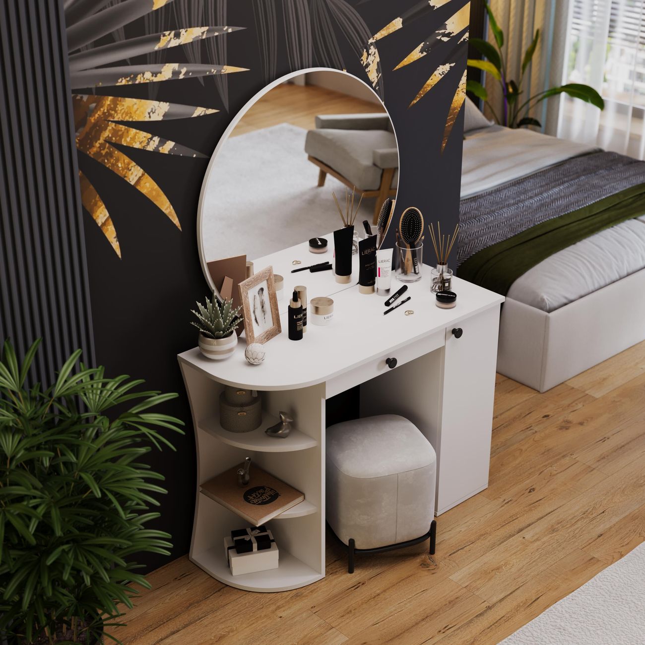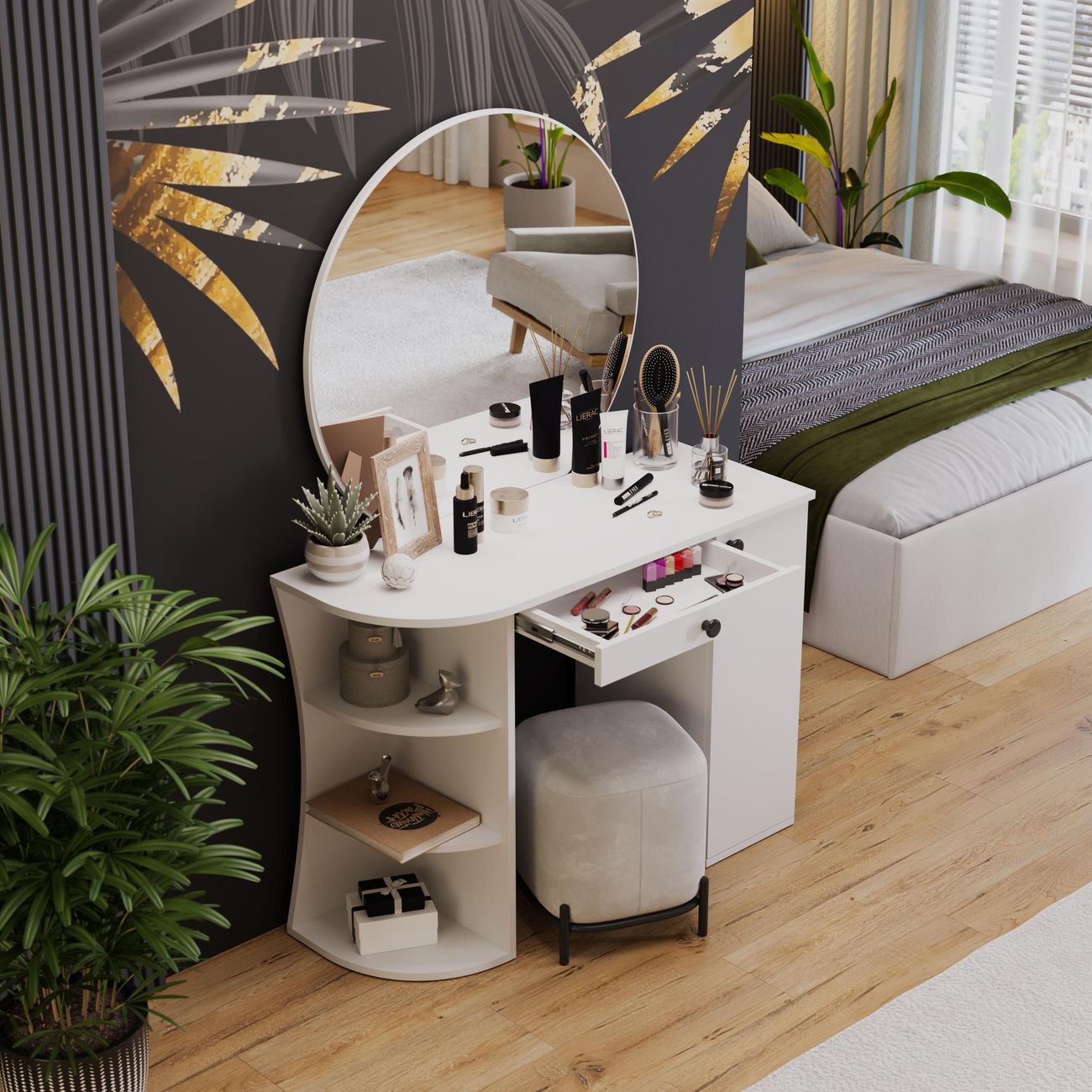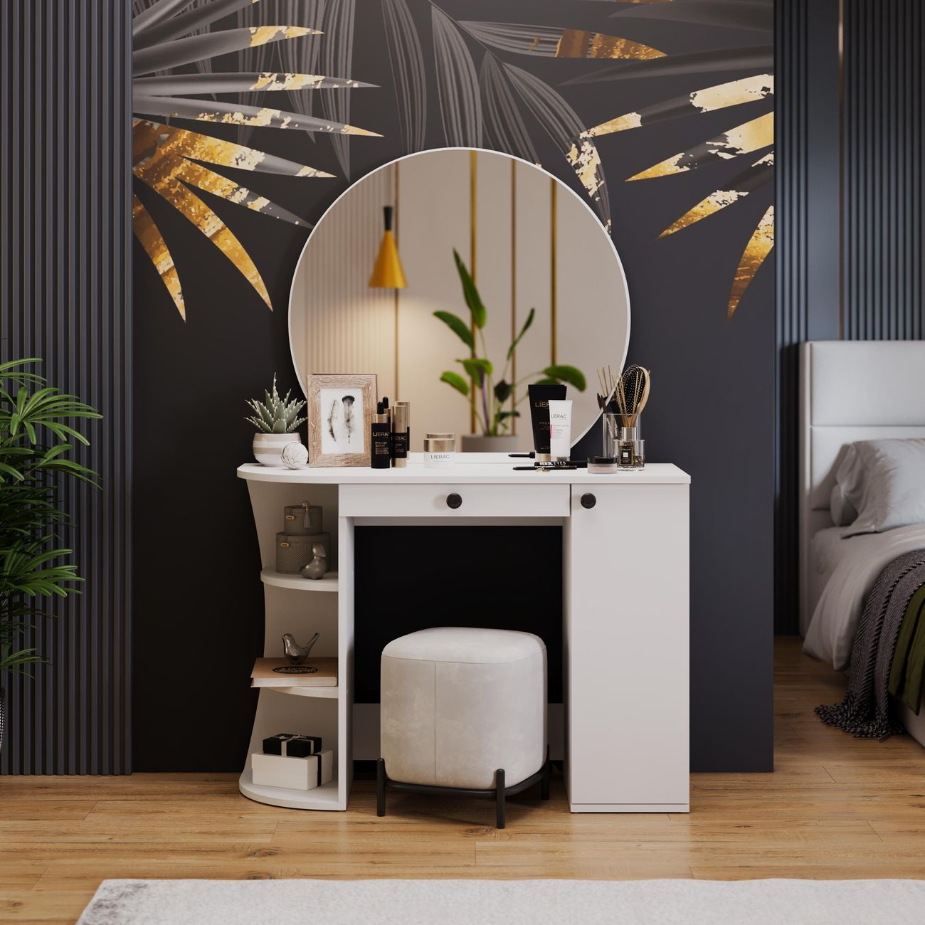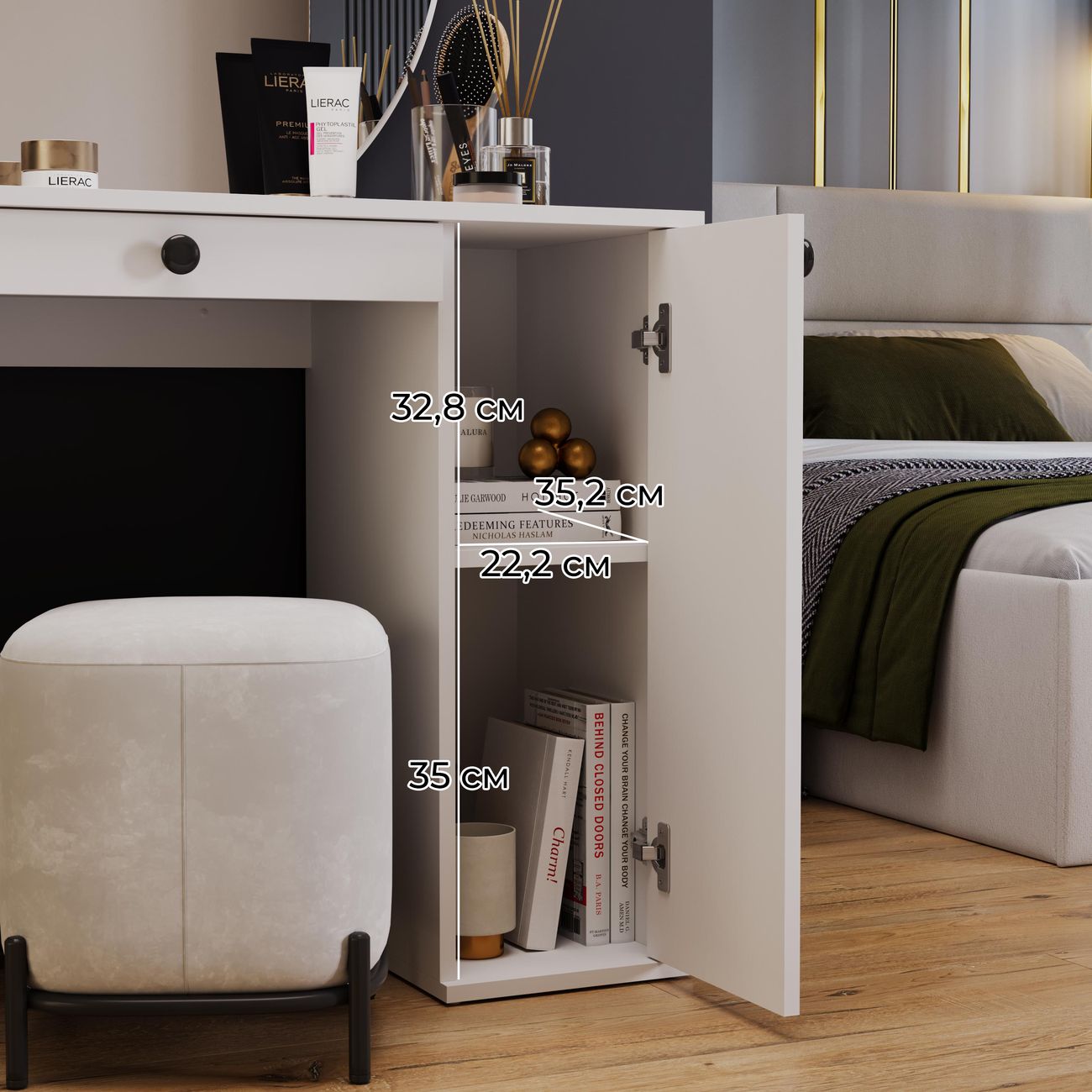 Белый туалетный стол Соло - идеальное место для проведения ежедневных процедур, нанесения макияжа, которое впишется в любой современный интерьер. Классический и минималистичный дизайн, сбалансированная конструкция, доступная цена. Дамский столик предназначен для размещения на нем косметики, парфюмерии, украшения и привести себя в порядок перед зеркалом. Материалы Модель оборудована удобной столешницей, выдвижным ящиком для защиты ваших косметических средств от пыли и прямых солнечных лучей, дополнительных полочек и ящик, круглым зеркалом, которое придает изюминку в дизайне столика. Выдвижной ящик оснащен качественной фурнитурой - шариковые направляющие полного выдвижения. Качественные материалы делают столик для макияжа износостойким, способным прослужить многие годы - используется экологически безопасный ЛДСП - 16 мм. Благодаря трюмо ежедневные процедуры и нанесение макияжа станет комфортнее, удобнее, практичнее и быстрее. Дополнительная информация Поставляется в разобранном виде. Все технические отверстия сделаны на производстве, фурнитура для сборки и инструкция идет в комплекте, также инструкцию Вы можете найти в карточке товара. Прежде чем приступить к сборке, необходимо убедиться в качестве, количестве и соответствии всех деталей. Если таковые выявлены, незамедлительно свяжитесь с площадкой и продавцом, для разрешения вопроса, не приступая к сбору изделия. Товар после сборки возврату и обмену не подлежит.